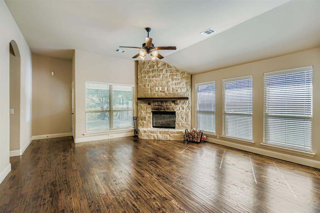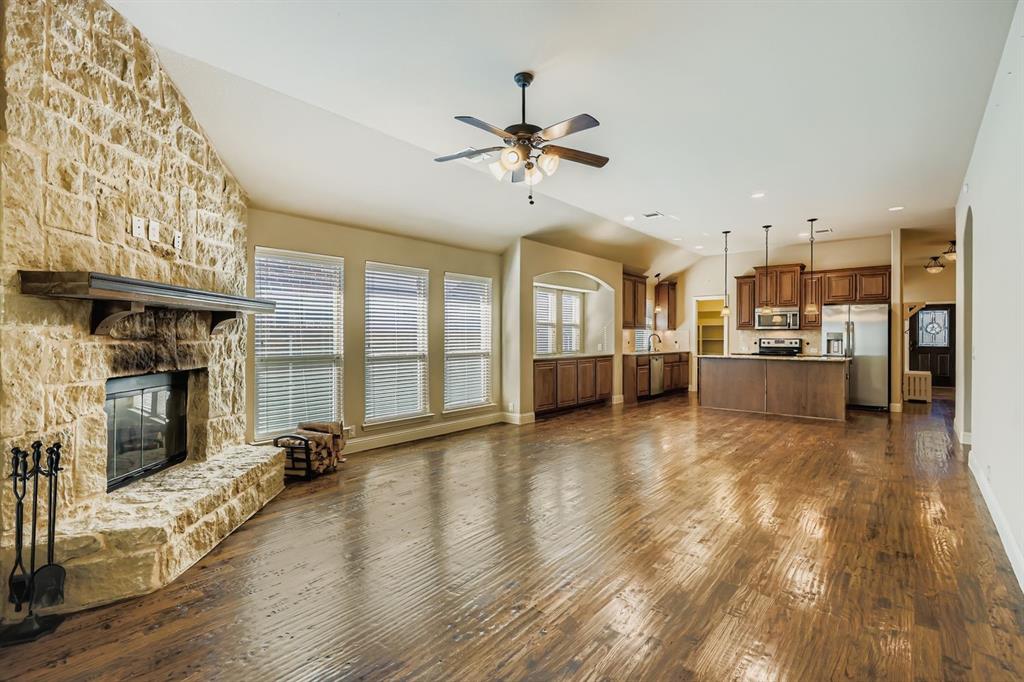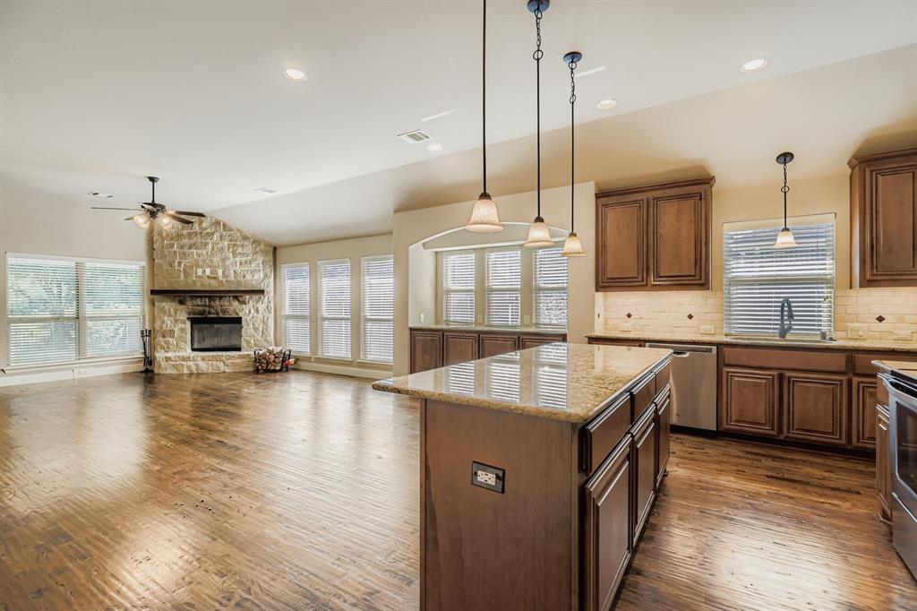 Welcome to this beautiful home in Cross Oak Ranch with a backyard that opens to a peaceful greenbelt. This open floor plan is perfect for family living with hardwood floors, high ceilings, and no carpet. The kitchen shines with granite counters, stainless steel appliances, and a large island, all flowing into the bright breakfast area and spacious living room with a stunning stone fireplace.