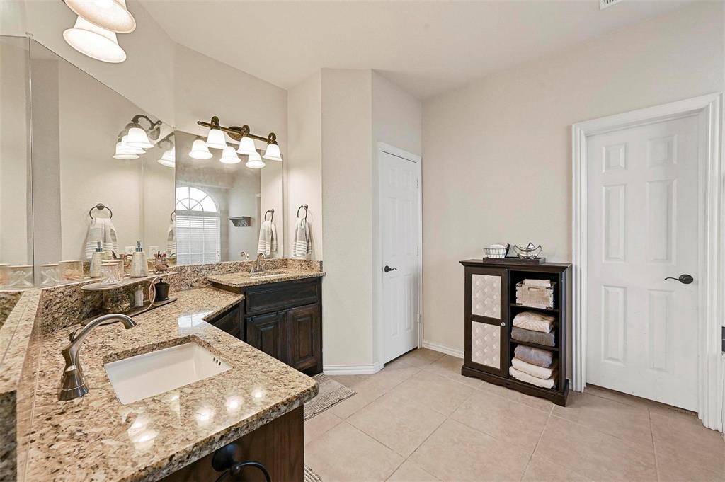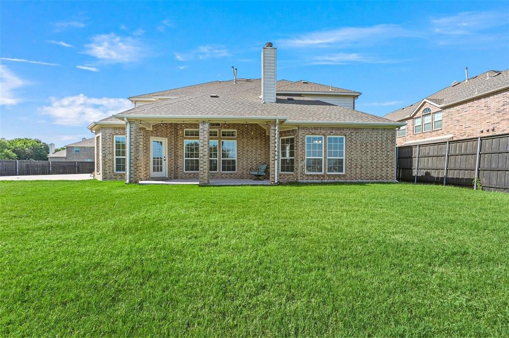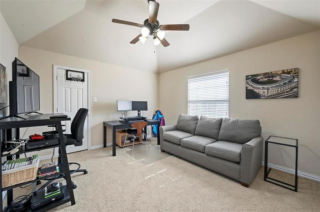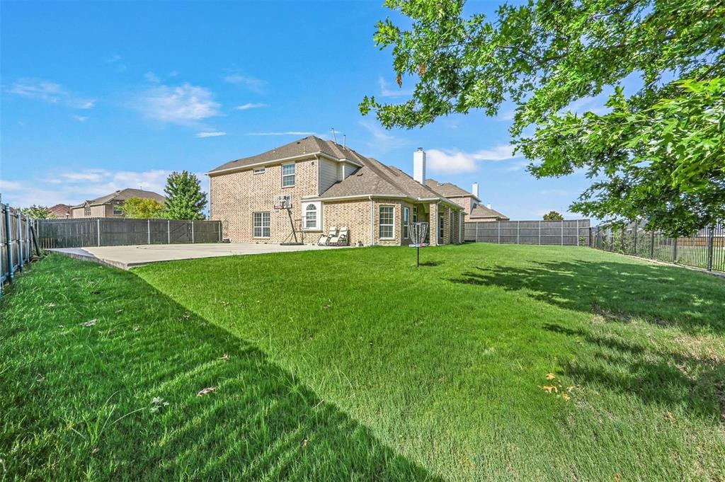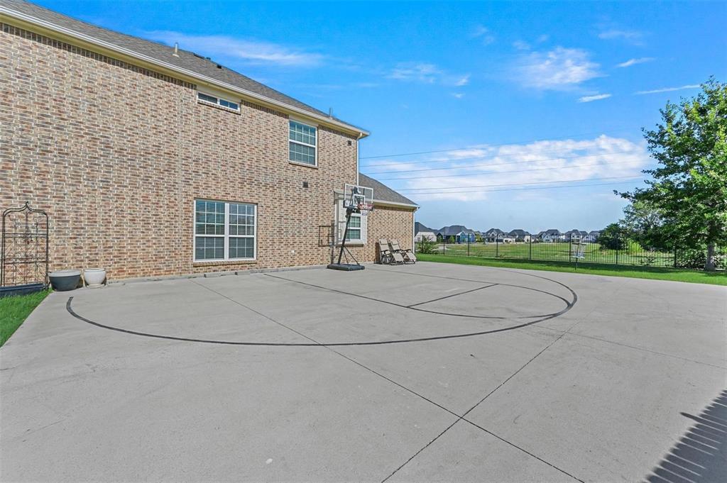Welcome to this impressive North-facing residence in the desirable Sorano community, proudly served by Frisco ISD. Set on an oversized lot backing to serene greenery, this 6-bedroom, 4-bath home with a media room combines versatile living spaces with refined style. The layout is thoughtfully designed for both daily comfort and effortless entertaining. A welcoming foyer opens to a formal living and dining area, complemented by a flexible home office. With its closet and adjacent full bath, the office can easily double as a sixth bedroom. The spacious family room centers around a stone fireplace with hearth, creating a cozy gathering place. The gourmet kitchen will delight any chef, offering a large island, granite countertops, a gas cooktop, stainless steel appliances—including refrigerator—plus abundant cabinetry and a walk-in pantry. The first-floor primary suite is a private retreat, featuring a spa-like bath with dual vanities, soaking tub, separate shower, and an expansive walk-in closet. Upstairs, a curved staircase leads to an open loft area ideal for study or play. Two bedrooms with a full bath occupy one side, while the opposite wing offers two additional bedrooms connected by a shared bath. The media room is ready for movie nights, complete with surround sound wiring, custom cabinetry, sink, and mini-fridge. Outdoor living shines with a covered patio overlooking a city park and a full-size basketball court—perfect for recreation and gatherings. Plenty of room to build a pool or outdoor kitchen area. Blending space, sophistication, and functionality, this home is truly exceptional. New Carpet in Office and Master Bedroom. Furniture has since been removed minus a few items.