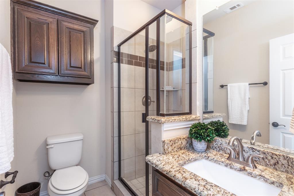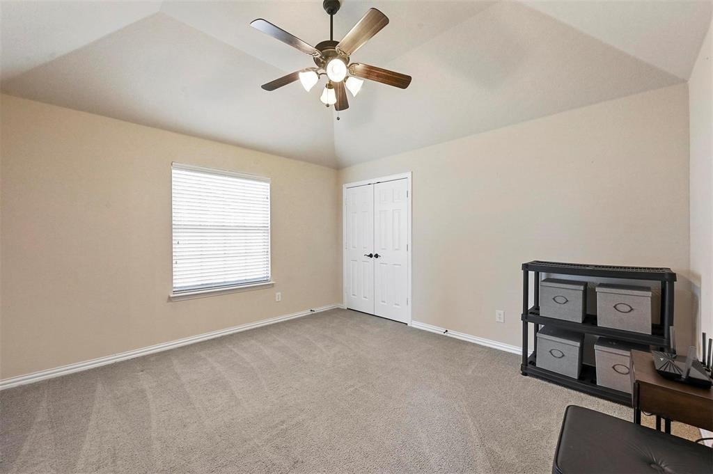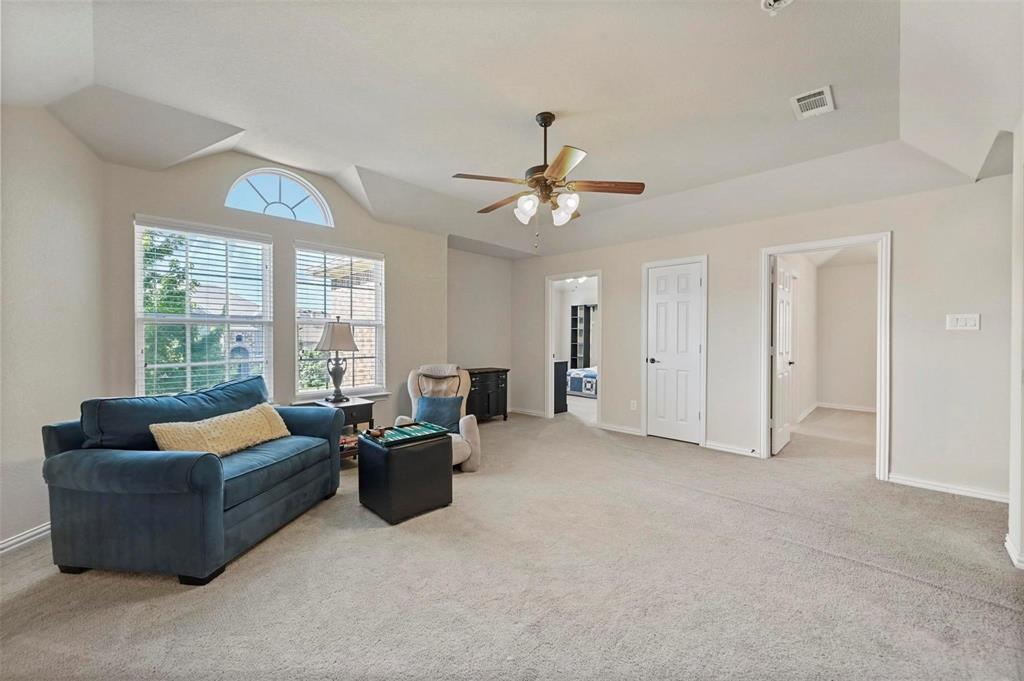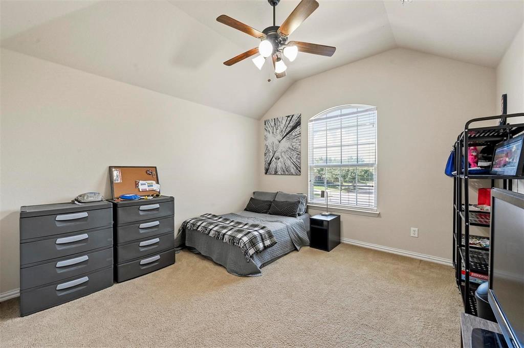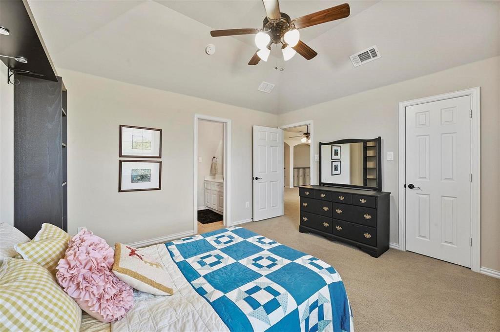 Welcome to this impressive North-facing residence in the desirable Sorano community, proudly served by Frisco ISD. Set on an oversized lot backing to serene greenery, this 6-bedroom, 4-bath home with a media room combines versatile living spaces with refined style. The layout is thoughtfully designed for both daily comfort and effortless entertaining. A welcoming foyer opens to a formal living and dining area, complemented by a flexible home office. With its closet and adjacent full bath, the office can easily double as a sixth bedroom. The spacious family room centers around a stone fireplace with hearth, creating a cozy gathering place. The gourmet kitchen will delight any chef, offering a large island, granite countertops, a gas cooktop, stainless steel appliances—including refrigerator—plus abundant cabinetry and a walk-in pantry. The first-floor primary suite is a private retreat, featuring a spa-like bath with dual vanities, soaking tub, separate shower, and an expansive walk-in closet. Upstairs, a curved staircase leads to an open loft area ideal for study or play. Two bedrooms with a full bath occupy one side, while the opposite wing offers two additional bedrooms connected by a shared bath. The media room is ready for movie nights, complete with surround sound wiring, custom cabinetry, sink, and mini-fridge. Outdoor living shines with a covered patio overlooking a city park and a full-size basketball court—perfect for recreation and gatherings. Plenty of room to build a pool or outdoor kitchen area. Blending space, sophistication, and functionality, this home is truly exceptional. New Carpet in Office and Master Bedroom. Furniture has since been removed minus a few items.
