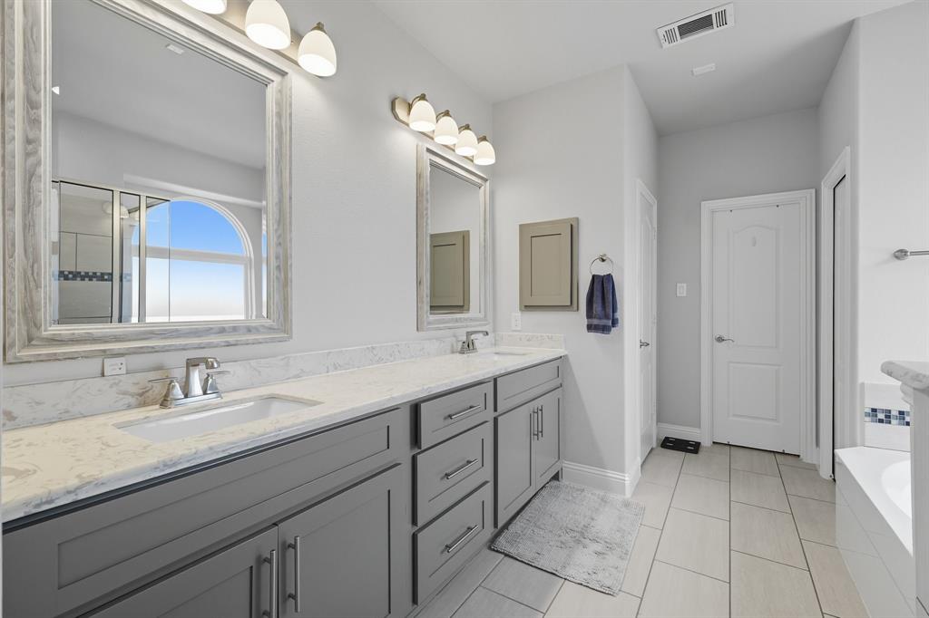 The well-planned layout includes a Jack and Jill bathroom between two secondary bedrooms, offering both convenience and privacy. The luxurious primary suite features a spa-inspired en-suite bath with dual vanities, soaking tub, walk-in shower, and generous closet space with direct access to pool and patio out back. Step outside to your own backyard oasis—complete with a covered patio, outdoor kitchen, and pool—all surrounded by mature trees and greenbelt views. With no rear neighbors, you'll enjoy peaceful evenings and private entertaining.