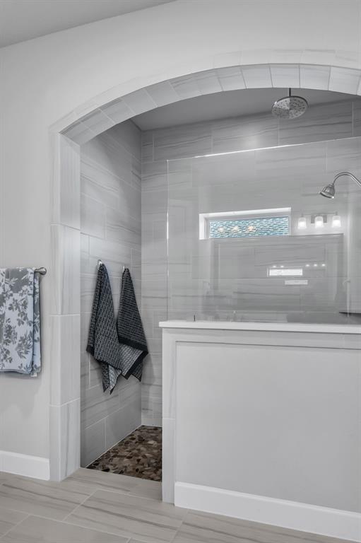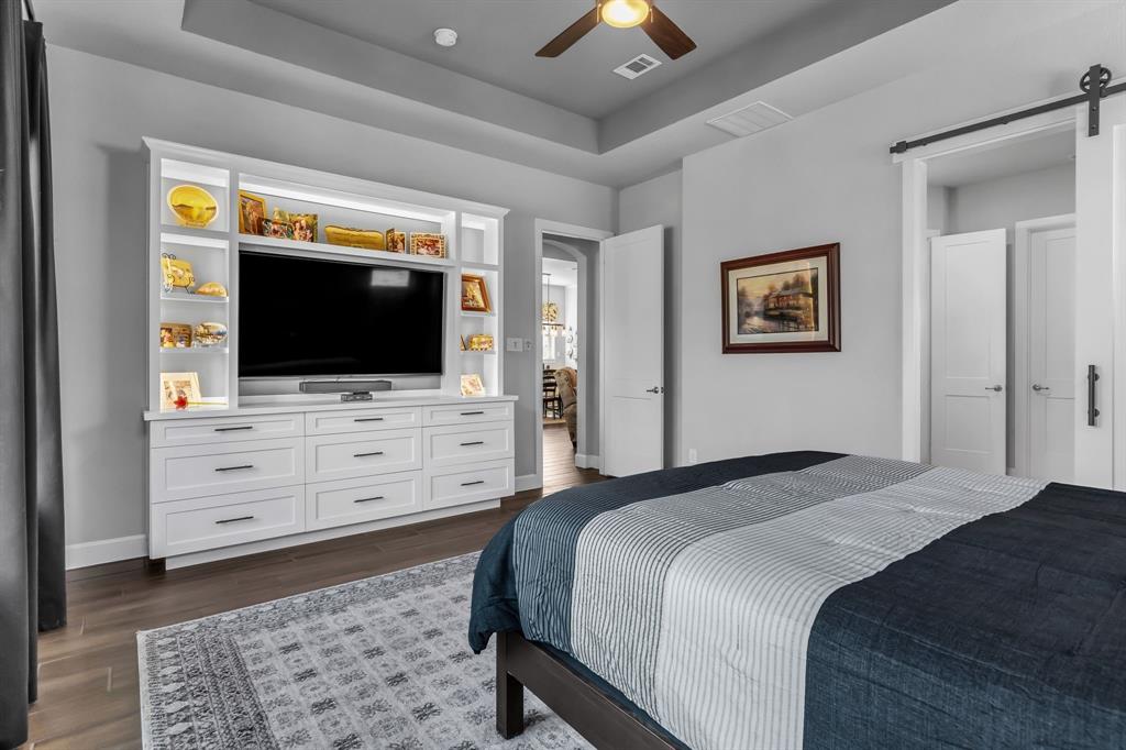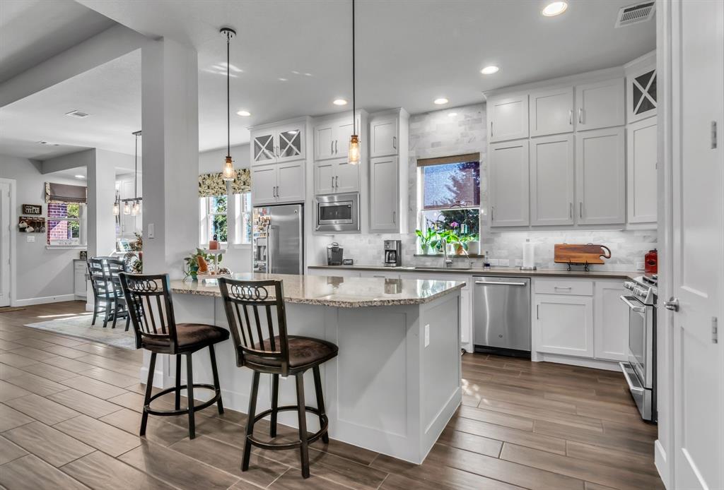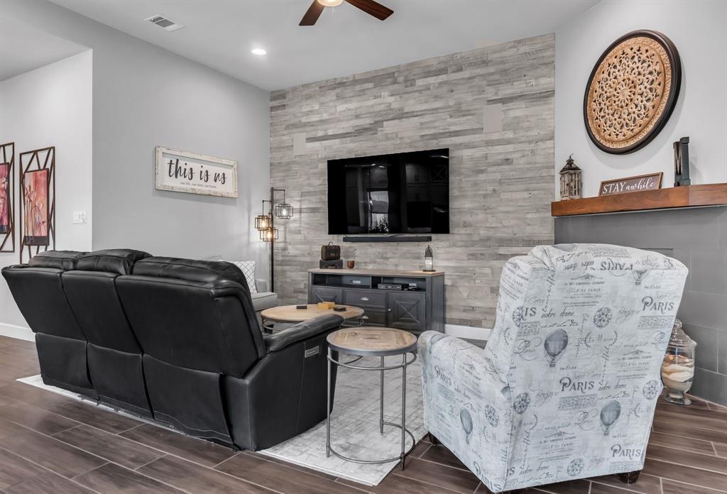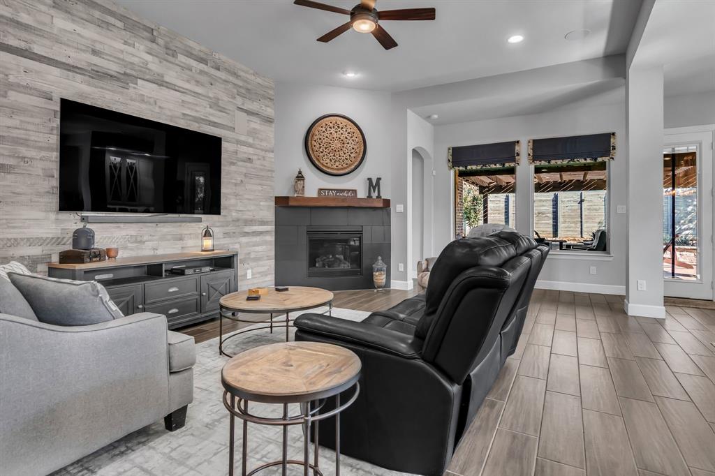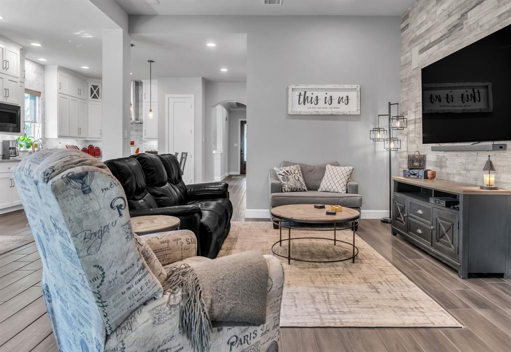 Step inside to an inviting open floorplan where cooking, dining, and living come together seamlessly in the spacious great room. The chef’s kitchen features a vast island with seating, double-stacked cabinets reaching the ceiling, a gas range, pantry, and abundant storage. A convenient dry bar adds function and style. The kitchen flows effortlessly into the living room, highlighted by a cozy gas fireplace and a striking wood accent wall, perfect for relaxing or entertaining.