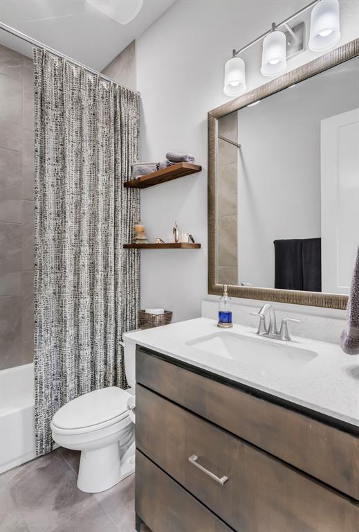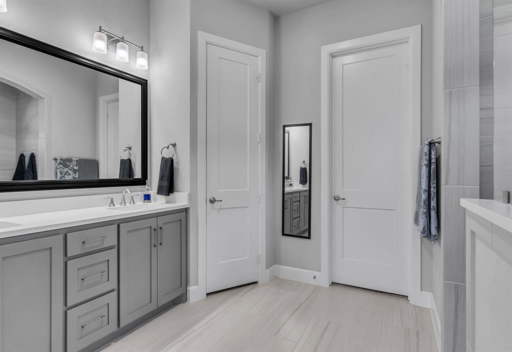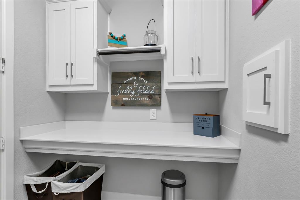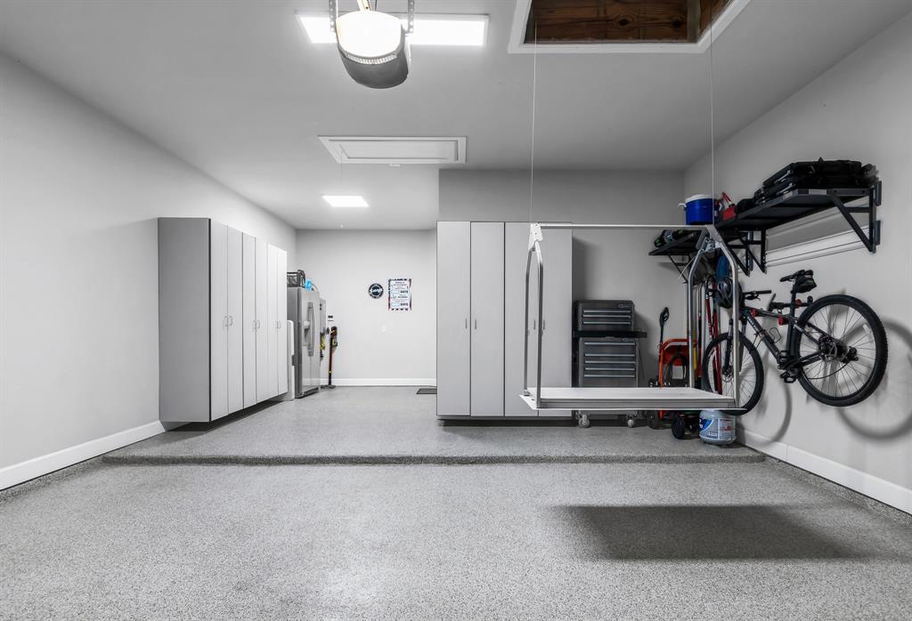 The primary suite is a private retreat, complete with custom built-ins with accent lighting and serene views of the backyard. The ensuite bath offers dual sinks, an oversized walk-in shower, and a generous walk-in closet. Two additional bedrooms share a full bathroom, while a dedicated utility room provides a built-in folding station and extra storage. The epoxy-coated garage is well-equipped with excellent storage solutions and a versa lift system for easy attic access.