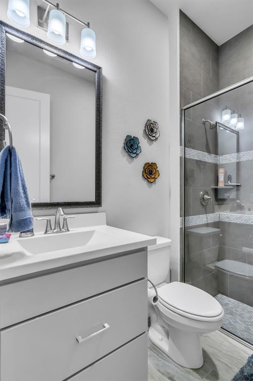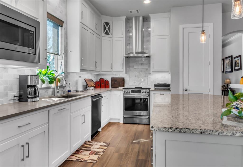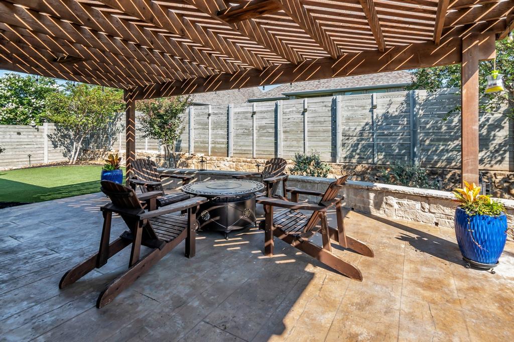 Step outside to enjoy the impressive outdoor living space, featuring a covered patio with wood-stamped concrete, stone built-in counters, and accent walls. The low-maintenance backyard includes lush landscaping and durable artificial turf, creating a private oasis for entertaining or relaxing year-round.