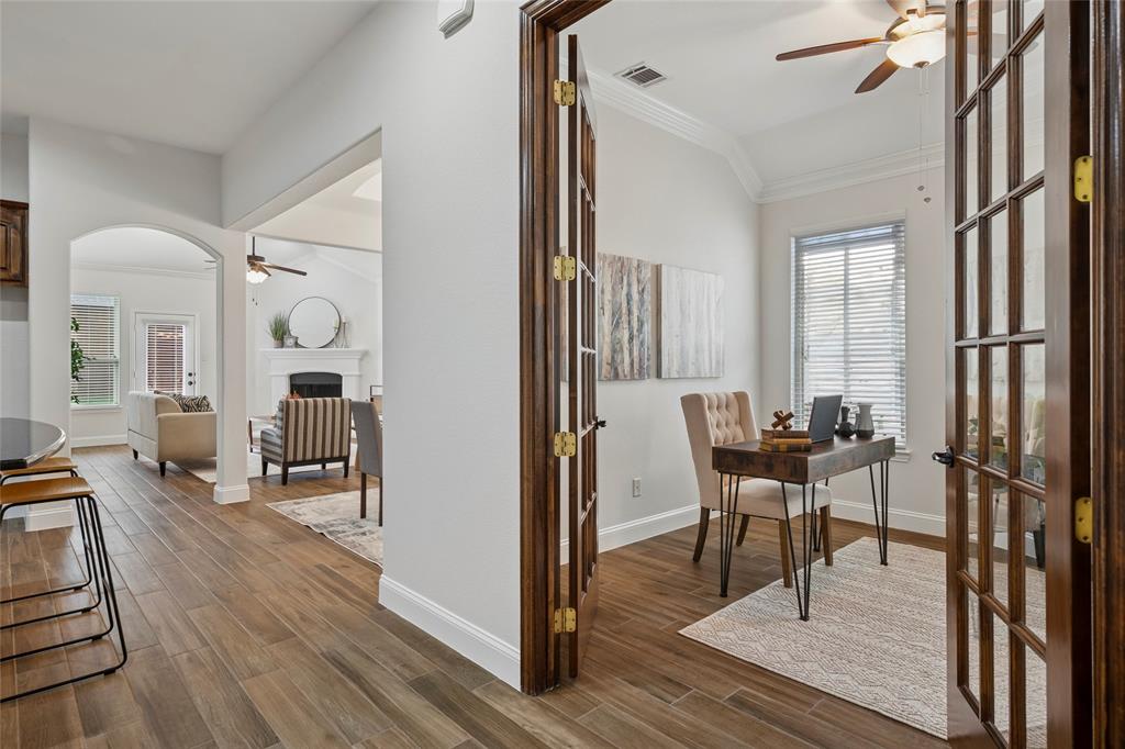 The large gourmet kitchen features elegant granite counters, gas cook top, abundant cabinetry and counter space, walk in pantry, filtered water at the sink and a breakfast bar perfect for informal meals. The large dining area with a wall of bay windows is ideal for hosting or perfect for informal or formal dining! A nice sized private study with glass French doors and cabinetry is ideal for media equipment or home office organization - perfect for working at home! The nice sized family room is open to the kitchen and dining room areas. The split primary suite is a peaceful escape with views to the backyard. The spa like primary bath has a garden tub, separate shower, dual sinks and a huge walk in closet. Two additional good-sized bedrooms in the front of the home share a full sized bath. Enjoy the outdoors on the enlarged patio perfect for relaxing or entertaining. Thoughtful updates include gorgeous porcelain tile floors throughout (no carpet). neutral paint, baseboards, lighting, expanded back porch and water heater. Nestled on a quiet interior lot, yet close to lakeside trails, top rated school, shopping and dining this location is hard to beat. This home offers the lifestyle you've been searching for! Opportunities like this don't come often, come and see it before it's gone!