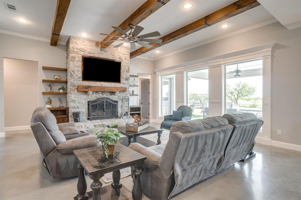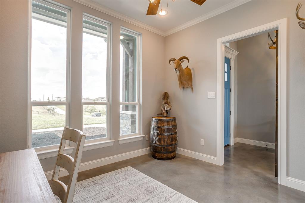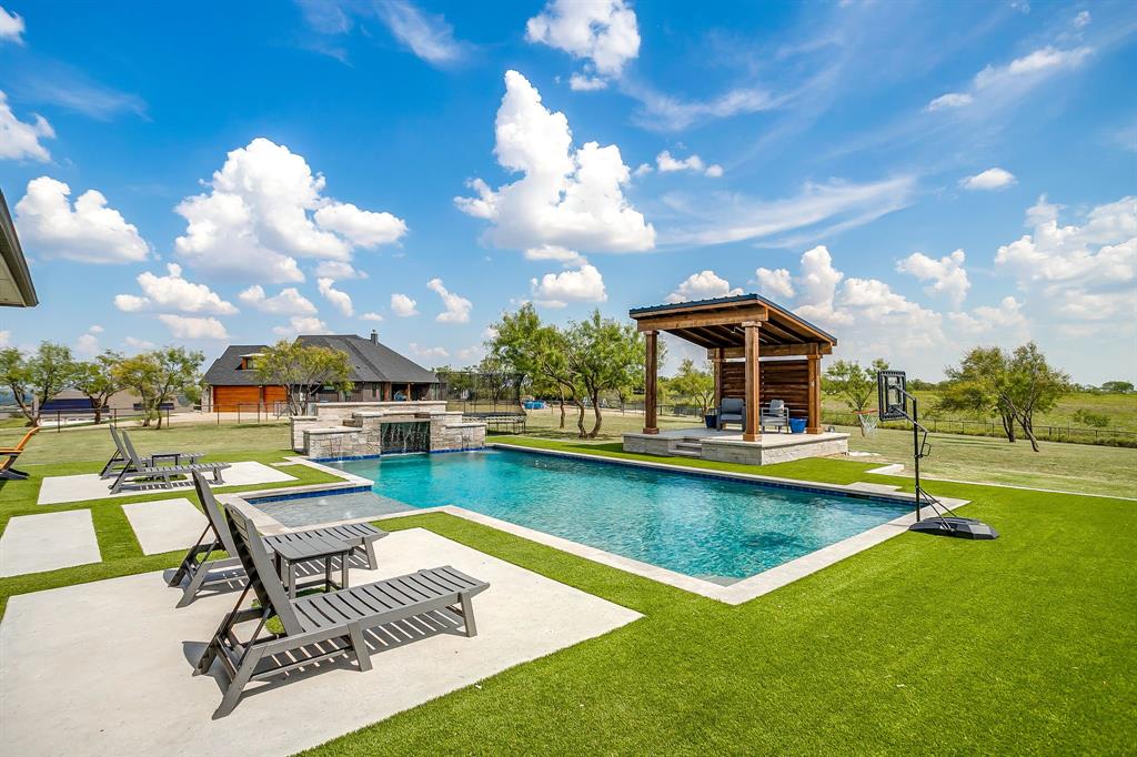 Nestled on 2.05 fully fenced acres, NO HOA, NO CITY TAXES located in Aledo ISD! This beautiful custom built home offers an abundance of natural light, upgrades through out and a perfectly appointed layout. Stunning stained concrete floors greet you as you enter and flow through out the entire downstairs living. 4 bedrooms, 3 full baths, one half bath, dedicated office and eat in kitchen. Large down stairs living with floor to ceiling windows, wooded accent beams, rock wood burning fireplace with gas starter and built ins. This space Flows nicely into the chefs kitchen with granite counter tops, custom backsplash, double oven, gas cook top, farm sink and eat in dining area. Spacious secondary bedrooms. Oversized primary with en suite bath, two vanities, walk through shower, soaking tub and large walk in closet. Tucked away in the closet is a 10X11 hidden safe room. This perk allows for safe keeping's or staying safe in those Texas sized storms. Upstairs you will find a good sized game room and half bath to round off this homes living spaces. Step outback for the pride and joy of this property. Your very own entertainment get away. Complete with extended back patio, wired surround sound, custom pool with filter water system, water fall and tanning ledge. Not to mention a seating pergola with electric just off the back. Best part is no grass clippings in the pool with your turf play area surround. Separately fenced large dog run and 3 car extended length garage, with 1,200 lb electric wench are just a few of the additional perks that set this home apart. Come take a tour today. This home is truly a must see.