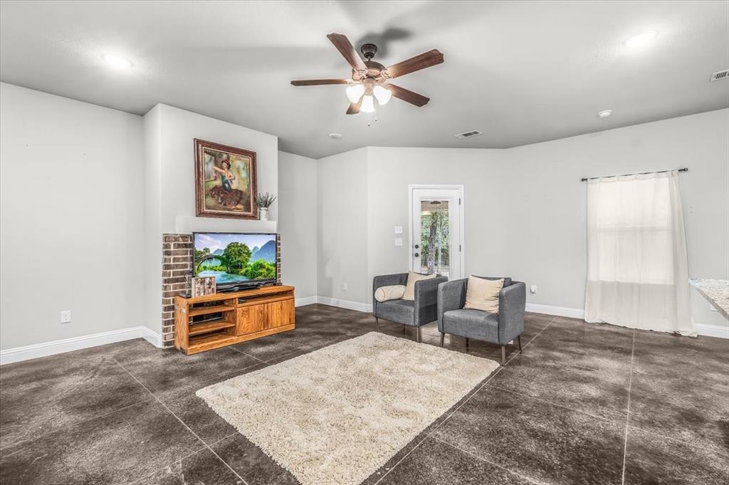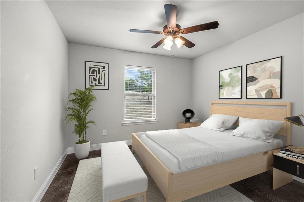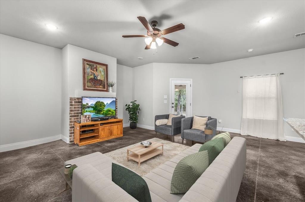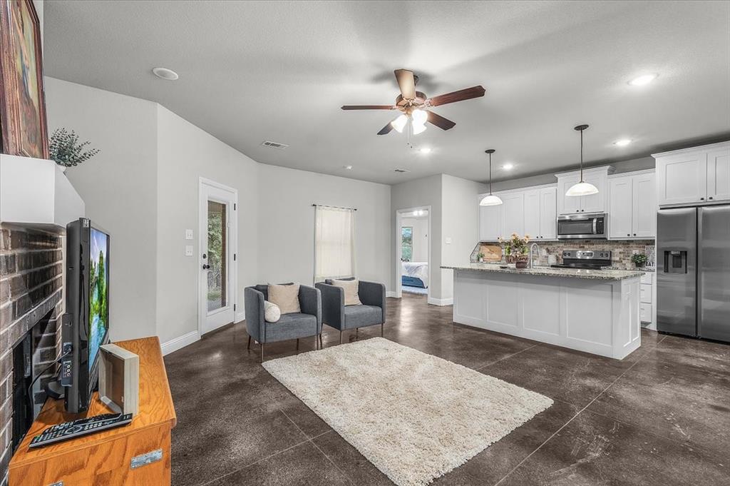 Welcome to your private two-acre retreat—an open-concept, move-in-ready home with a thoughtful split floorplan that sets the spacious primary suite away from the secondary bedrooms. Well-placed, light-catching windows in the living room and primary offer an abundance of natural light and beautiful views of the tree-studded backyard. Gorgeous stained concrete floors add to the charm and make day-to-day cleaning a breeze. Step outside to the oversized covered patio to watch birds and deer from afar and soak in the calming country scenery. With a balanced mix of mature trees and cleared, usable space, there’s room to add a pool, build a workshop, or both—plus plenty left for play, gardening, or storage. Life is easy here: no HOA, no city taxes, and a private water well (no water bill)-all located outside of city limits. Despite the peaceful setting, you’re less than 20 minutes from everyday essentials—including H-E-B, the new Costco—and a wide variety of dining and shopping options. If you’re seeking space, serenity, and a beautifully kept home that’s truly move-in ready, this one checks all the boxes! Some rooms have been virtually staged.