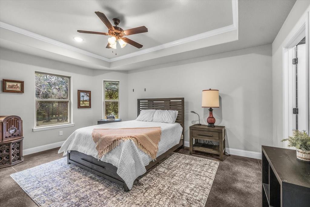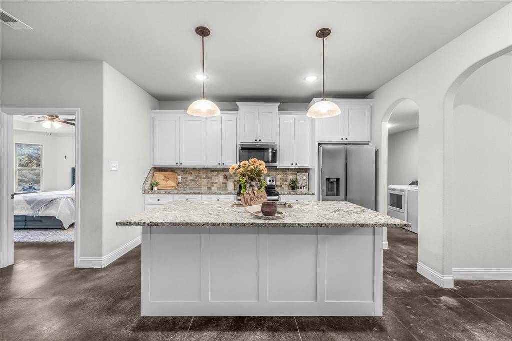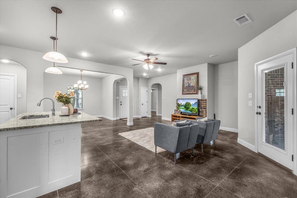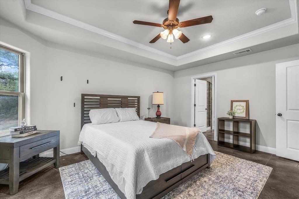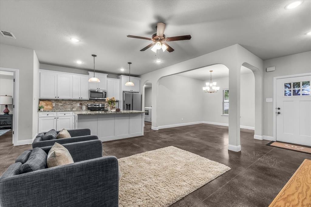 Welcome to your private two-acre retreat—an open-concept, move-in-ready home with a thoughtful split floorplan that sets the spacious primary suite away from the secondary bedrooms. Well-placed, light-catching windows in the living room and primary offer an abundance of natural light and beautiful views of the tree-studded backyard. Gorgeous stained concrete floors add to the charm and make day-to-day cleaning a breeze. Step outside to the oversized covered patio to watch birds and deer from afar and soak in the calming country scenery. With a balanced mix of mature trees and cleared, usable space, there’s room to add a pool, build a workshop, or both—plus plenty left for play, gardening, or storage. Life is easy here: no HOA, no city taxes, and a private water well (no water bill)-all located outside of city limits. Despite the peaceful setting, you’re less than 20 minutes from everyday essentials—including H-E-B, the new Costco—and a wide variety of dining and shopping options. If you’re seeking space, serenity, and a beautifully kept home that’s truly move-in ready, this one checks all the boxes! Some rooms have been virtually staged.