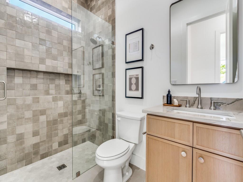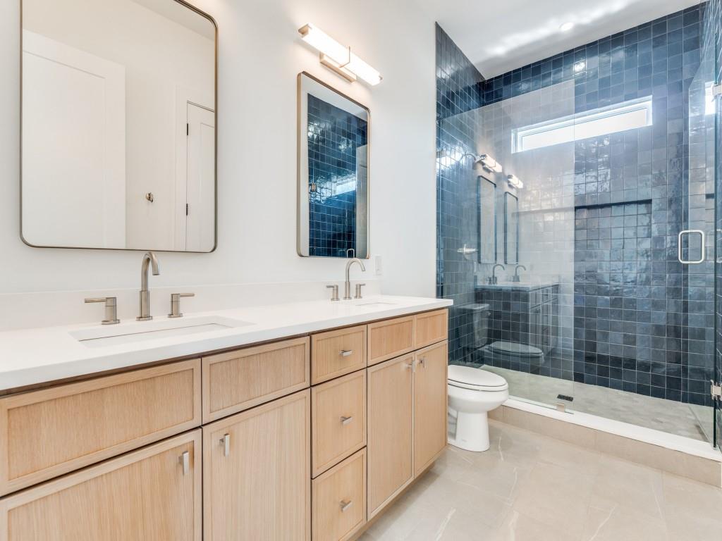 Crafted by renowned builder Kingdom Builder Homes, this residence showcases striking contemporary design, with white oak hardwoods, a waterfall-edge island, soaring ceilings, and expansive walls of glass that flood the space with natural light. Custom finishes, sleek metal railings, and top-tier appliances speak to the home’s elevated quality and attention to detail.