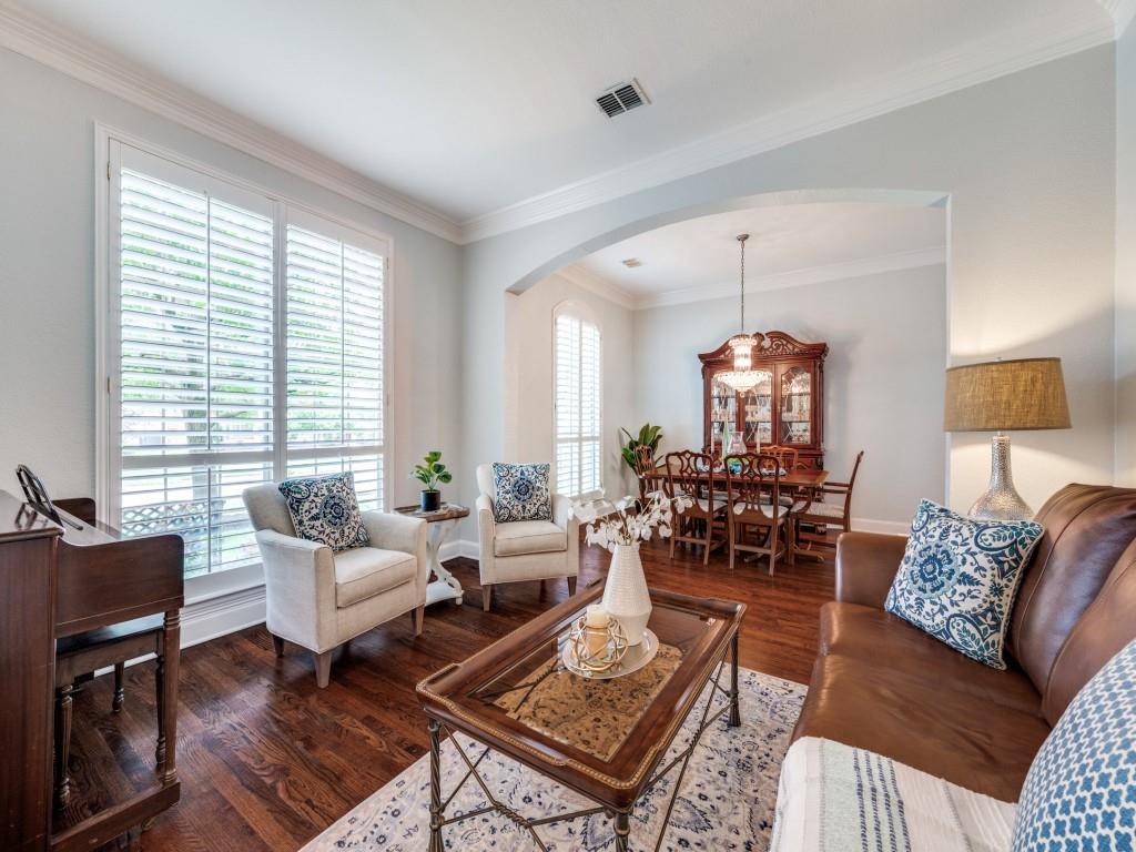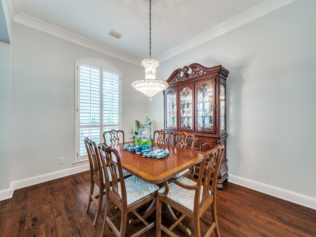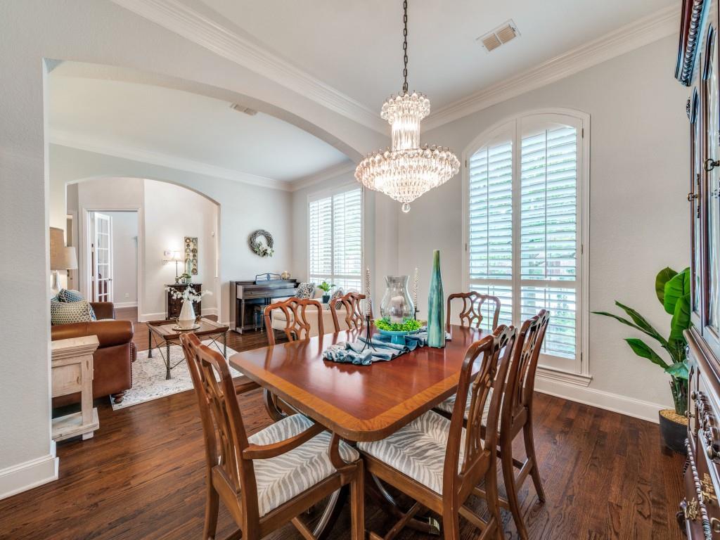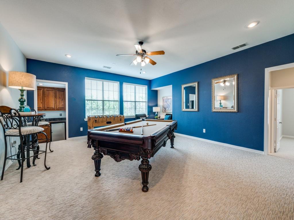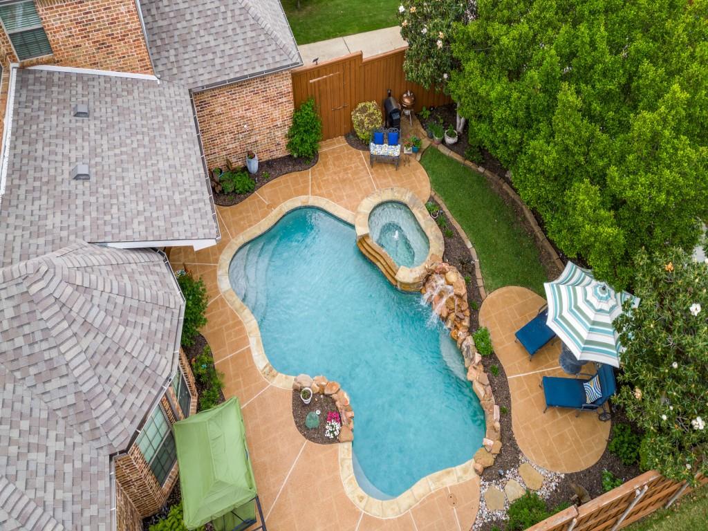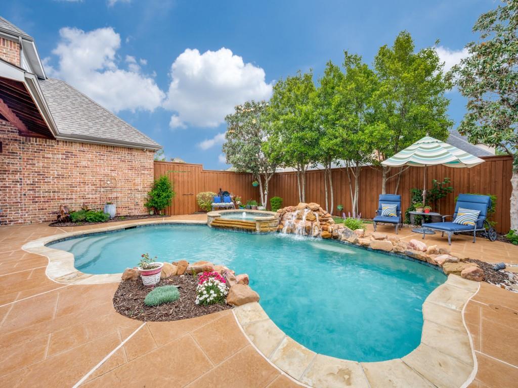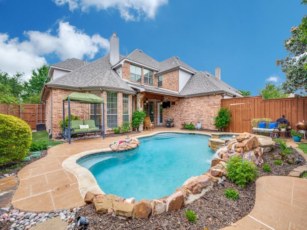 Beautifully appointed Highland Home built home located in popular Eldorado Fairways. Back yard oasis with Riverbend pool and a covered patio. Gorgeous front and back landscaping. Excellent floor plan with master suite, guest bedroom and office downstairs; 3 bedrooms, game room and media upstairs. Features include nail down hardwood floors, crown molding, plantation shutters, updated carpet and paint, double staircases, split master suite for privacy, oversized 2 car garage, covered patio, wet bar, 8 foot solid core doors, plus more. Luxurious master suite has a sitting area, separate vanities, granite counters, jetted tub, walk in closet plus more. Chef's kitchen has painted cabinets, an island, stainless steel appliances, gas cooking, granite countertops, a butler's pantry, and more. Expanded laundry room has a sink and built in cabinets. Convenient to 8 acre park, 2 playgrounds, a basketball court, and community pool. Easy access to hike and bike trail to Lake Lewisville area. Close to the North Dallas Tollway, PGA Headquarters, The Trails Golf Course, shops and restaurants. Wakeland High School zone. This home is meticulously maintained.