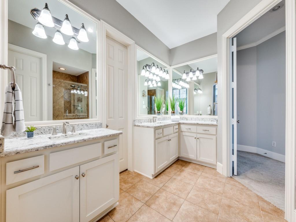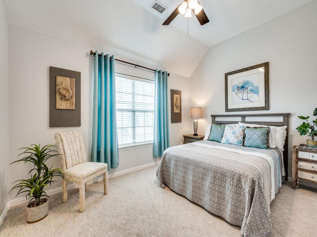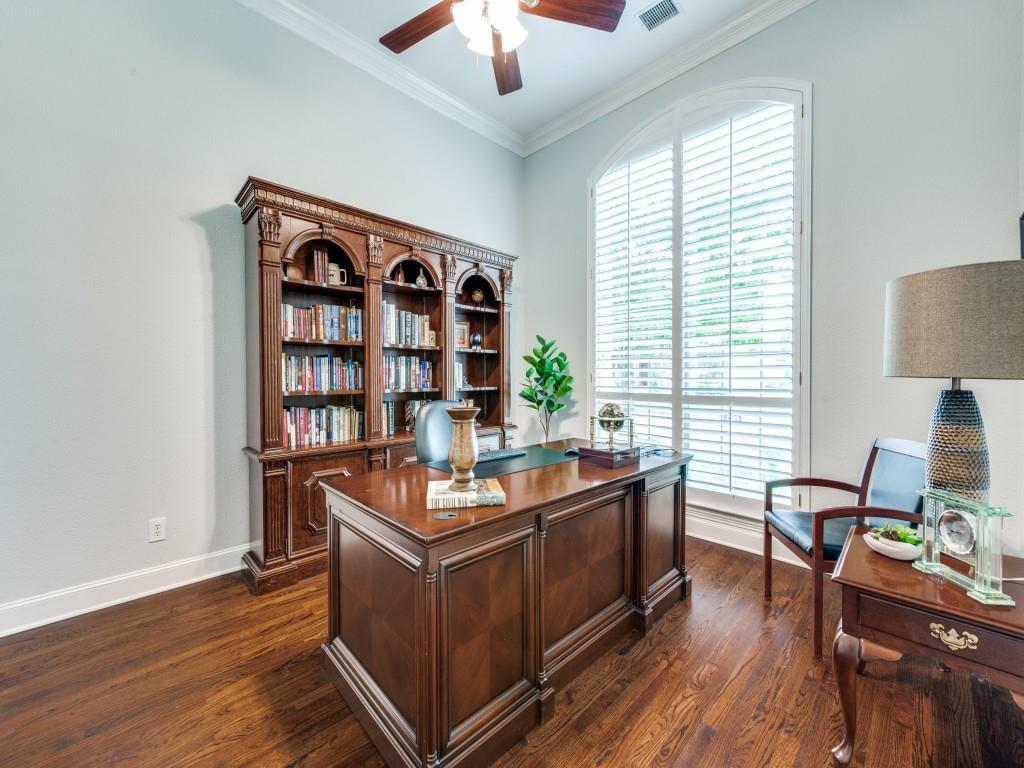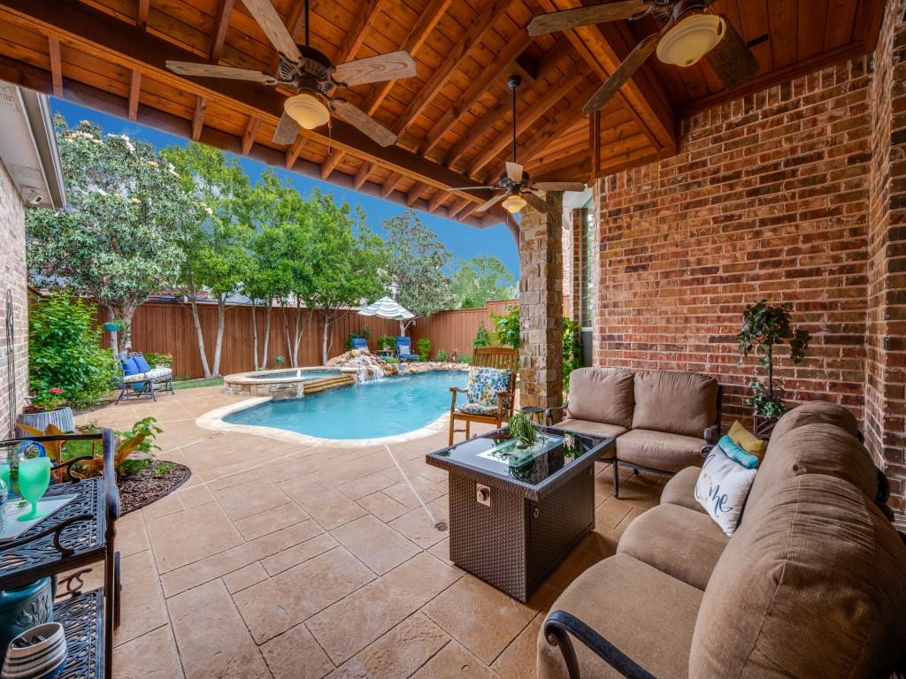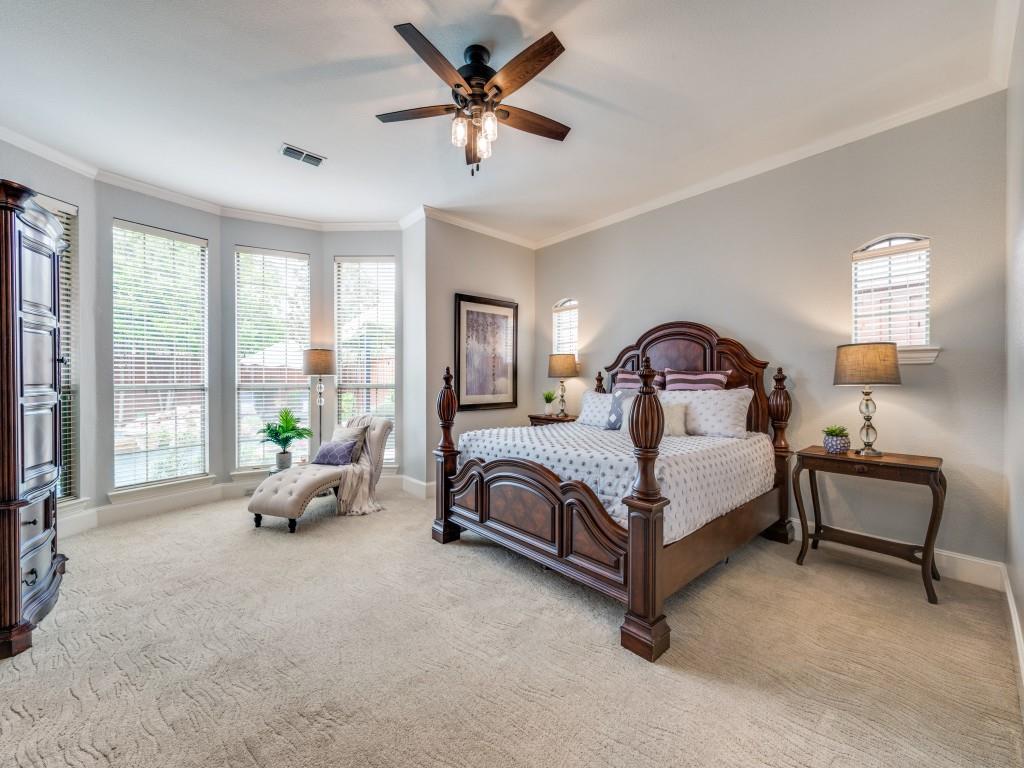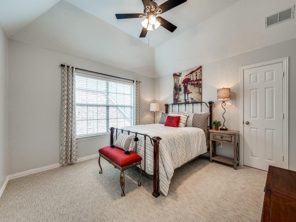 Beautifully appointed Highland Home built home located in popular Eldorado Fairways. Back yard oasis with Riverbend pool and a covered patio. Gorgeous front and back landscaping. Excellent floor plan with master suite, guest bedroom and office downstairs; 3 bedrooms, game room and media upstairs. Features include nail down hardwood floors, crown molding, plantation shutters, updated carpet and paint, double staircases, split master suite for privacy, oversized 2 car garage, covered patio, wet bar, 8 foot solid core doors, plus more. Luxurious master suite has a sitting area, separate vanities, granite counters, jetted tub, walk in closet plus more. Chef's kitchen has painted cabinets, an island, stainless steel appliances, gas cooking, granite countertops, a butler's pantry, and more. Expanded laundry room has a sink and built in cabinets. Convenient to 8 acre park, 2 playgrounds, a basketball court, and community pool. Easy access to hike and bike trail to Lake Lewisville area. Close to the North Dallas Tollway, PGA Headquarters, The Trails Golf Course, shops and restaurants. Wakeland High School zone. This home is meticulously maintained.