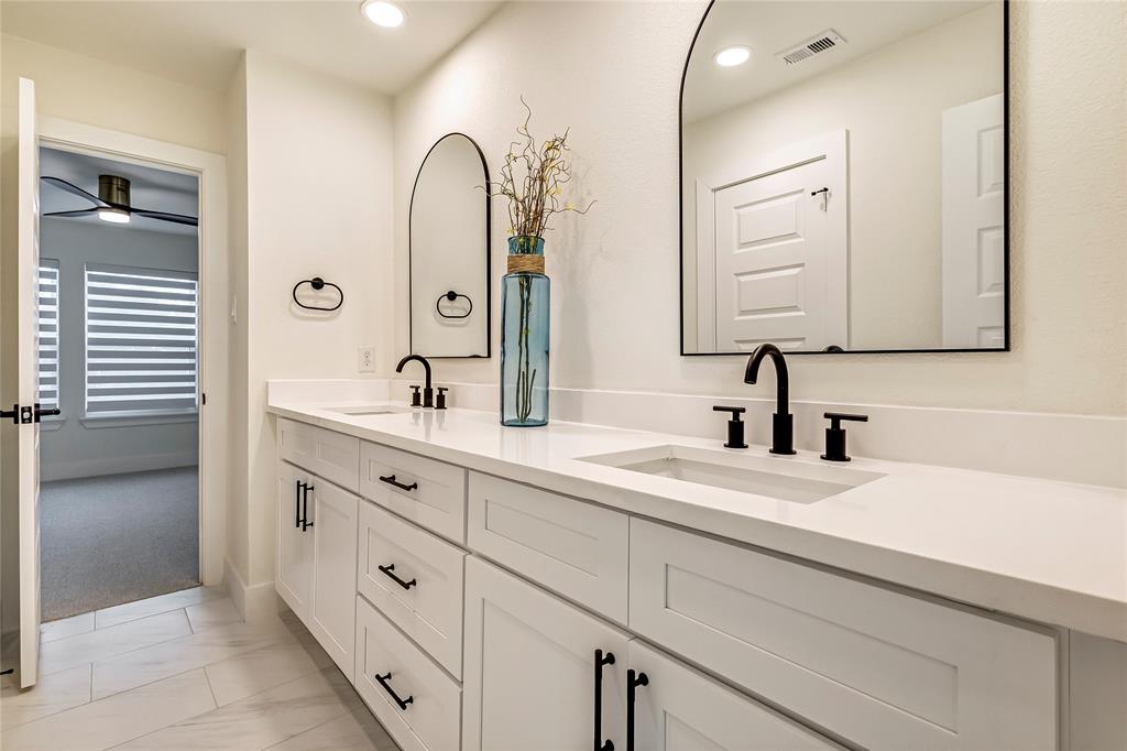 The primary suite, with a spa-inspired bathroom, is conveniently located on the first floor. Upstairs, four spacious bedrooms are complemented by two designer-updated Jack-and-Jill bathrooms, ensuring every room enjoys private and convenient access.