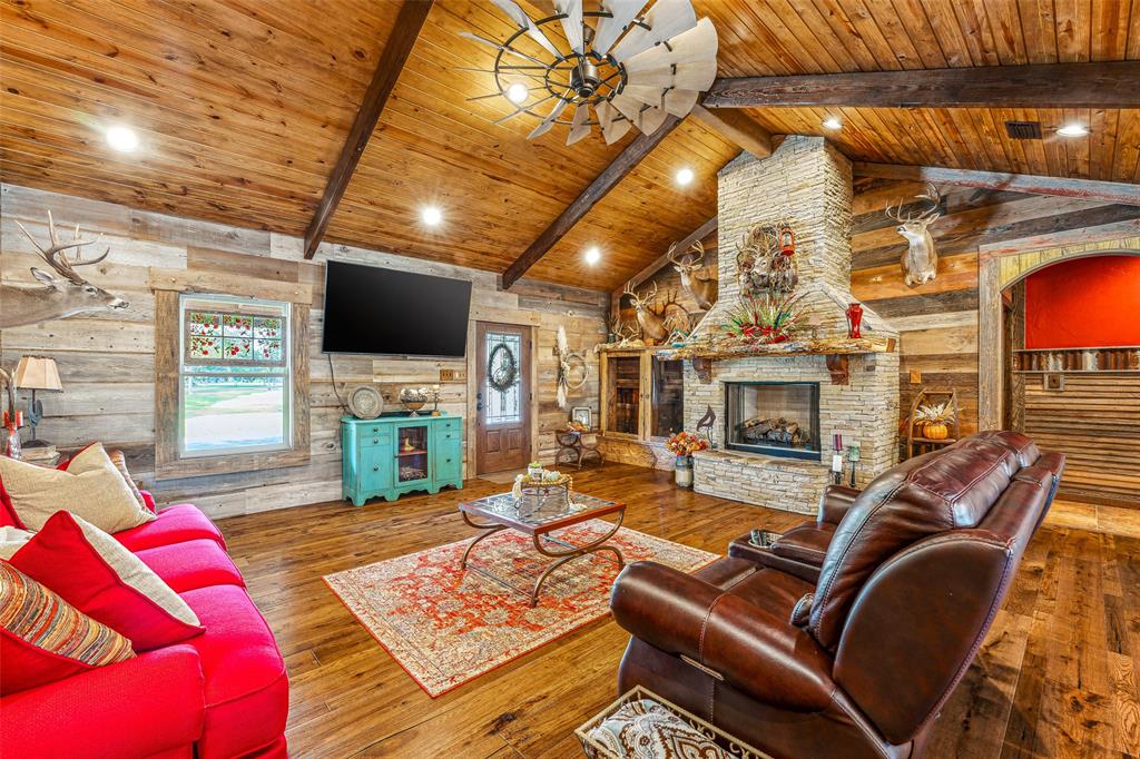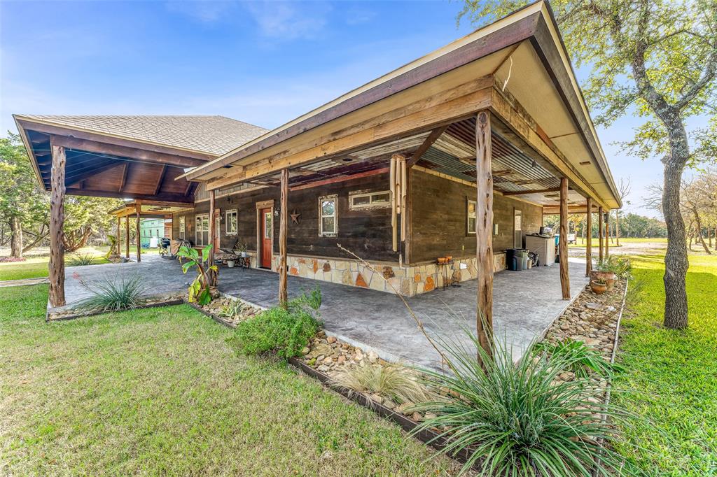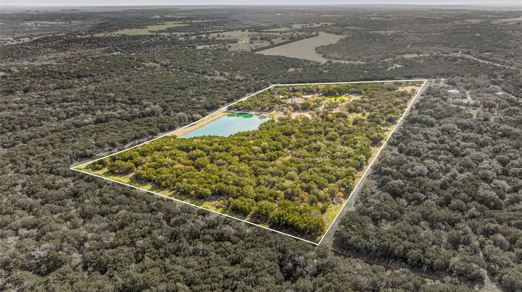 Beautiful custom home with private lake on 20 secluded acres that could also be repurposed as a short-term vacation rental or a special events venue. Property has dense tree cover that provides excellent wildlife habitat and is bordered on 2 sides by large, undeveloped ranches. The 1-acre lake has 20 ft depth and is stocked with multiple species of bait fish, plus crappie, black bass, and channel cat. All 4 sides of the property are cleared at the boundaries, and perimeter fencing exists on 3 sides. The 2,166 sqft home has an impressive 30x35 covered parking area at the entrance, as well as covered porches with lighting on the remaining 3 sides, all of which feature stamped, stained concrete. These porches create a dramatic outdoor living space with views of the beautifully landscaped yard with St. Augustine grass and walkway to the lake.