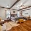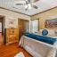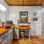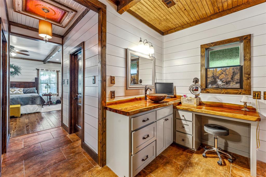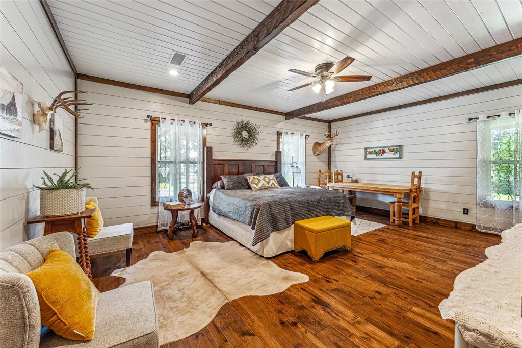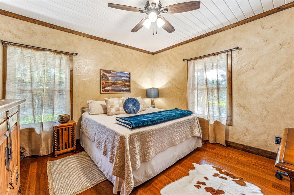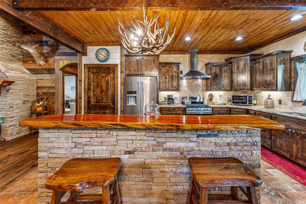 The home's entryway leads into a spacious living area with vaulted wood ceilings with exposed beams and a stacked-stone WB fireplace with insert. The open concept design also features a roomy kitchen and dining space with large windows overlooking the backyard and lake. The kitchen has granite countertops, propane oven-stove, and stainless appliances. It also has a large island with electricity, a granite prep space, and a custom cedar countertop on the dining space. The primary bedroom and bath have exposed wooden beams, wood floors, his-her walk-in closets, separate vanities with cedar countertops, and a large, tile shower. The home also incorporates energy efficient features such as Low-E windows and open cell foam insulation. Outbuildings include storage space with a roll-up door and room for parking, and it also houses the well water storage tank.