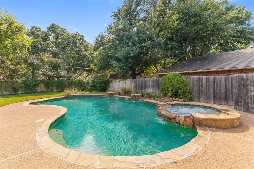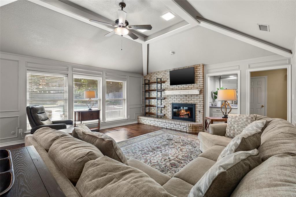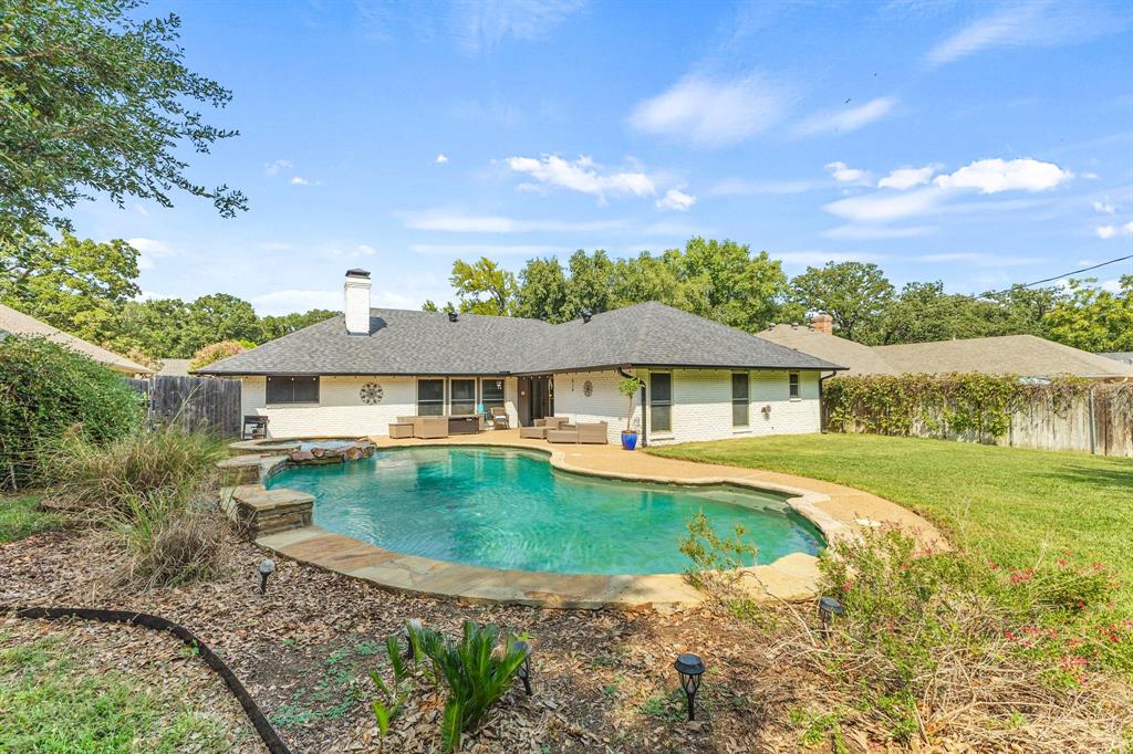 A Home to Fall in Love with. Located on an oversized tree lined cul de sac with great drive appeal. Exterior has been updated and painted white, recent roof, gutters, and garage door set the stage for lasting curb appeal. Step inside this beautifully updated 4 bedroom, 2 full and one half bathroom, 2 car garage where charm & modern upgrades come together to create the perfect home. Every upgrade whispers “peace of mind,” HVAC system, compressor, and ductwork replaced August 2025, guarantees year round comfort. Carpet replaced in June 2025. Beautiful wood flooring that invites you to relax, settle in while enjoying the gas log fireplace that has recently been serviced. The kitchen is equipped with updated dishwasher, sink, faucet, disposal and oven-microwave combo, making cooking a delight.. Oversized treed back yard features a private retreat, covered patio and an inviting pool with spa and offers a service contract, perfect for summer gatherings, and making memories that will last a lifetime.