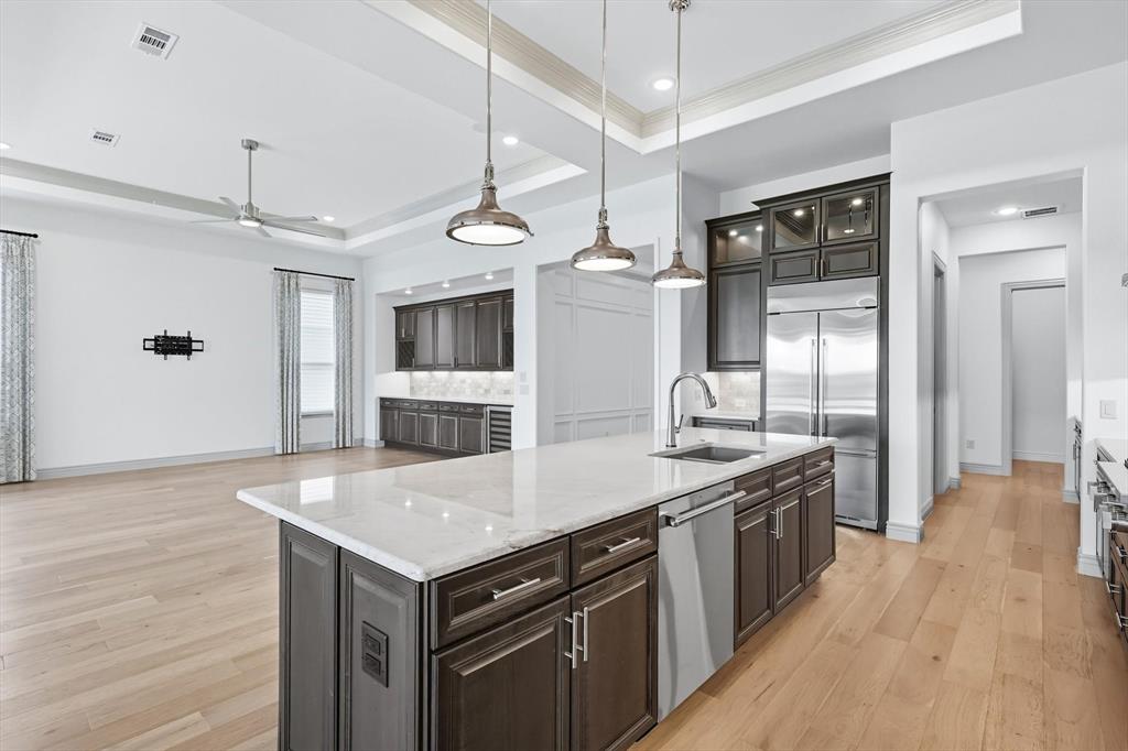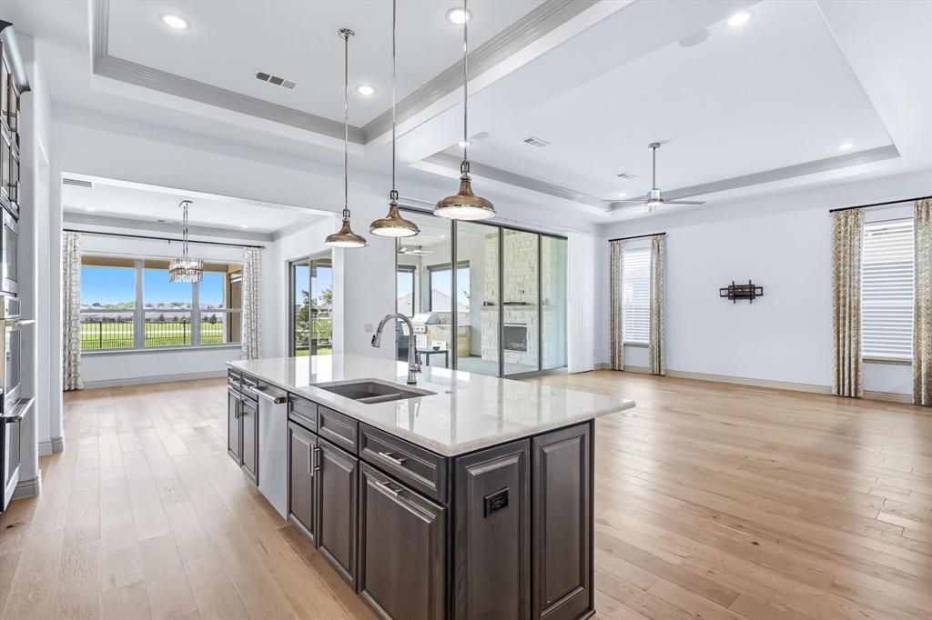 Exquisite Avalon home built in 2023! This 3,142 sq. ft. residence blends comfort, sophistication, & thoughtful design at every turn. Featuring 3 bedrooms, 3.5 baths, a large, private den, & expansive living areas, this home offers casual elegance, functionality, & comfort. Inside, you’ll find a bright, open layout with wood floors & high-end finishes throughout. The gourmet kitchen with Taj Mahal counter tops includes premium appliances & plenty of prep space—perfect for everyday meals or entertaining. Enjoy the extra convenience of a Butler’s pantry, large walk-in pantry, & two additional hall closets for abundant storage. The living area features built-in cabinetry with a wine refrigerator. Dining room has upper & lower cabinets for maximizing storage. A wall of sliders opens from the living room to the extended covered patio with a built-in Lynx grill, gas fireplace, remote screens, & a Big Ass® fan, creating a seamless indoor-outdoor living experience with a relaxing view of greenbelt & pond from the private backyard. The luxurious primary suite includes a custom closet system. Each guest suite features A private bath. The den is outfitted with a built-in desk, shelving, & cabinetry, making it an ideal home office or hobby space. The laundry room is a dream, with abundant cabinets, counters, sink, refrigerator, & storage options. Many custom touches of this home include built-in speakers in the living room, crown molding, ceiling fans, tankless water heater with circulating system, and much more. Oversized 3-car garage with epoxy floors, built-in workbench & custom cabinets & slat walls provides unmatched organization & functionality. This home is truly move-in ready & designed for both style & comfort -don’t miss the chance to experience it in person. Located in Robson Ranch, an exclusive 55+ resort-style community designed for active living, recreation & connection. * All information is deemed reliable but is not guaranteed & should be independently verified *