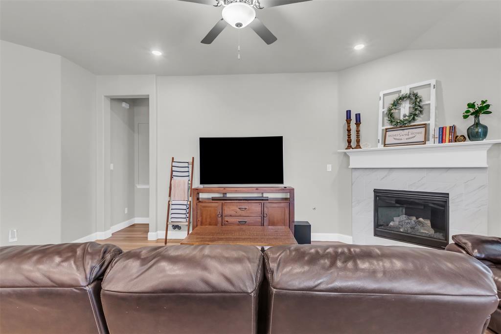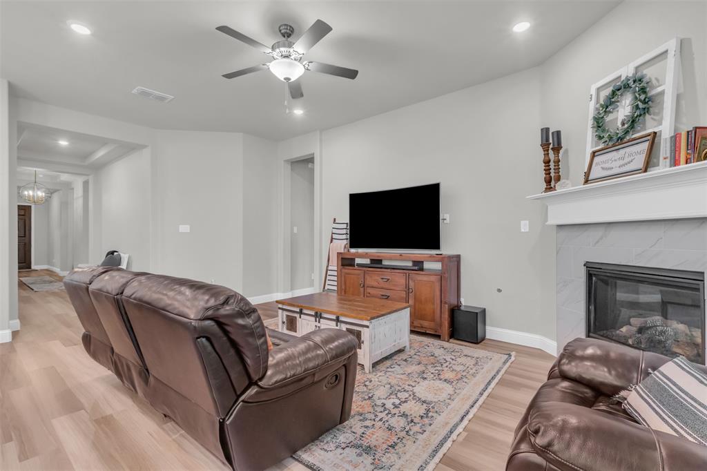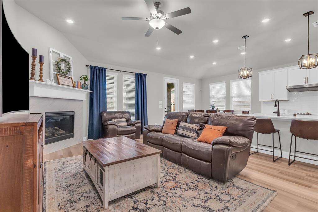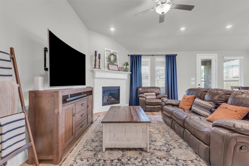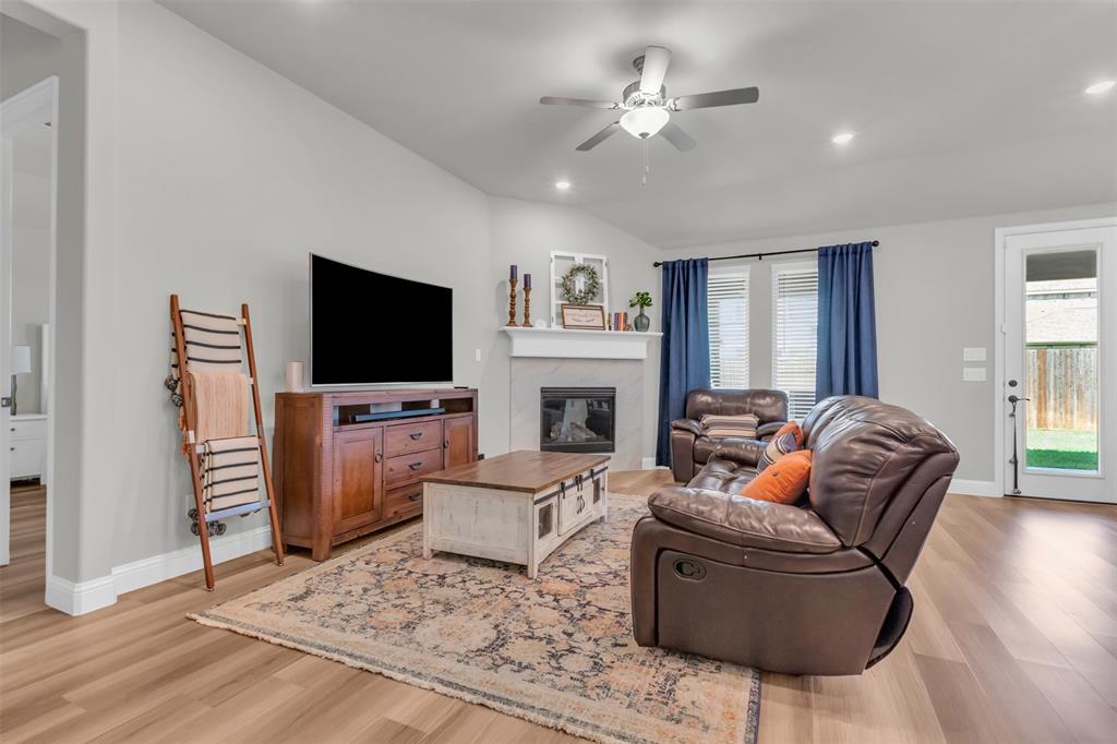 Welcome to your dream home in The Enclave at Oak Grove, Little Elm, built in 2021 and offering 2,311 sq ft of modern living space. Situated on an oversized corner lot, this 3-bedroom, 2-bathroom residence features a grand, high vaulted ceiling that creates an open and airy atmosphere. The open floor plan naturally leads you through the main living areas, including a dedicated study perfect for a home office, a formal dining area, and a cozy living room centered around a fireplace, all of which are designed to feel welcoming. The generously sized kitchen is a chef's delight, and the large laundry room provides ample space for household tasks. The energy-efficient home is designed for seamless indoor-outdoor living, featuring a covered porch that offers a perfect spot for relaxation. Located in a prime area, you'll be just moments away from local schools, a variety of dining options, and entertainment venues. This home is a must-see for anyone seeking style, comfort, and convenience.