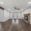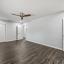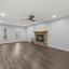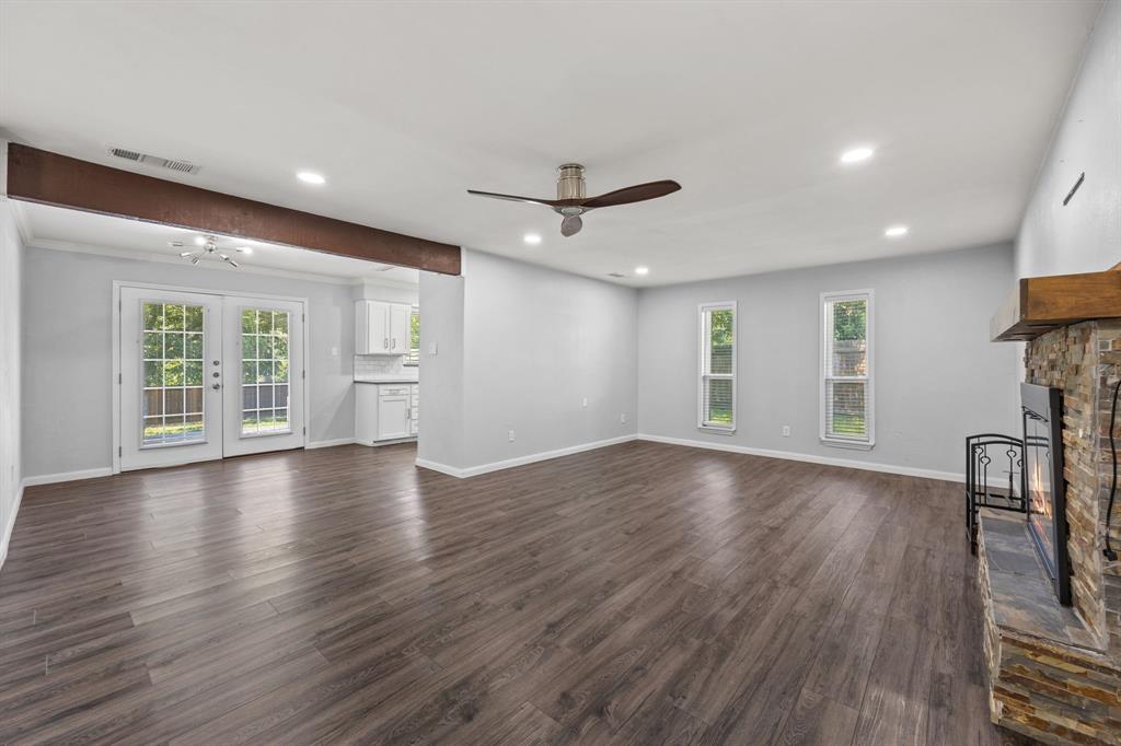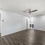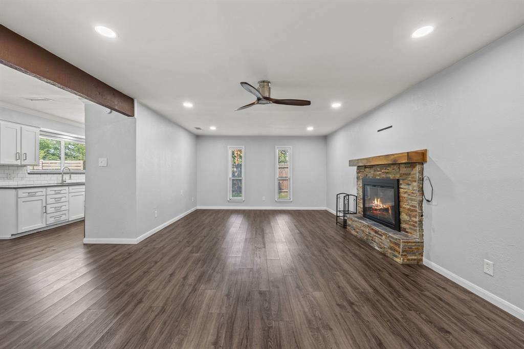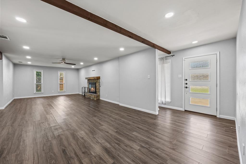 Step inside to an inviting open floor plan featuring light gray walls, crisp white trim, and durable luxury vinyl plank flooring throughout — no carpet. The heart of the home is the fully updated kitchen with quartz countertops, stainless-steel appliances (including a double oven), and sleek finishes designed for cooking and entertaining.
