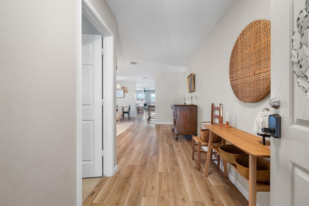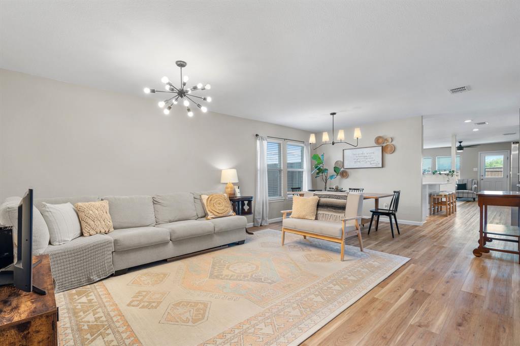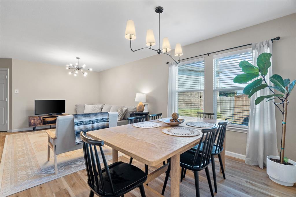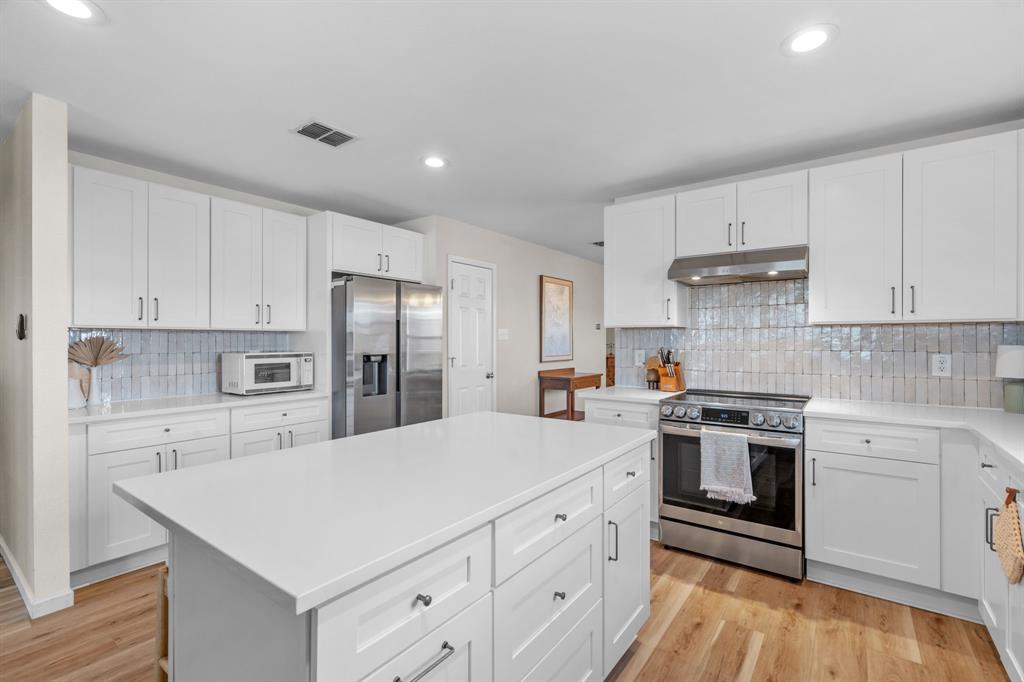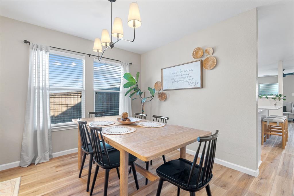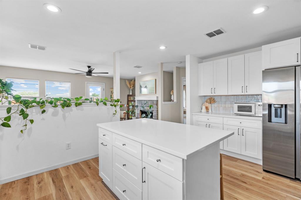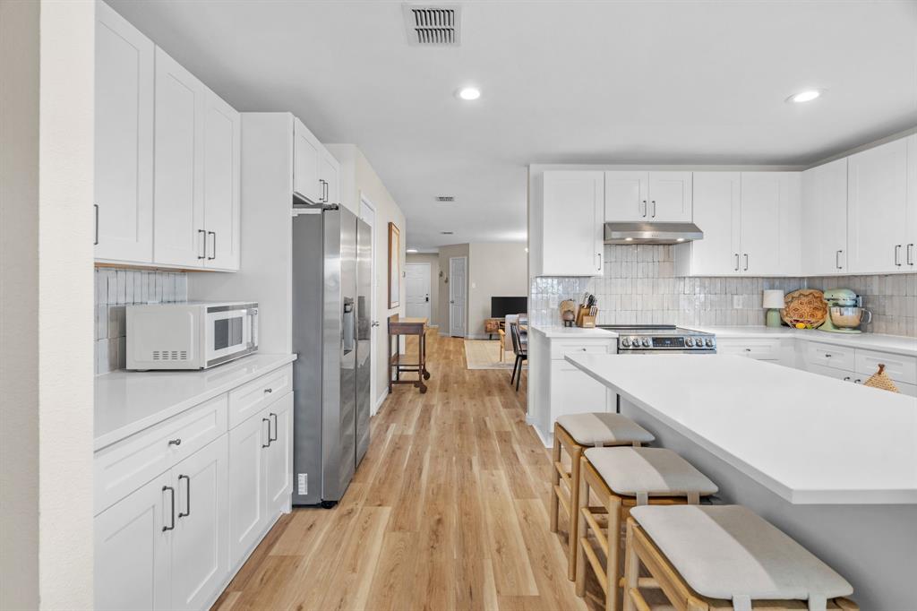 The home features stunning light wood LVP flooring throughout the main living areas, complemented by soft neutral walls and stylish modern farmhouse light fixtures. The kitchen is a chef’s dream, with bright white cabinetry, sleek countertops, and a chic vertically set backsplash that ties everything together.