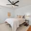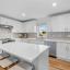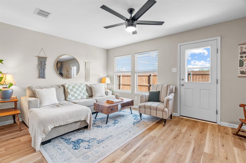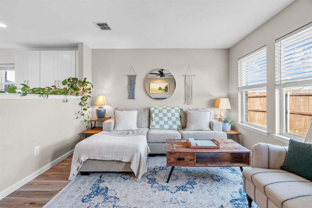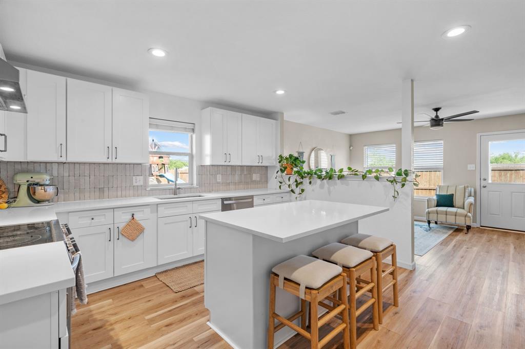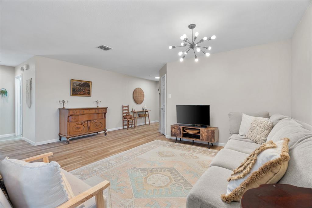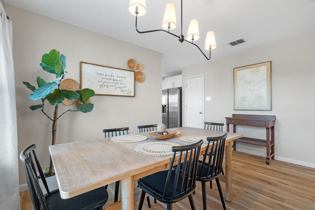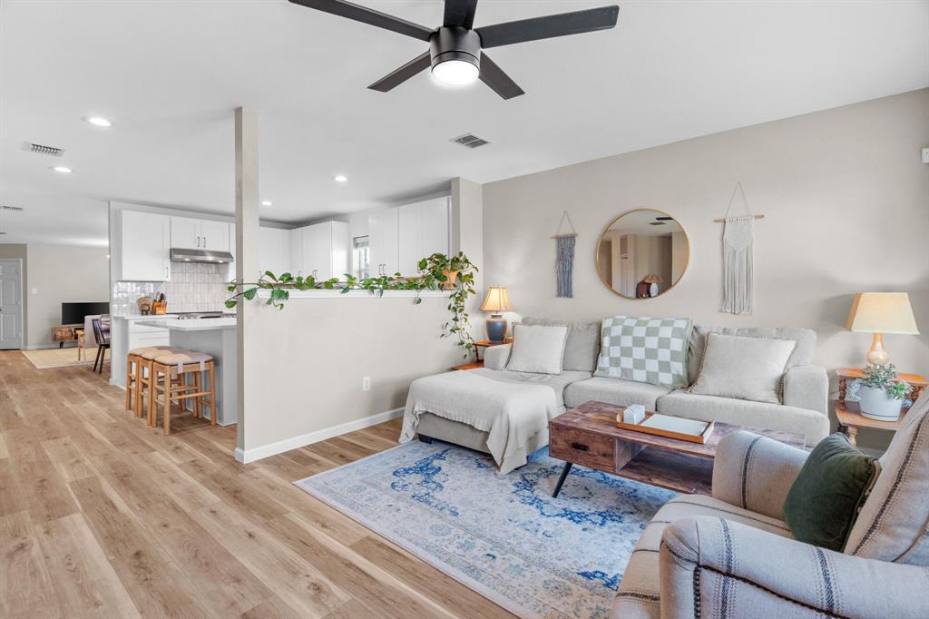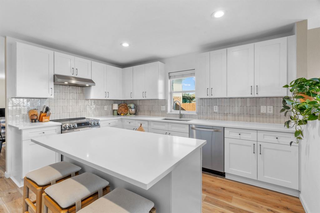 The home features stunning light wood LVP flooring throughout the main living areas, complemented by soft neutral walls and stylish modern farmhouse light fixtures. The kitchen is a chef’s dream, with bright white cabinetry, sleek countertops, and a chic vertically set backsplash that ties everything together.