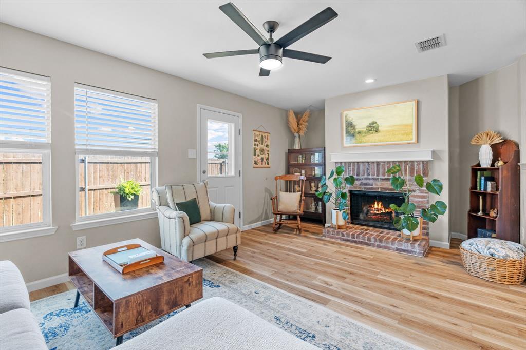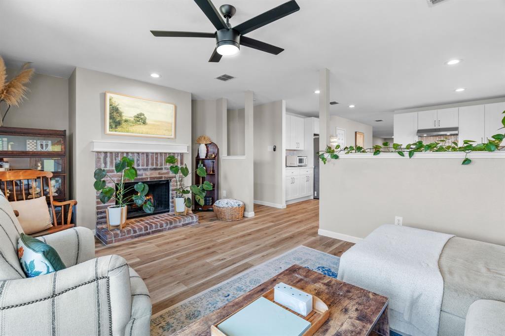 Enjoy ample space for entertaining with two living areas, ensuring guests have room to spread out. The family room, featuring a cozy wood-burning fireplace, sets the perfect mood for cooler evenings. The back hallway leads to two bedrooms and a full bath, while the expansive primary suite at the rear of the home offers added privacy and room for a seating area.
