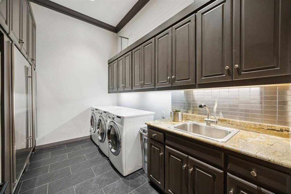 The butlers pantry highlights stainless steel and glass cabinetry with granite tops along with wine cooler, refrigerator & sink