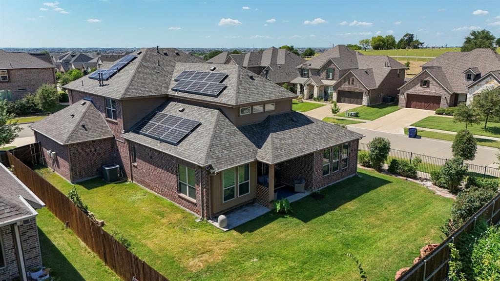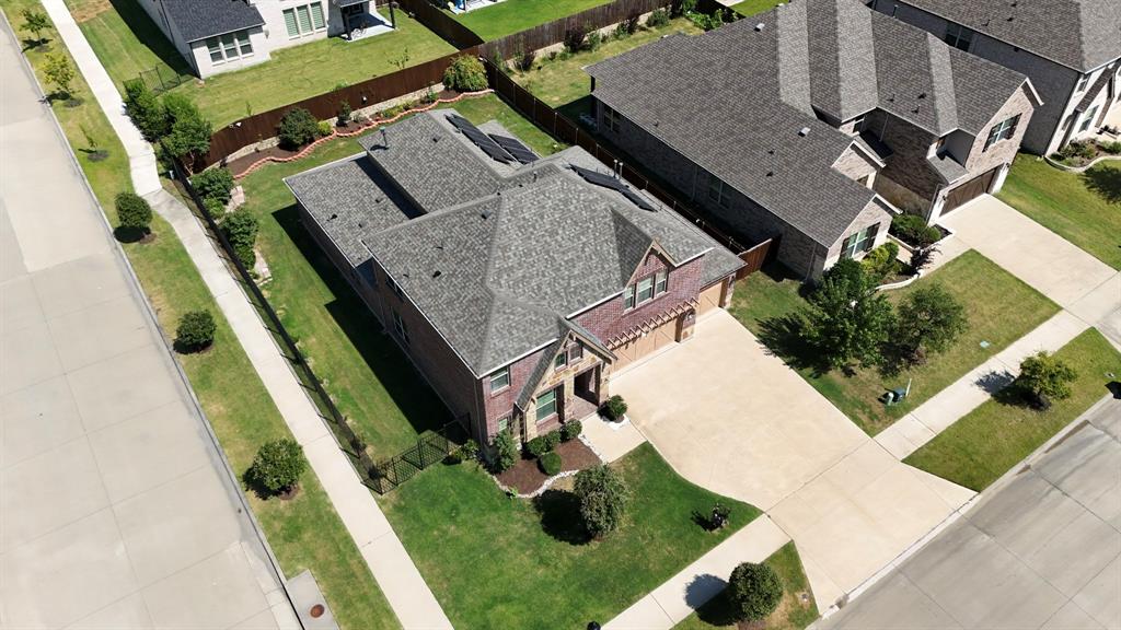 Fully Paid SOLAR PANELS!!! BEAUTIFUL CORNER LOT nestled in the sought-after Frisco ISD, this single-family home offers a perfect blend of modern comfort and classic elegance. A thoughtful five-bedroom layout with dramatic 20-foot ceilings, hardwood floors and abundance of natural light creates an ambiance perfect for both relaxation and entertainment. Additionally, this home offers a guest room, full bath and attached walk in closet on the main level, ideal for visitors or extended family. With a huge backyard, 3 car garages, this home represents a stylish and value-driven option for families seeking peaceful and quality living. The 5 Star rated Glen View community offers top-tier amenities including two scenic ponds, playgrounds, lush green walking trails, and the 13-acre Monarch View Park with pavilion, basketball court, picnic areas, and a zip line. Located minutes from attractions including Omni PGA, Fields Ranch, the future Universal Studios, and upcoming northwest community park — this residence offers a combination of tranquil and luxury living. Custom Built area for pets in Living room. A brand-new roof installed in 2024.