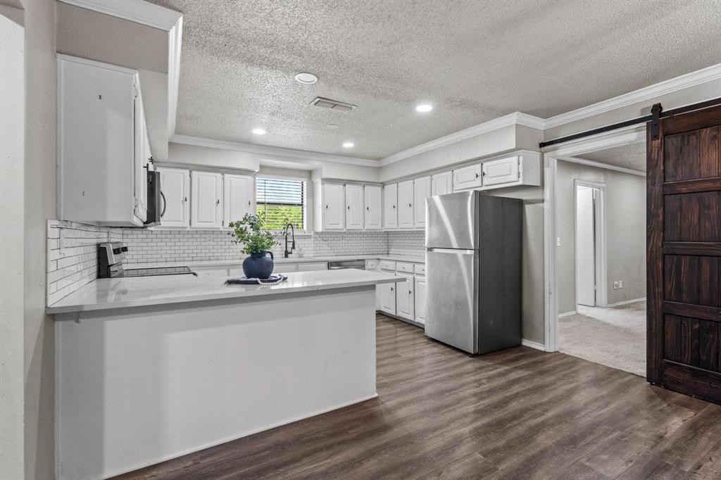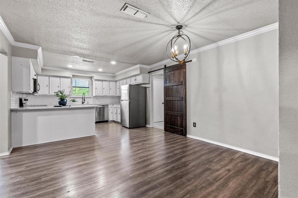 This 3 bed 2 bath home sits on top of a hill on 0.8acres outside of Sherman at the end of a quiet, dead-end road — no HOA! The home was fully updated a few years ago with a stunning farmhouse style kitchen with white subway tile backsplash, white cabinets and quartz countertops, and stainless steel appliances, updated bathrooms, recessed and pendant lighting, and new roof. The primary suite features a huge bedroom, ensuite bathroom with updated standing shower, walk-in closet, and direct access to the back porch. One car garage with room for a workshop area on the side, in addition to a one car carport. Out the back door, you'll enjoy a covered deck, private backyard, 240sf finished out outbuilding and storage shed, humungous wide open side yard, and large beautiful trees shade the front yard and back property line.