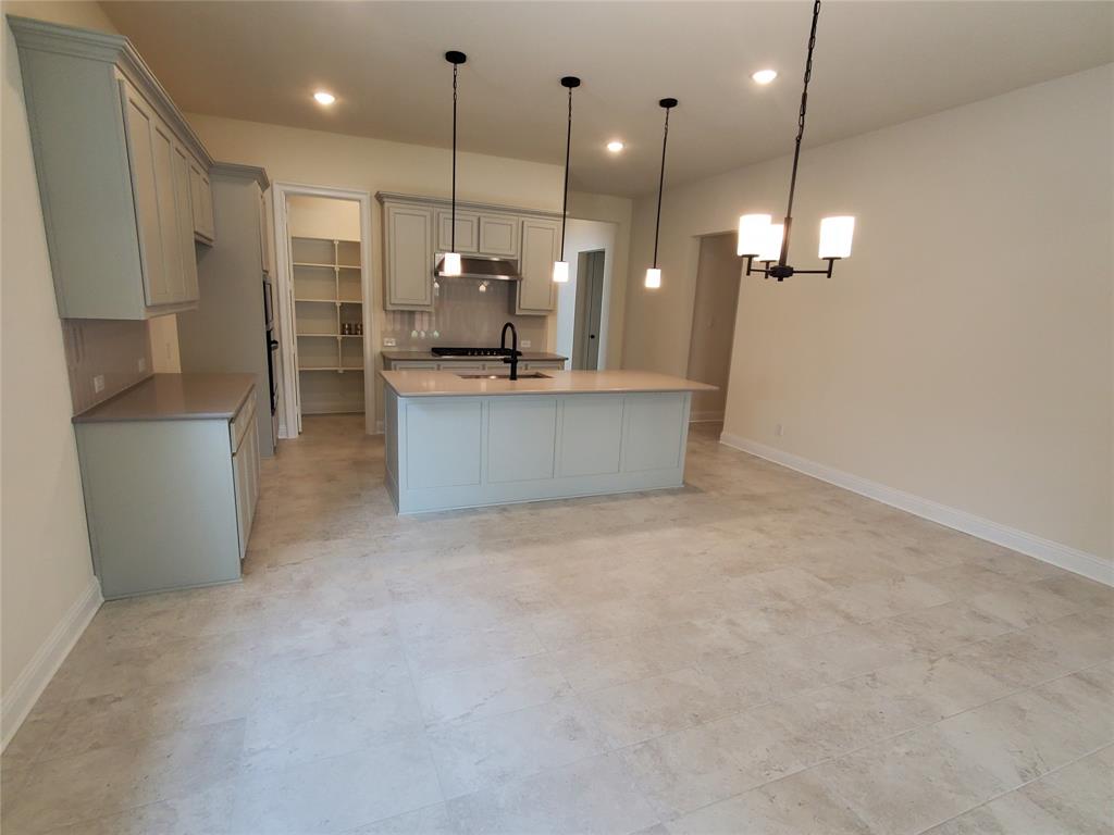 The open-concept layout includes a spacious casual dining area, a private study, and a generously extended covered patio ideal for outdoor gatherings, perfect for relaxing or entertaining—all with park views in the background. The chef-inspired kitchen features a large center island with breakfast bar, ample cabinet and counter space, and an oversized walk-in pantry.