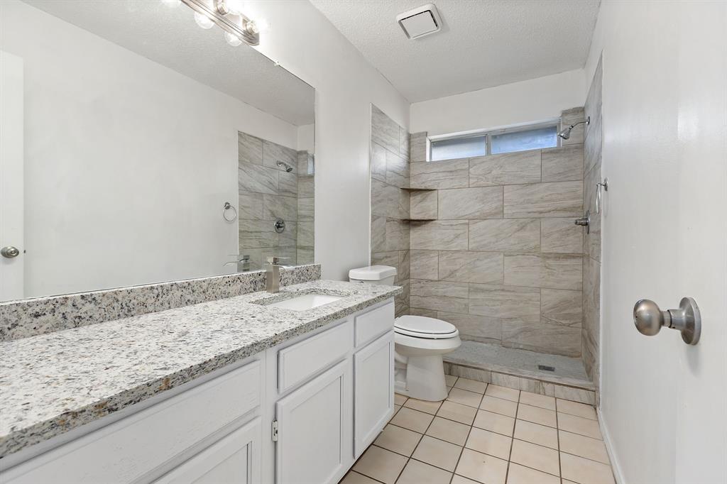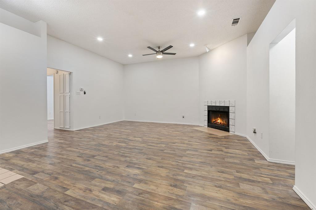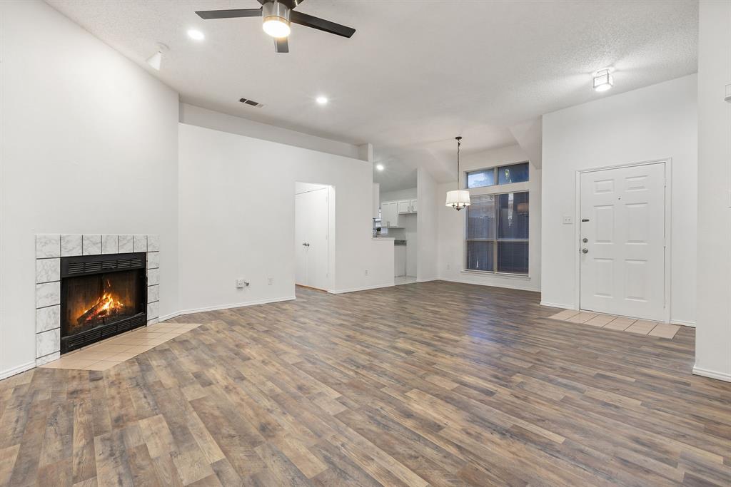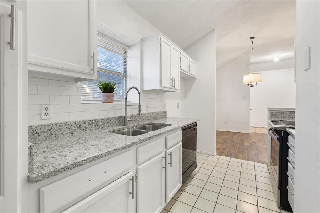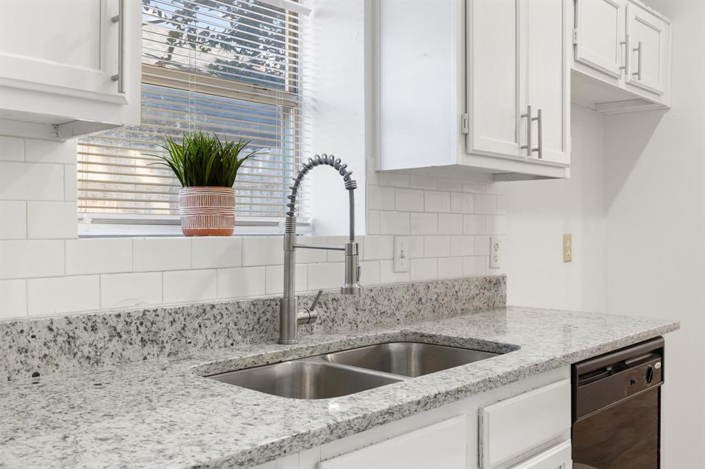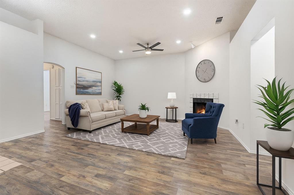 Recent updates include fresh interior paint, stylish new countertops and faucets in both kitchen and bathrooms, and easy-care vinyl plank and tile flooring throughout. The open-concept living area feels warm and inviting with a cozy wood-burning fireplace, while the kitchen impresses with granite countertops, subway tile backsplash, and plenty of storage. The split master suite provides a private retreat with an en-suite bath featuring double sinks and a walk-in closet. Secondary bedrooms are good sized and filled with natural light.