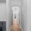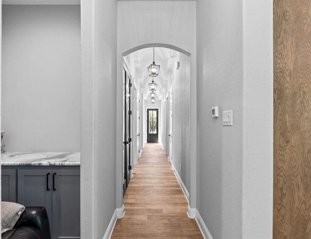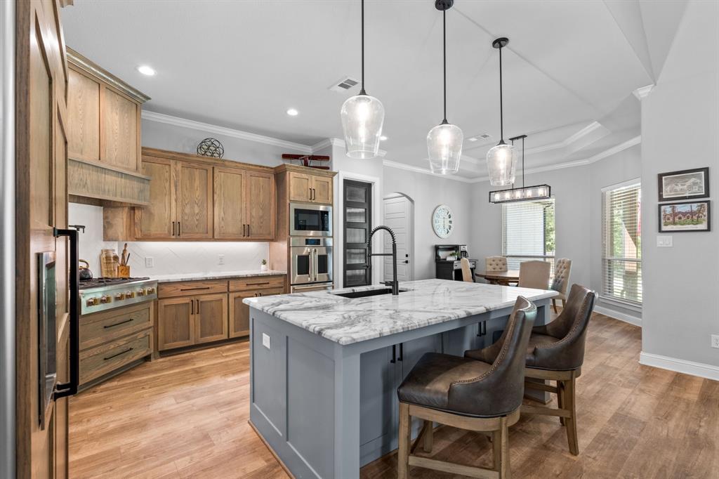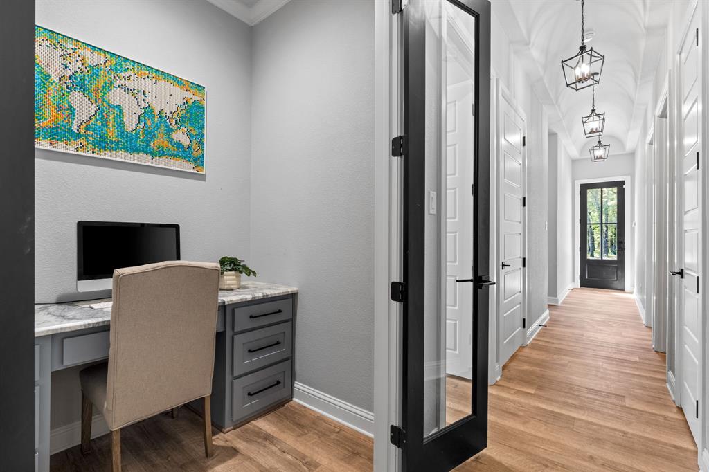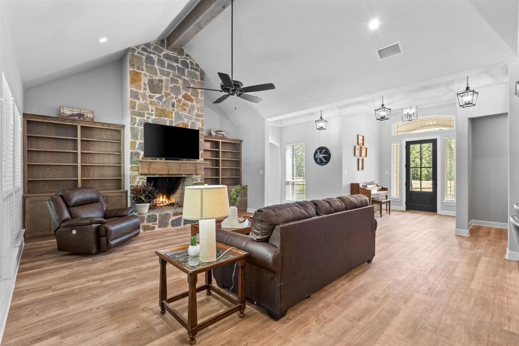 Inside, you're welcomed by a dramatic living room featuring soaring ceilings, custom built-ins, and a striking stone wood-burning fireplace. The open-concept design flows seamlessly into a spacious dining area and a chef’s kitchen complete with pot filler, oversized island, top-of-the-line stainless steel appliances, double ovens, and a walk-through butler’s pantry. A small enclosed office space with desk is offered just off the hallway.