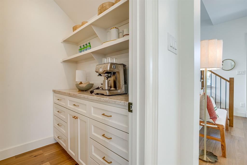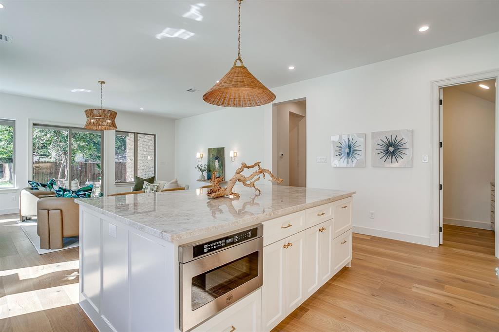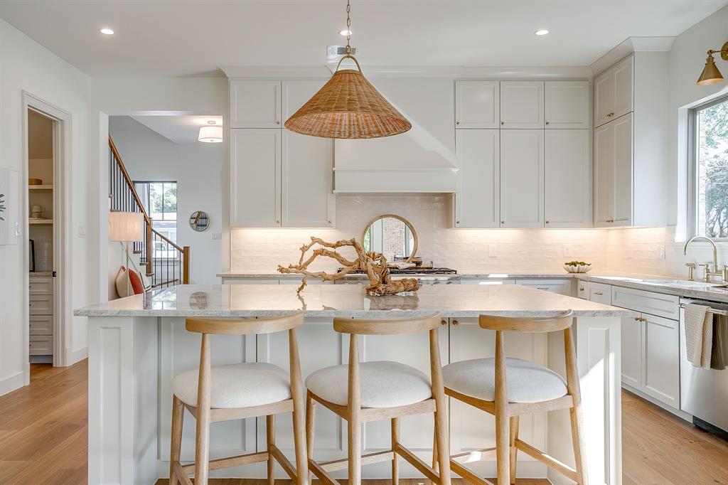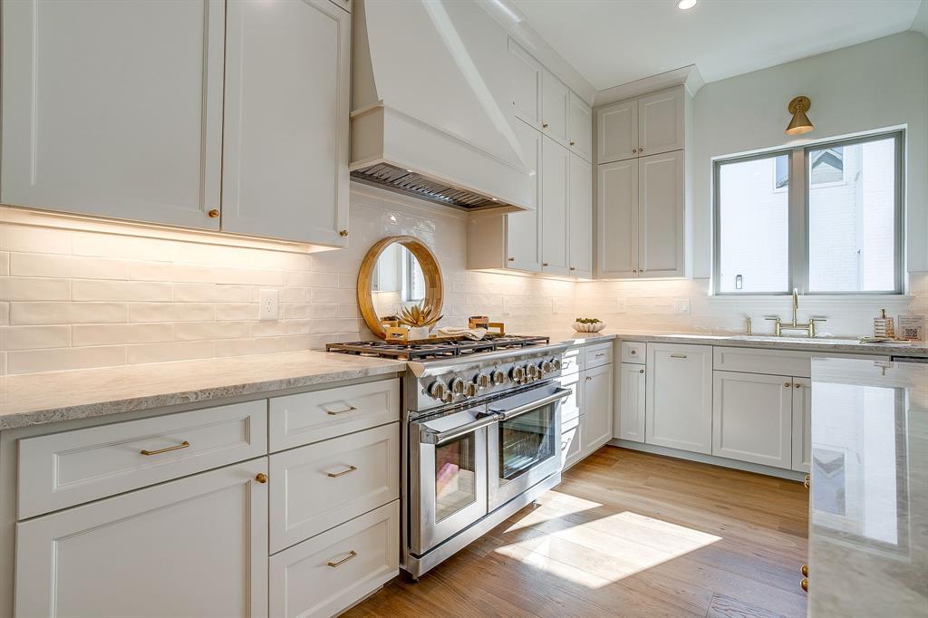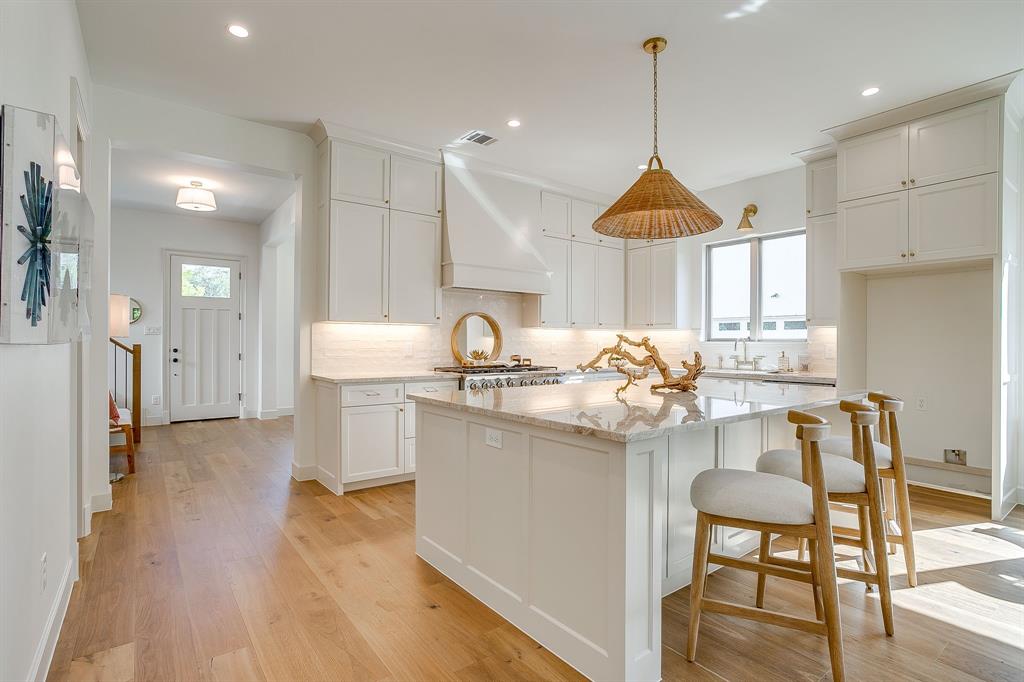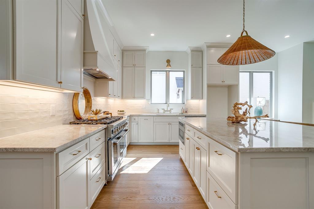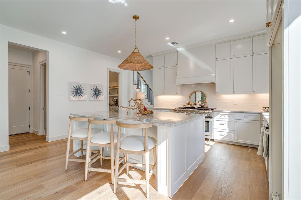 Greeted with soaring ceilings and an abundance of natural light, the showstopper is the beautifully appointed kitchen loaded with upgrades. From the Taj Mahal quartzite countertops to the American Brand 8 burner, 48-inch dual gas range, and the Bertazzoni dishwasher and drawer microwave that coordinate, along with Visual comfort light fixtures, soft close hinges, and designer plumbing finishes throughout complete the inviting space.
