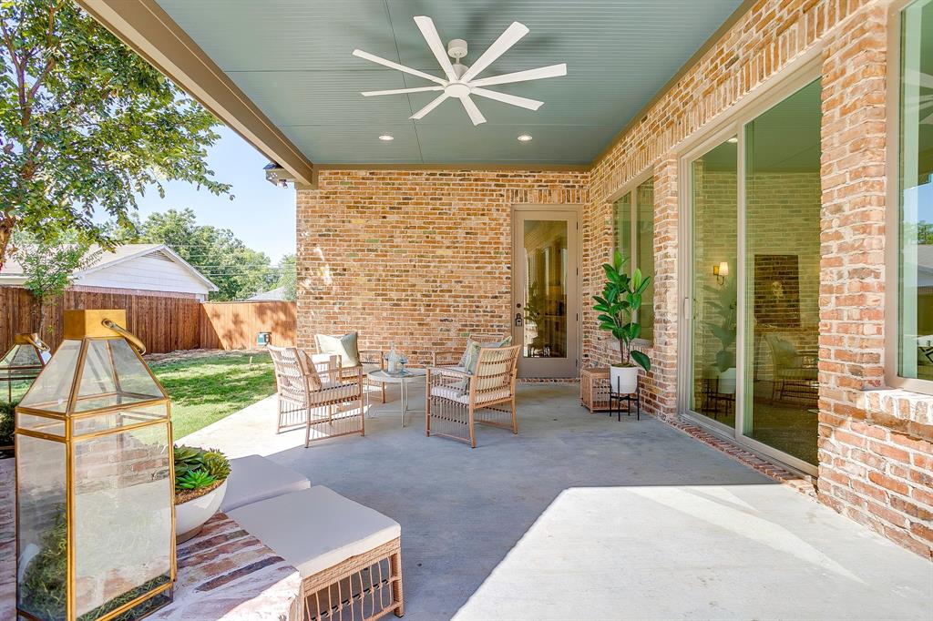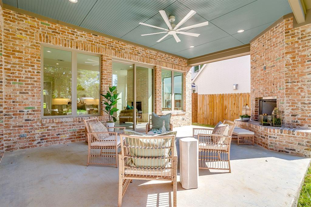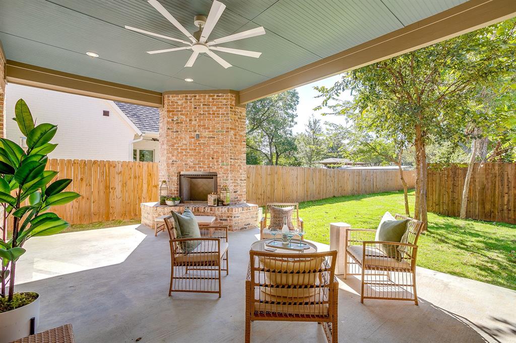 The open floor plan frames serene views of the backyard from both the kitchen and living areas. The outdoor living area extends the home’s elegance with a covered patio and gas fireplace. A freshly sodded yard with sprinkler system offers versatile space — whether for a garden, dog run, batting cage, or simply enjoying evenings under the stars.