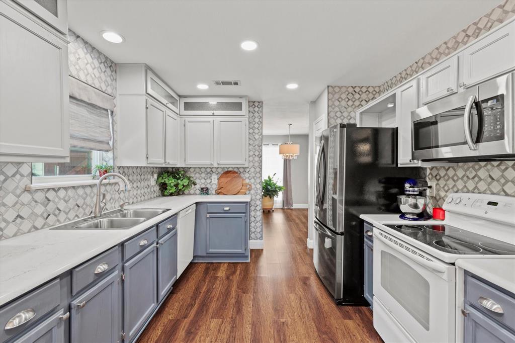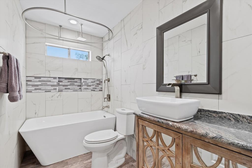 The chef’s kitchen is a true showpiece, with quartz countertops, a stunning marble backsplash running from counter to ceiling, refreshed cabinetry, and sleek new hardware. Upstairs, all bedrooms feature plush new carpet, while spa-inspired bathrooms offer floor-to-ceiling tile, modern vanities, vessel sinks, and contemporary finishes.