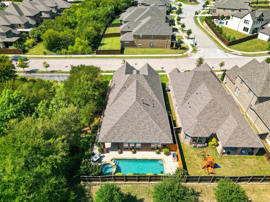 This beautiful well maintained one story home is located in the Heart of Austin Waters. The 3 bedroom home offers the perfect blend of style, efficiency and functionality. Relax on the covered patio and cool off in the beautiful pool and spa with 2 lovely water features. The wood fence offers privacy and the wrought iron fence next to the nature preserve separates you from your neighbors. The Living Room has a stone fireplace and overlooks the pool. The primary suite is large enough for a sitting area and has an ensuite bathroom. The primary walk in closet is a pass through to the Laundry Room for convenience. The 2 guest bedrooms and bathroom are separated from the Primary Suite for privacy. The well equipped gourmet kitchen has a large kitchen island with a sink and an abundance of cabinets. The Dry Bar has a built in wine cabinet. Austin Waters has a community pool, park, bike paths, scenic trails and greenbelts. Located just minutes from Grandscape dining and retail. This property backs up to Arbor Hills Nature Preserve. Don't miss out on one of The Colony's most desirable neighborhoods.