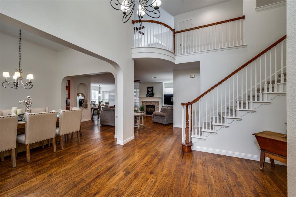 Inside, you're greeted by a dramatic foyer with soaring ceilings, a Juliet balcony, crown molding, art niches, and fresh paint throughout. The open floor plan seamlessly transitions into the spacious living area, which features rich flooring and a cozy fireplace. The kitchen is a true centerpiece, boasting granite countertops, a farmhouse sink, high-end stainless steel appliances, a gas cooktop, and a breakfast bar that opens to the inviting family room—perfect for entertaining.