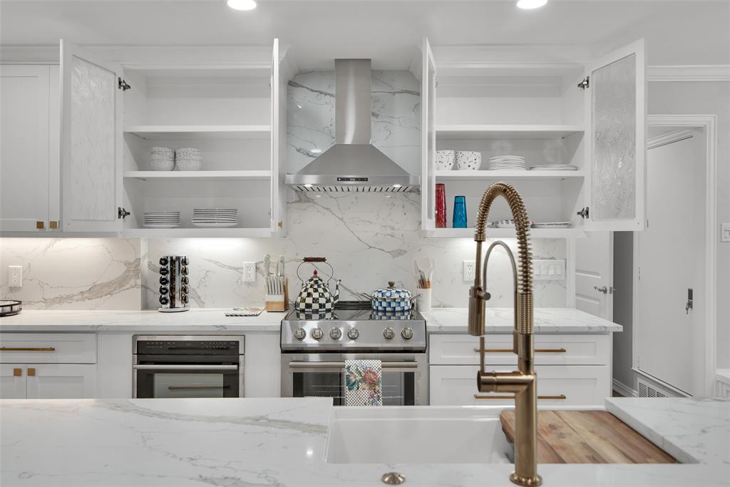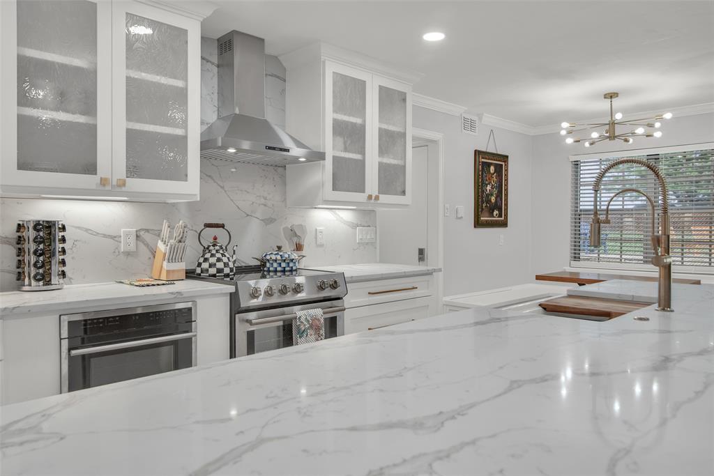 • Quartz countertops flow seamlessly across kitchen and baths, paired with Forno appliances including an electric range.
