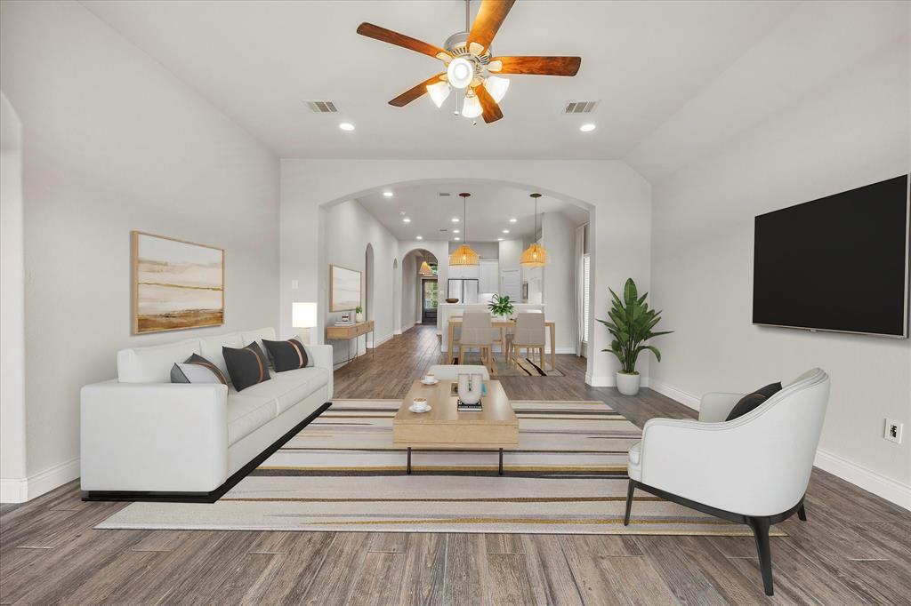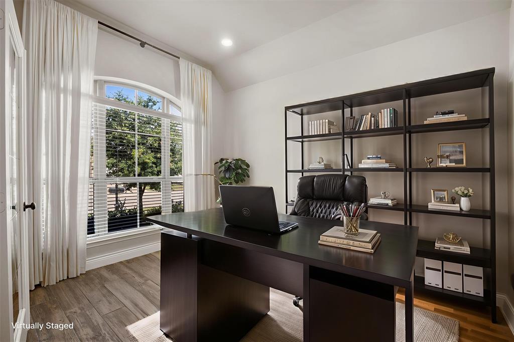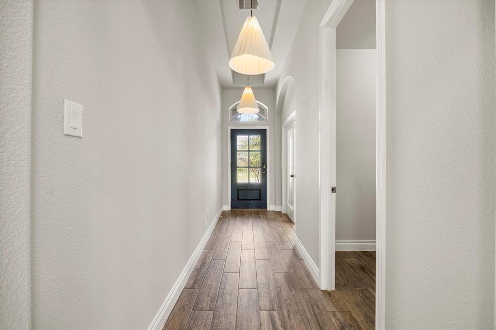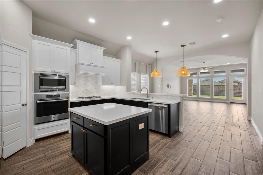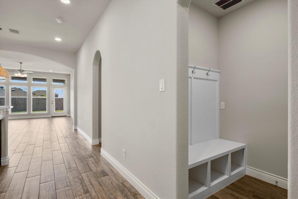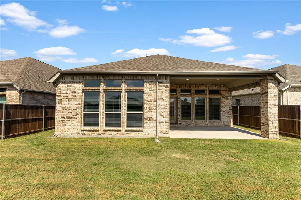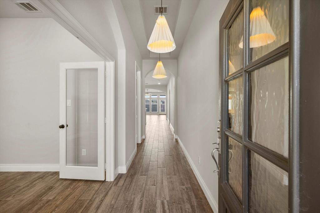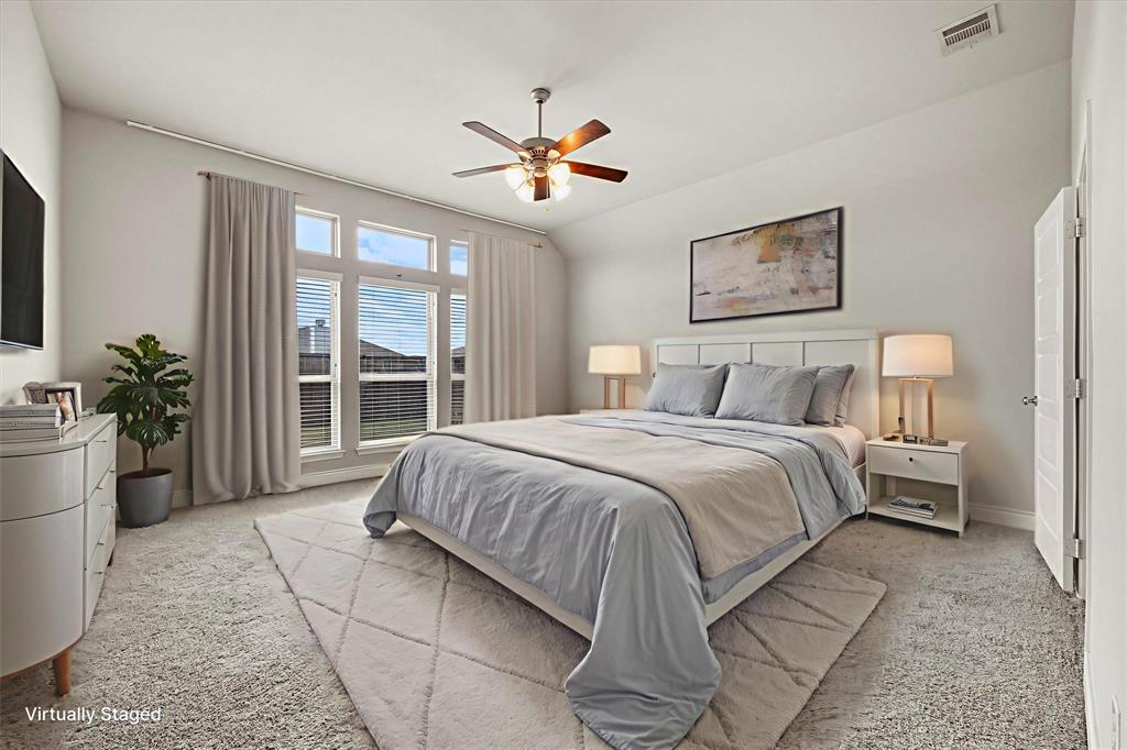 Welcome to this beautifully built home by Perry Homes! From the moment you step inside, an extended entry with soaring 13-foot ceiling creates an impressive first impression and sets the tone for the elegance that follows. This thoughtfully designed 3-bedroom residence combines modern style with everyday comfort, offering wood-look tile flooring throughout the open living and entertainment areas and plush carpet in the bedrooms for added warmth. The chef-inspired kitchen features generous counter space and a center island that connects seamlessly to the dining area and spacious family room, perfect for gatherings large or small. Natural light pours in through expansive windows, enhancing the bright and inviting atmosphere. A private home office is ideally located at the front of the home near the entry, providing a quiet and functional space for remote work or study. The luxurious primary suite serves as a peaceful retreat, complete with a spa-like bath featuring dual vanities, a soaking tub, and a separate glass-enclosed shower. Secondary bedrooms are generously sized with comfortable layouts, creating a balance of privacy and convenience. Outdoor living is elevated with a covered patio overlooking the backyard, ideal for entertaining or simply enjoying the evening breeze. Additional highlights include a mudroom for extra organization, a two-car garage, and timeless Perry Homes craftsmanship that blends quality with style. This home is designed to offer the perfect combination of sophistication, comfort, and functionality in a location you’ll love.