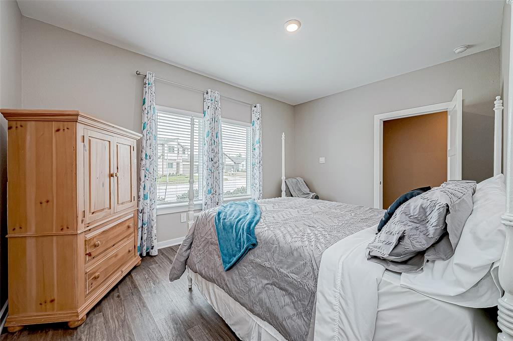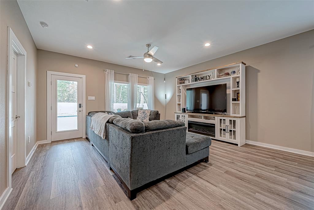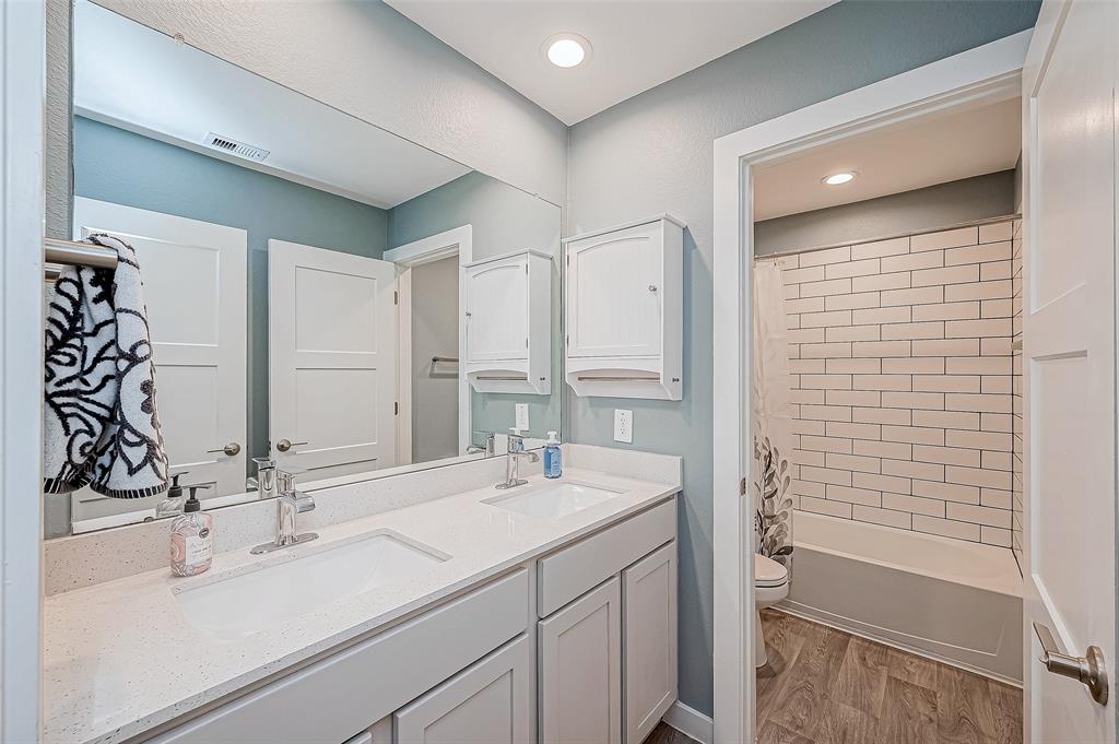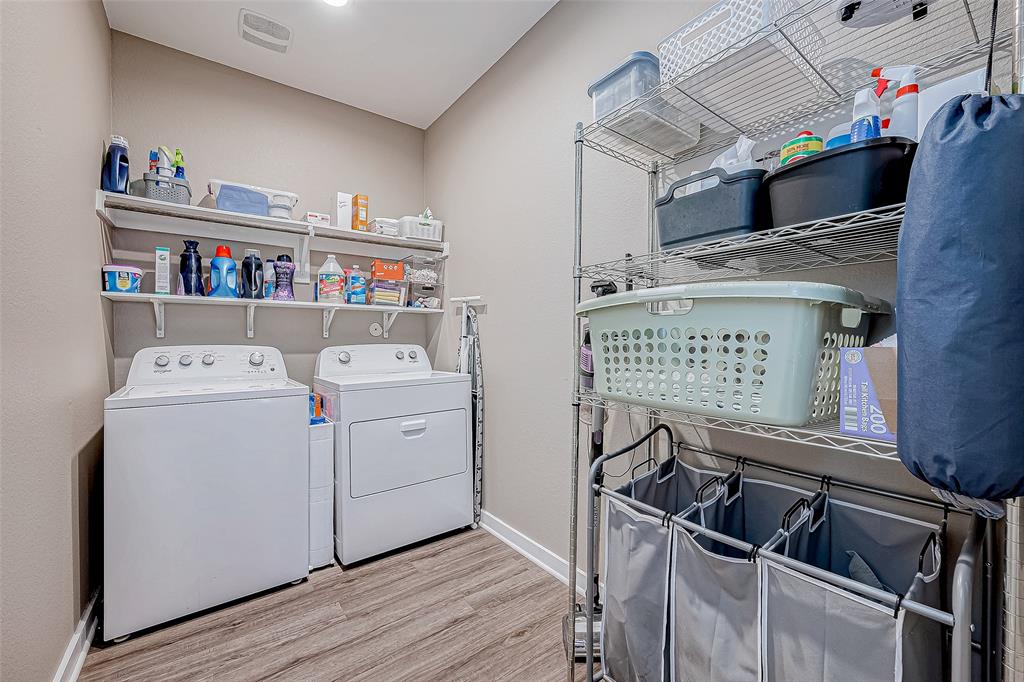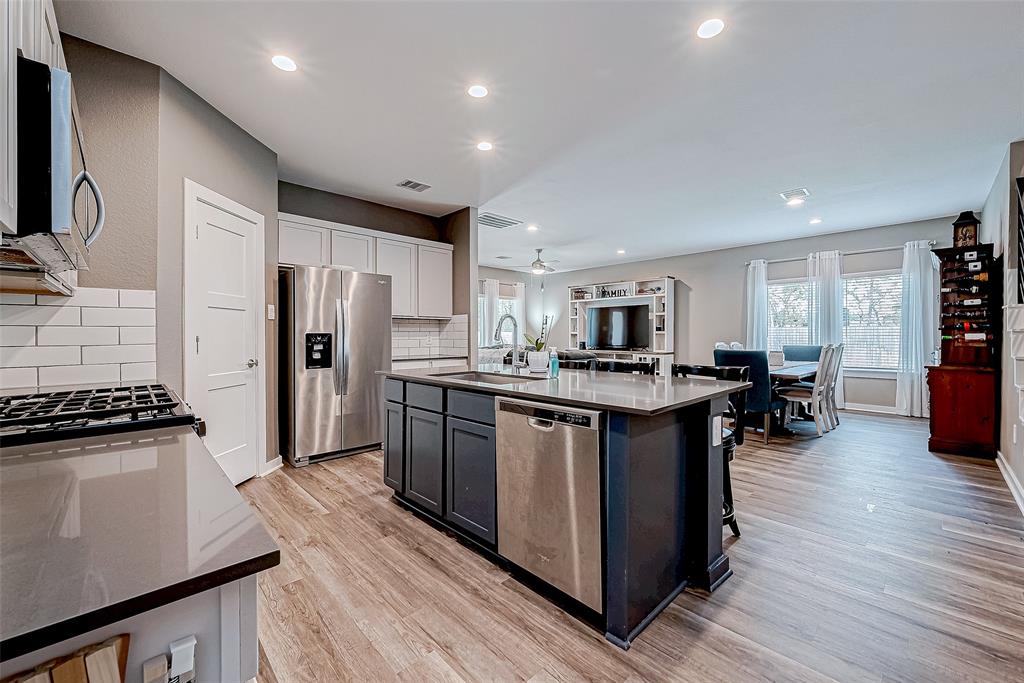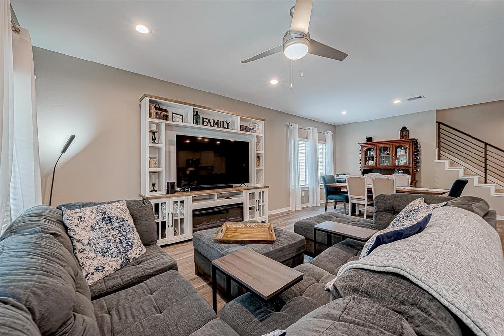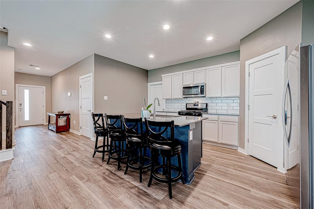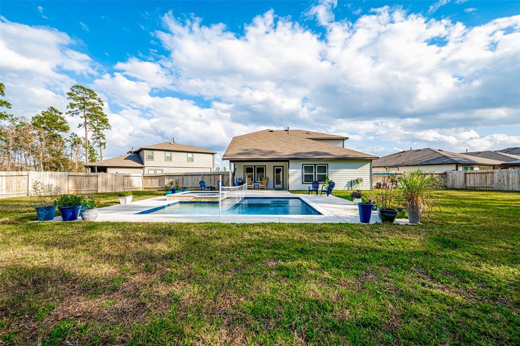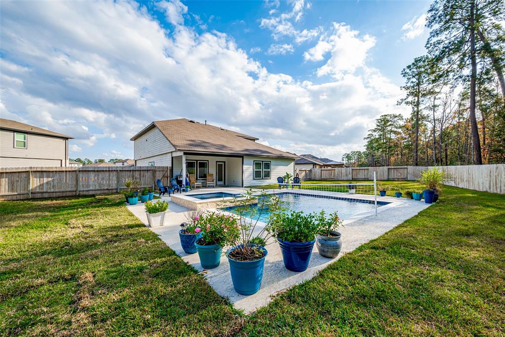 This stunning 5-bedroom, 2.5-bath home features a contemporary open-concept design with high ceilings and a large private backyard with a covered patio and wooded views—no back neighbors! The kitchen boasts quartz countertops, a subway tile backsplash, a large island with sink and bar seating, a coffee bar, stainless steel appliances, a walk-in pantry, and shaker-style cabinetry. The primary suite overlooks the pool and features a dual-sink vanity, garden tub, separate shower, and spacious walk-in closet. Also downstairs is the first of the secondary bedroom or office, a large storage area, a guest ½ bathroom, and an oversized utility room. Enjoy a roomy game room, 3 additional bedrooms, and a full bathroom upstairs. Recent updates include luxury vinyl flooring, professional interior painting, a backyard Sports Pool, a sundeck/spa with app-controlled heating, and LED. The community offers a pool, clubhouse, trails, and playgrounds. New Campbell Elementary School opening Fall 2025