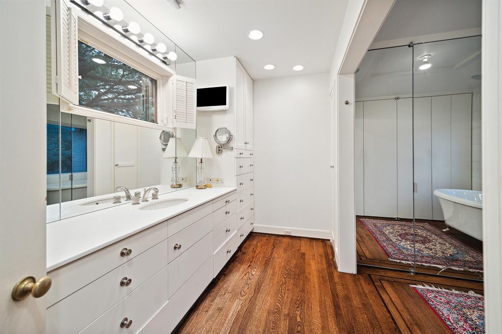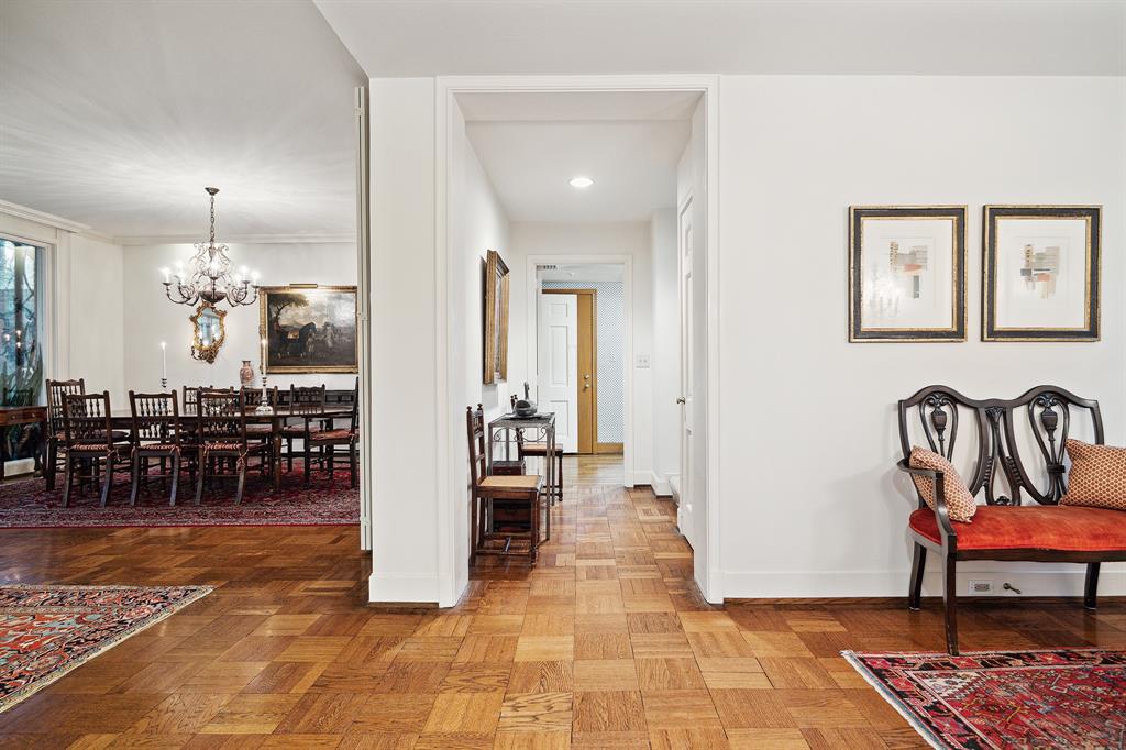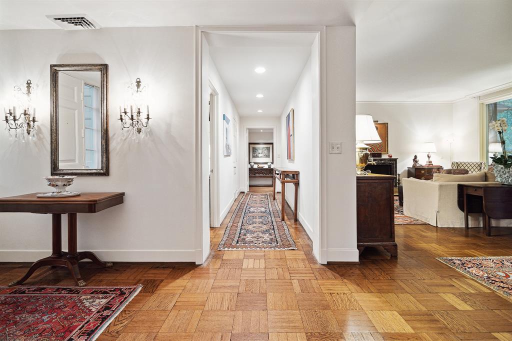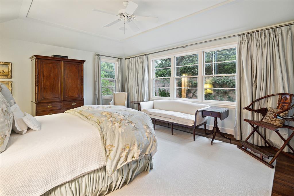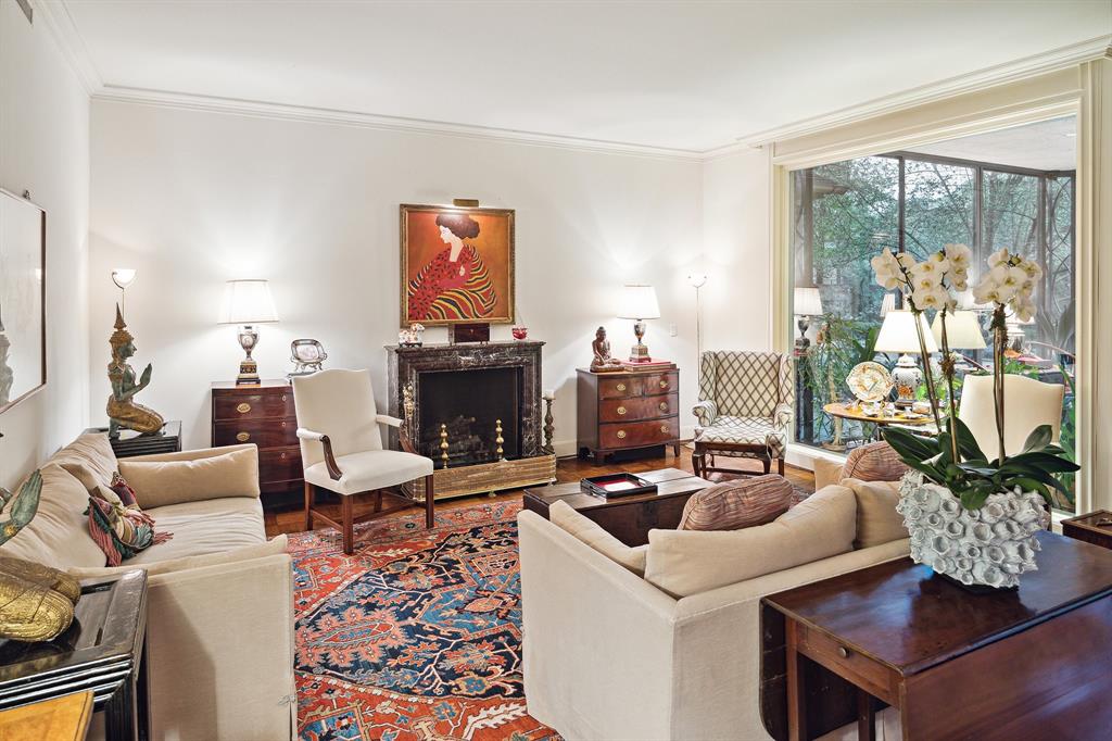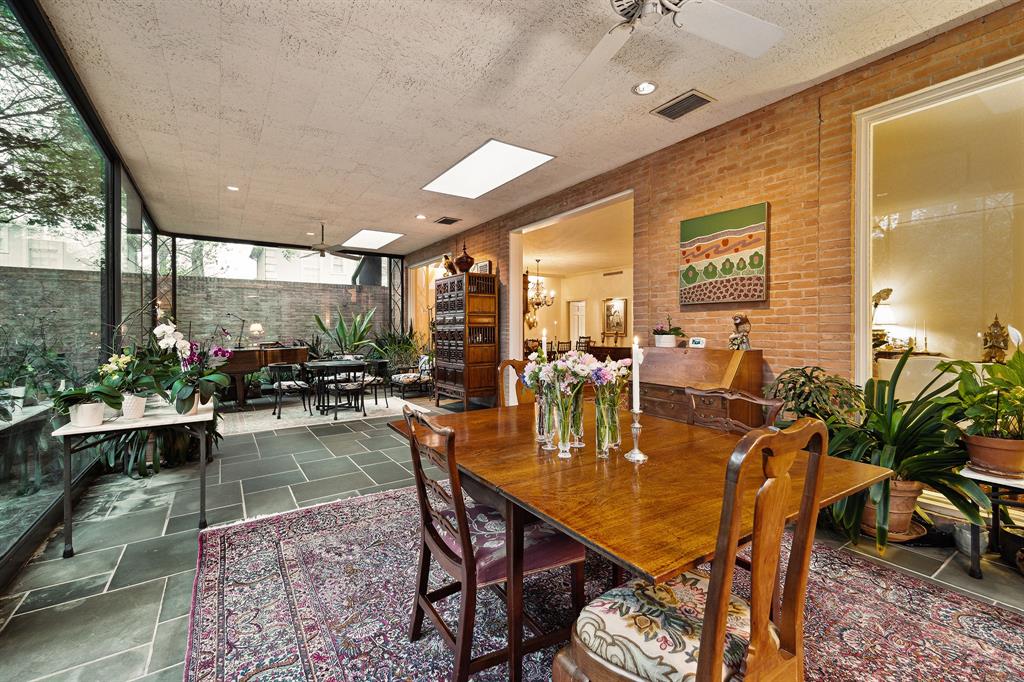 This River Oaks Mid Century Modern gem by renowned architect John F. Staub exudes timeless elegance. The expansive 19,095 sq. ft. corner lot (per HCAD) offers a welcoming parking court and lush private gardens. Lovingly restored and thoughtfully updated, this home blends classic charm with modern comforts. The open formal living and dining areas flow into a light-filled sunroom overlooking the gardens. A gracious wood-paneled study, complete with a cozy fireplace and bay window, adds sophistication. Notable features include stationary floor-to-ceiling picture windows, rich hardwood floors, solid bifold doors, and an imported marble fireplace. The first-floor primary suite is a true retreat, featuring a coffered ceiling, serene garden views, lavish dual full baths, and custom-fitted closets. Two secondary bedrooms with ensuite baths upstairs. The property backs onto the park-like gardens of the historic DeMenil House.