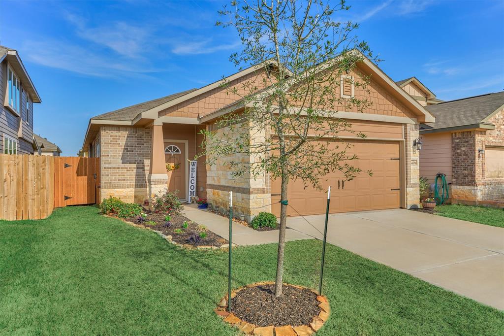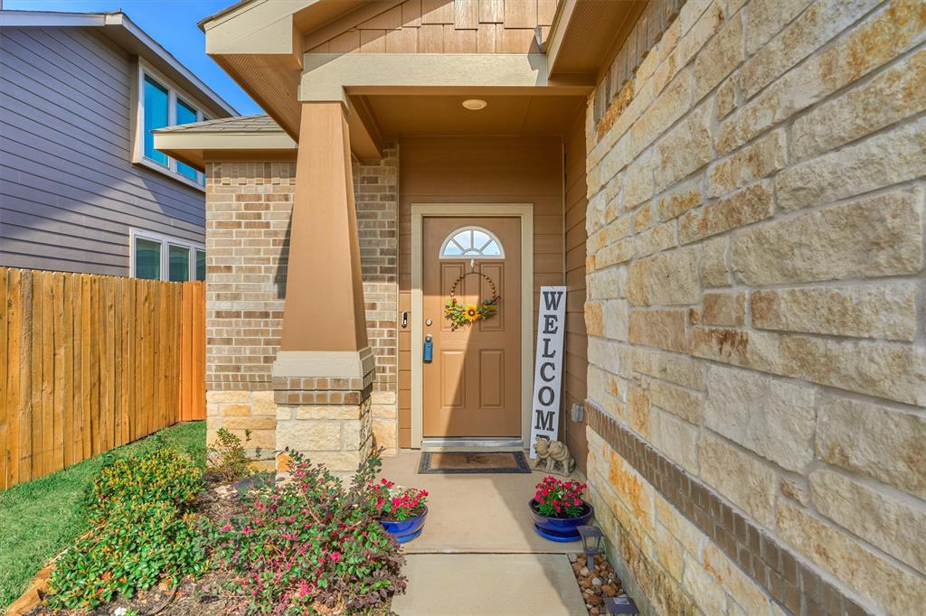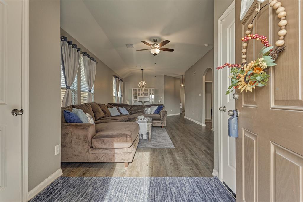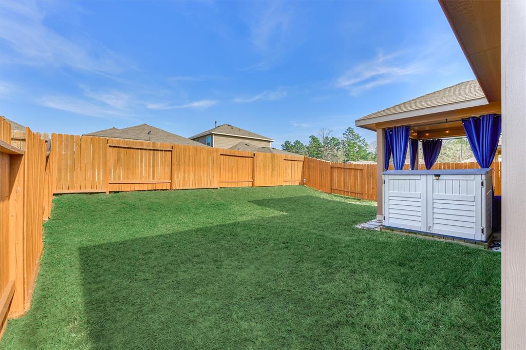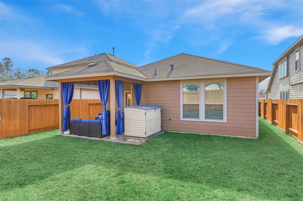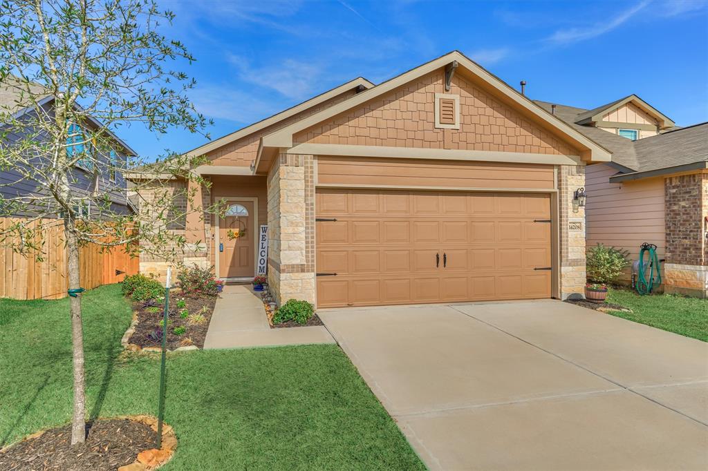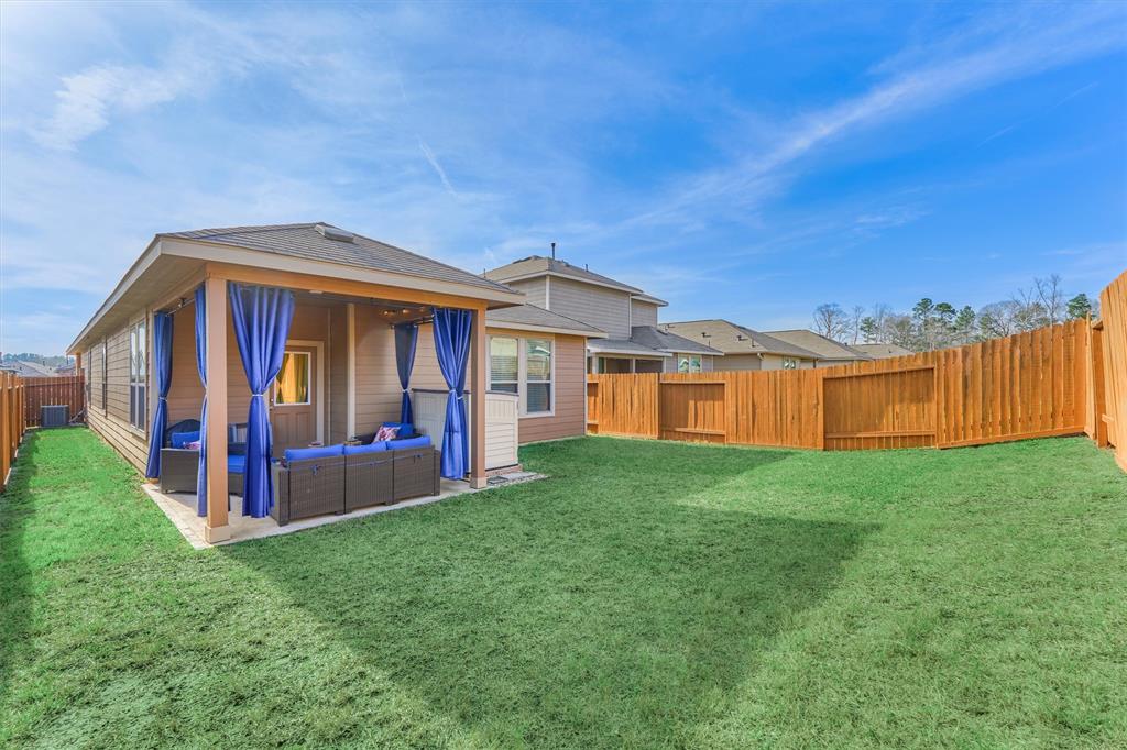 Welcome to this wonderful 3 bedroom, 2 bath home in the new Caney Mills community in Conroe! This impressive home has been immaculately cared for & upgraded with lots of added extras! Whole home water filtration system, Modern hardwood look flooring, neutral paint & high vaulted ceilings. The open concept living area offers a wall of windows allowing lots of natural light into the home, all with blinds and drapes.The split floor plan offers a primary suite located to the rear of the home, away form the additional 2 bedrooms.The large primary en-suite has a large en suite bathroom with dual vanity areas, soaker tub and glass shower. Enjoy the views to the backyard.Large closets & spacious laundry room!The gorgeous modern kitchen with granite counters is spacious & has a large breakfast bar & walk in pantry! Fridge Stays!Large backyard has an extended patio, perfect for entertaining! A generous 2 car garage offers overhead storage racks! Quick access to I-45, Great for commuters!