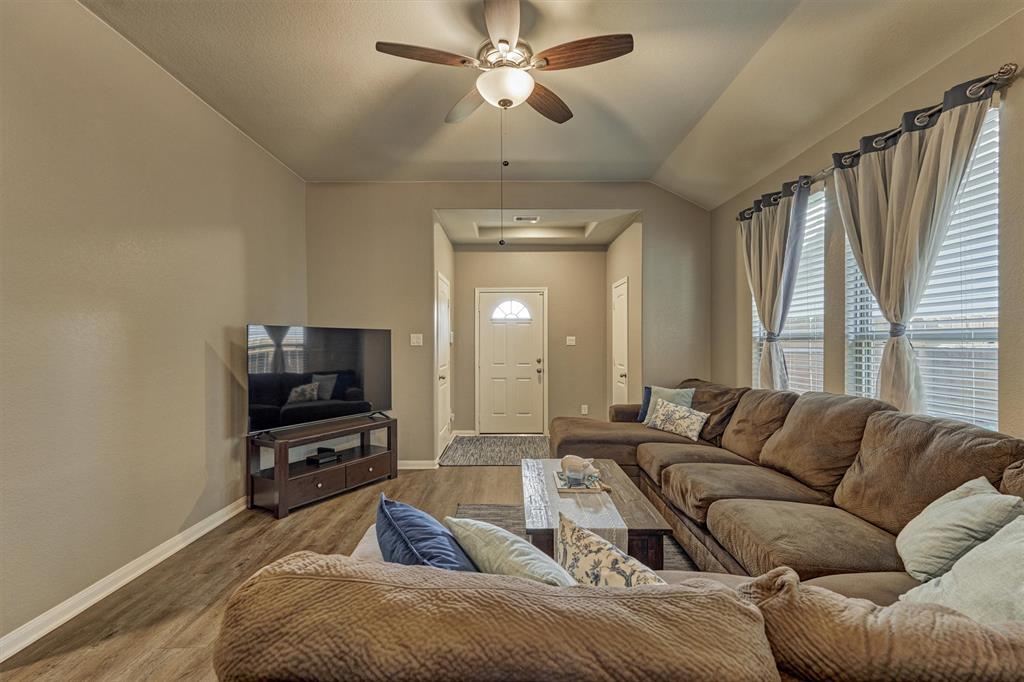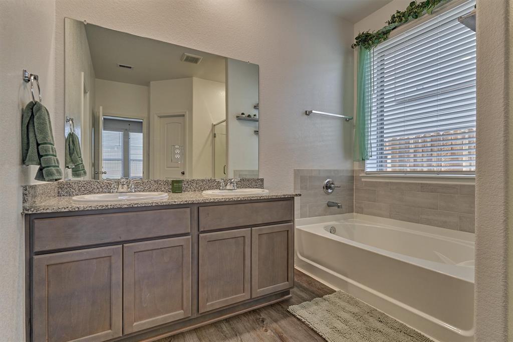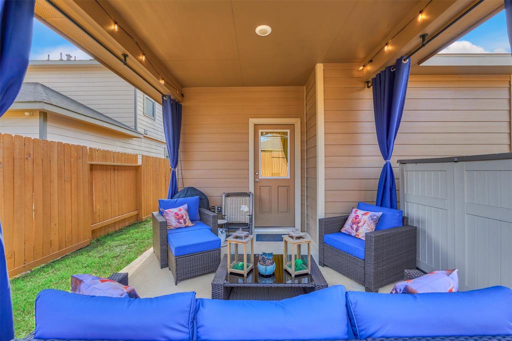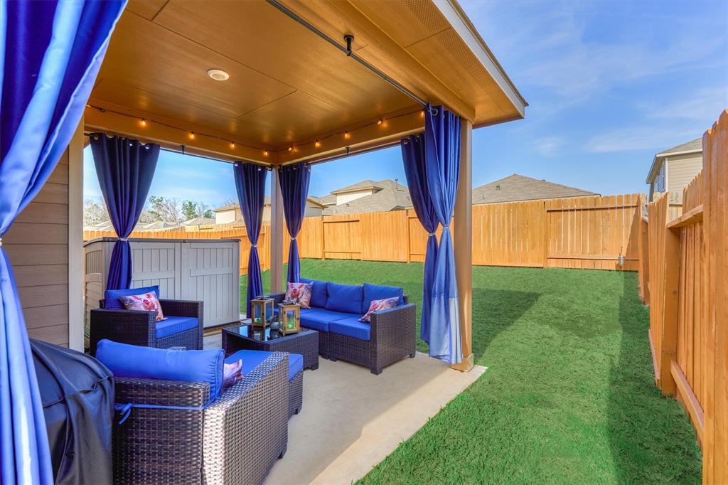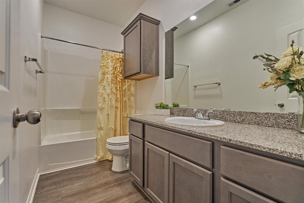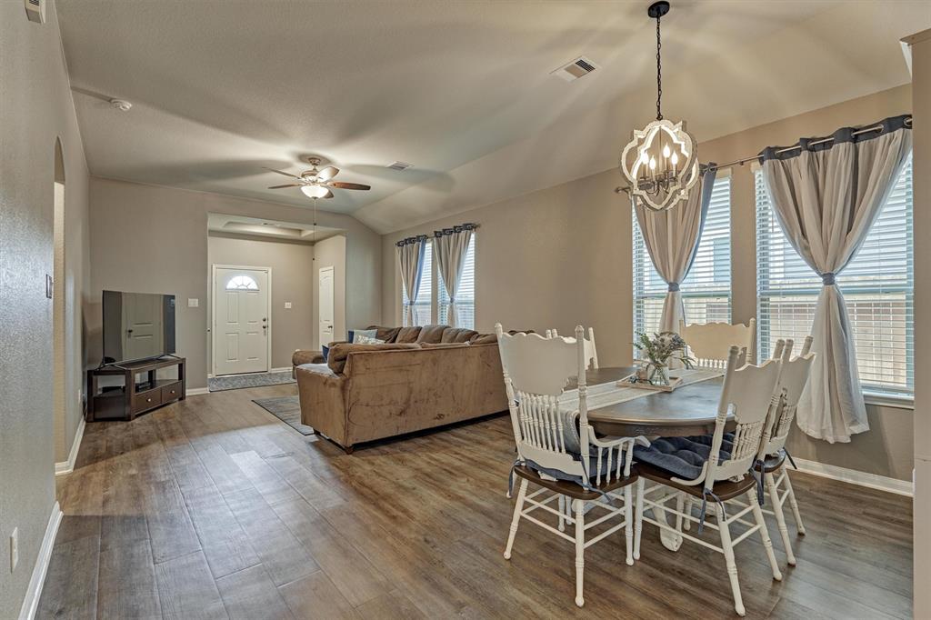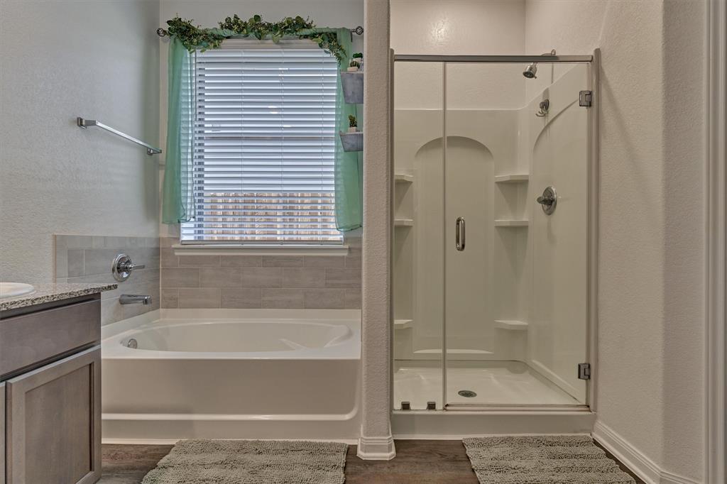 Welcome to this wonderful 3 bedroom, 2 bath home in the new Caney Mills community in Conroe! This impressive home has been immaculately cared for & upgraded with lots of added extras! Whole home water filtration system, Modern hardwood look flooring, neutral paint & high vaulted ceilings. The open concept living area offers a wall of windows allowing lots of natural light into the home, all with blinds and drapes.The split floor plan offers a primary suite located to the rear of the home, away form the additional 2 bedrooms.The large primary en-suite has a large en suite bathroom with dual vanity areas, soaker tub and glass shower. Enjoy the views to the backyard.Large closets & spacious laundry room!The gorgeous modern kitchen with granite counters is spacious & has a large breakfast bar & walk in pantry! Fridge Stays!Large backyard has an extended patio, perfect for entertaining! A generous 2 car garage offers overhead storage racks! Quick access to I-45, Great for commuters!