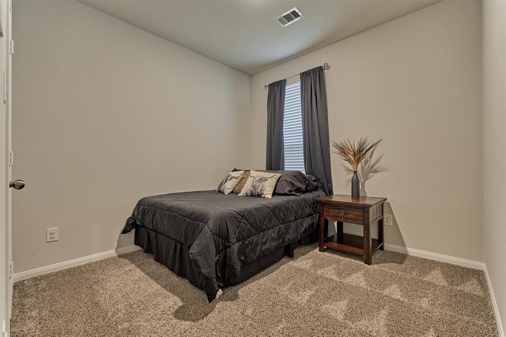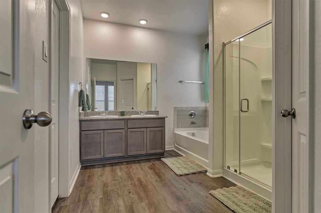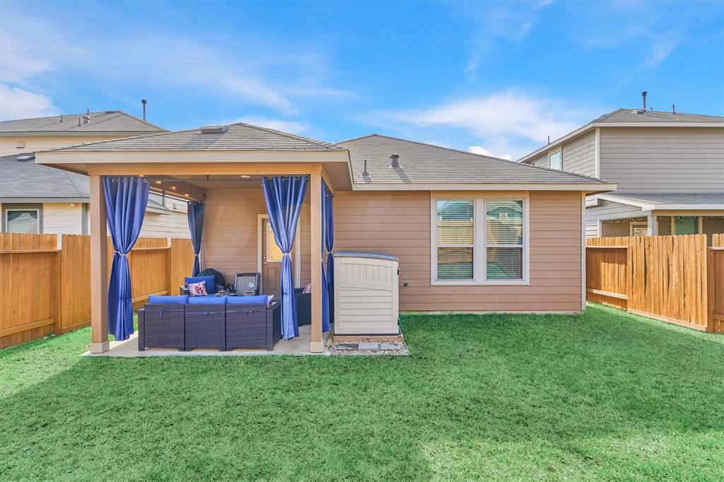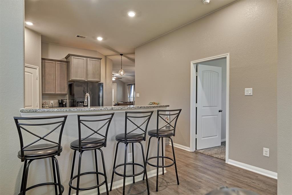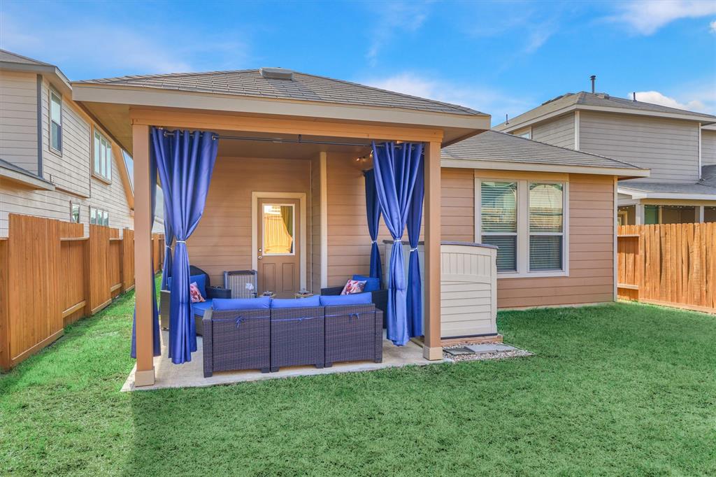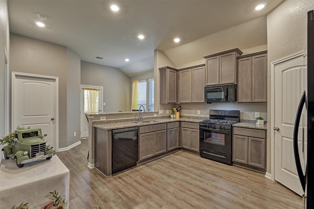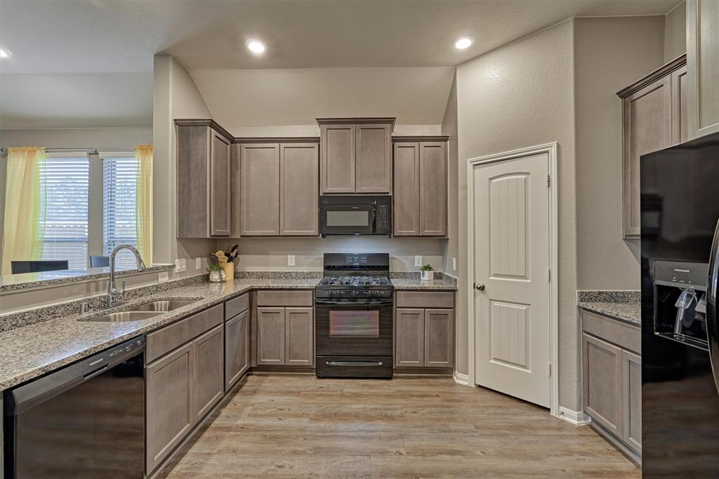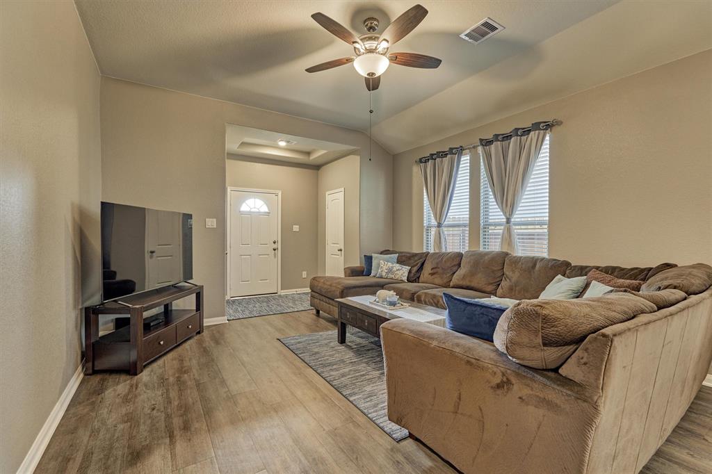 Welcome to this wonderful 3 bedroom, 2 bath home in the new Caney Mills community in Conroe! This impressive home has been immaculately cared for & upgraded with lots of added extras! Whole home water filtration system, Modern hardwood look flooring, neutral paint & high vaulted ceilings. The open concept living area offers a wall of windows allowing lots of natural light into the home, all with blinds and drapes.The split floor plan offers a primary suite located to the rear of the home, away form the additional 2 bedrooms.The large primary en-suite has a large en suite bathroom with dual vanity areas, soaker tub and glass shower. Enjoy the views to the backyard.Large closets & spacious laundry room!The gorgeous modern kitchen with granite counters is spacious & has a large breakfast bar & walk in pantry! Fridge Stays!Large backyard has an extended patio, perfect for entertaining! A generous 2 car garage offers overhead storage racks! Quick access to I-45, Great for commuters!