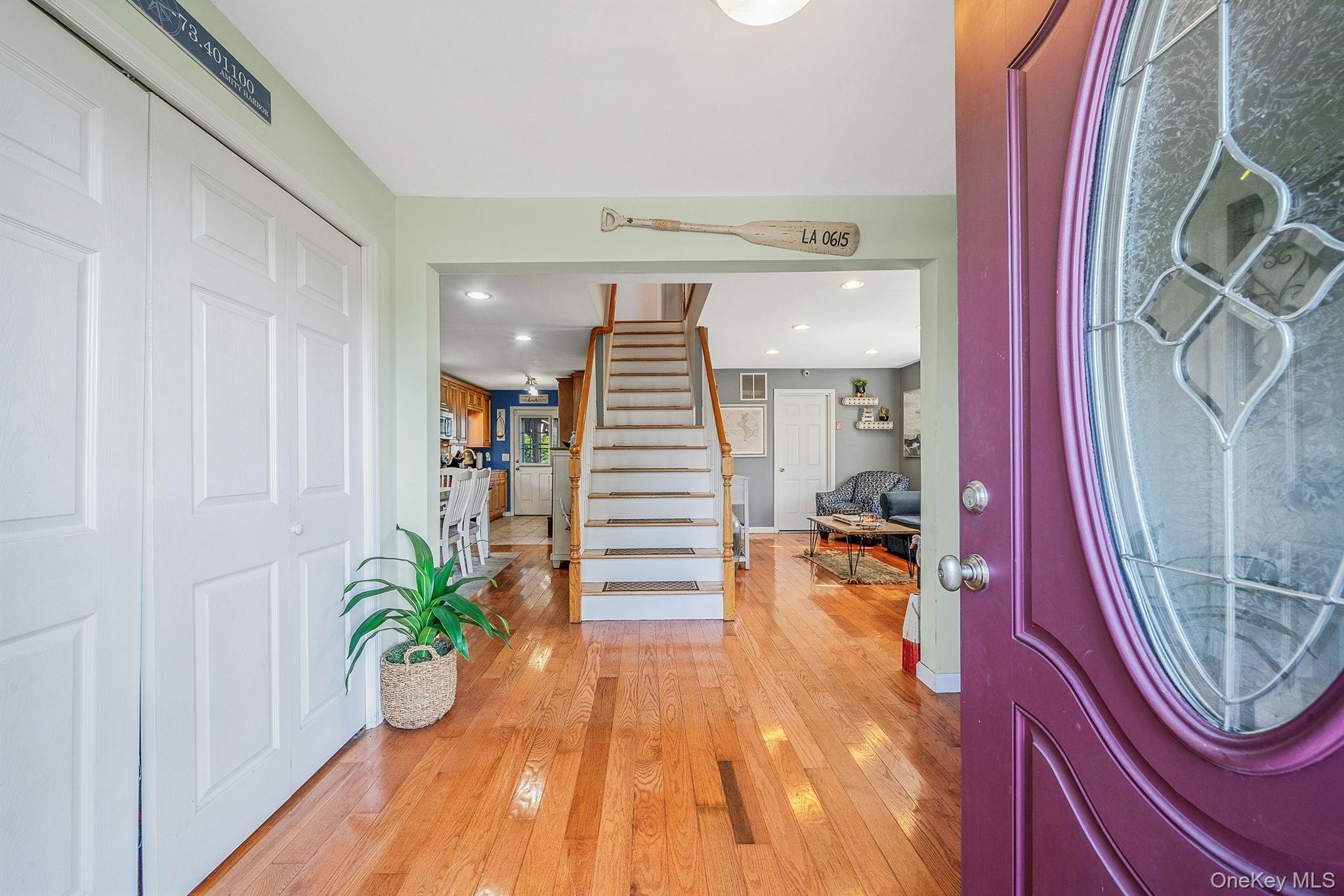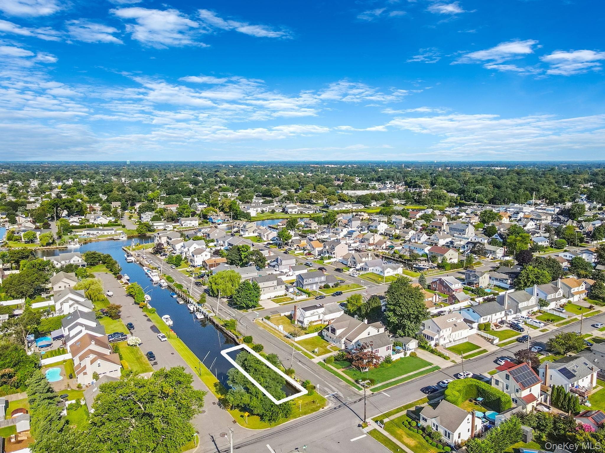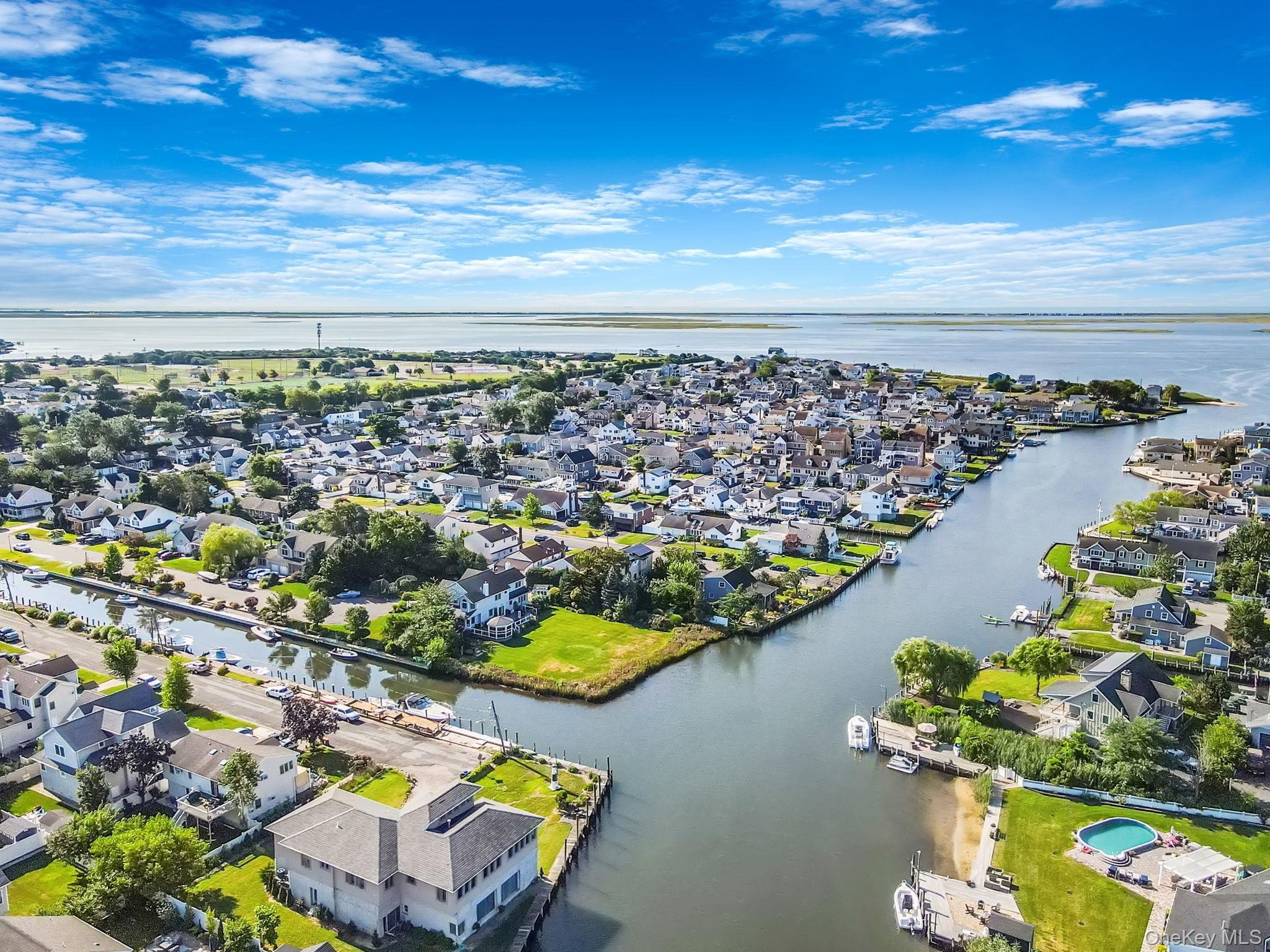 Enjoy spectacular sunsets from this beautifully maintained corner home located in the desirable Amity Harbor community. This private retreat offers both comfort and convenience, with updates throughout and waterfront access. Step into a welcoming entryway with generous closet space, setting the tone for a well-designed interior. To the right, you'll find a sun-drenched living room with large windows that fill the space with natural light. To the left, a recently renovated eat-in kitchen awaits. It is complete with modern finishes and direct access to your very own backyard oasis, with endless summer breezes coming off your private dock on the canal. The fully fenced backyard is perfect for entertaining or unwinding, featuring a covered gazebo, and expansive lounge areas. In-ground sprinklers ensure the landscape stays lush and green all season long. Hot tub is a gift. This home offers three spacious, carpeted bedrooms all with ceiling fans and ample closet space. The primary suite includes a vaulted ceiling, faux fireplace, large walk-in closet, and scenic views of your deeded 40-foot dock, located just across the street. Additional highlights include hardwood floors, two zone central air with an "on demand" hot water heater. The attic has pull-down stairs, a video security system, and driveway with French drain. The 1.5 detached garage has electricity. The 40-foot bulkhead is across the street and it's deeded separately. Don't miss your chance to own this exceptional home in a prime waterfront location in Amity Harbor.