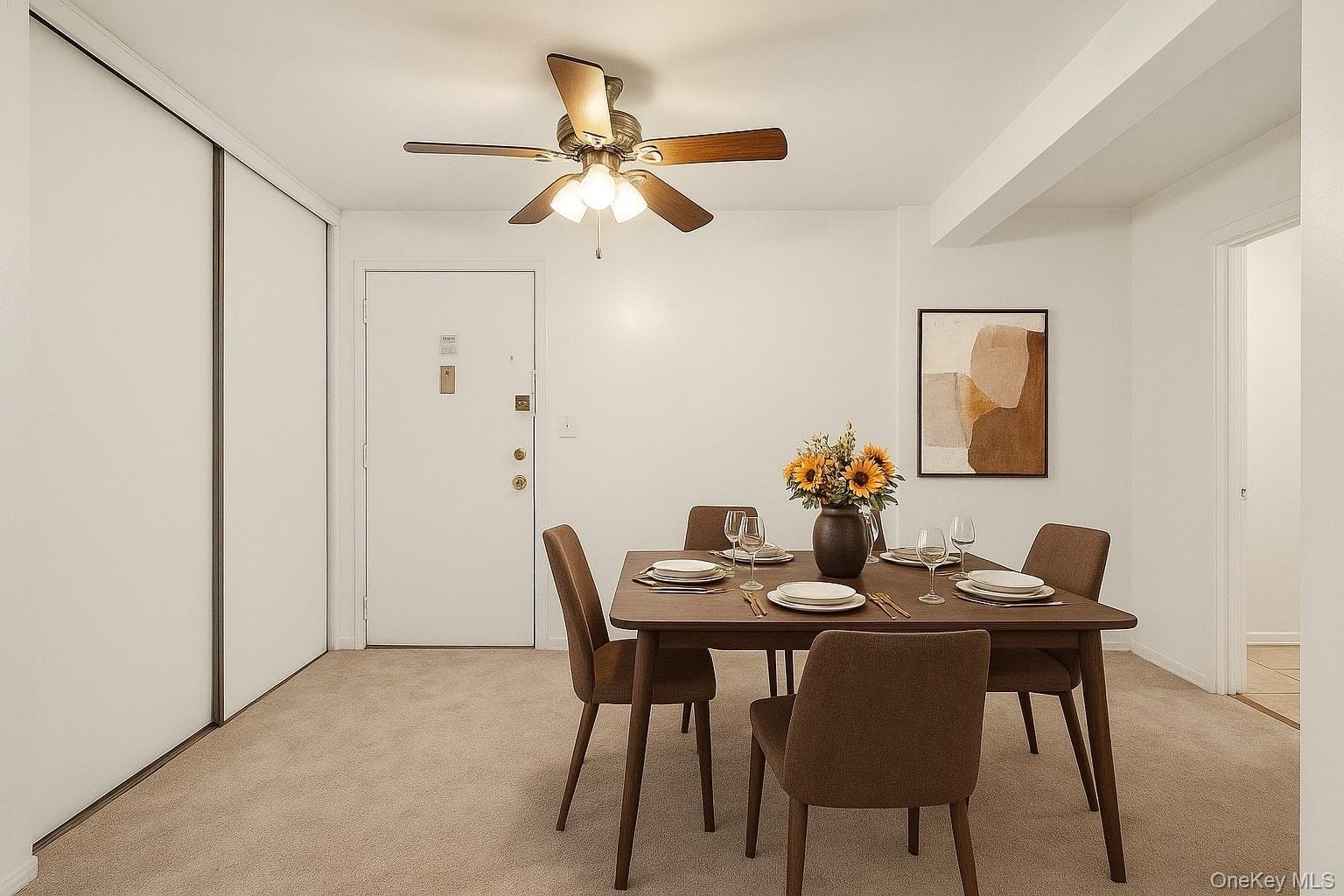 Step into a welcoming entry foyer that easily doubles as a dining area, leading into a generously sized living room and kitchen. To the left, you’ll find a full bath and an oversized bedroom. Classic oak hardwood floors rest beneath the carpeting, with abundant closet space throughout.
