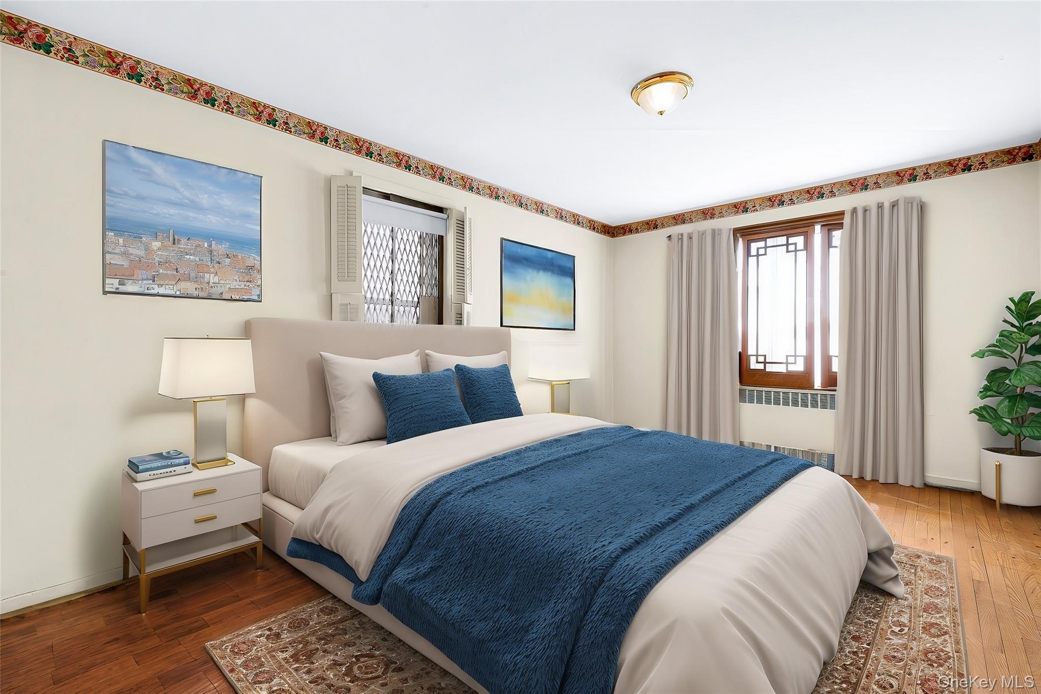 This converted three-bedroom home features an ideal layout, filled with natural light and stunning park views. The oversized foyer leads into a spacious living room, seamlessly extending to an enclosed terrace—perfect for enjoying the serene greenery. The windowed eat-in kitchen offers ample counter space, ready for your personal touch. A versatile bonus room off the foyer serves as a perfect home office or additional bedroom. Down a hallway lined with generous closet space, you’ll find two well-proportioned bedrooms. The large, windowed full bath features both a separate shower and soaking tub. Oak hardwood floors run throughout, offering classic charm with the opportunity to restore and customize to your taste.