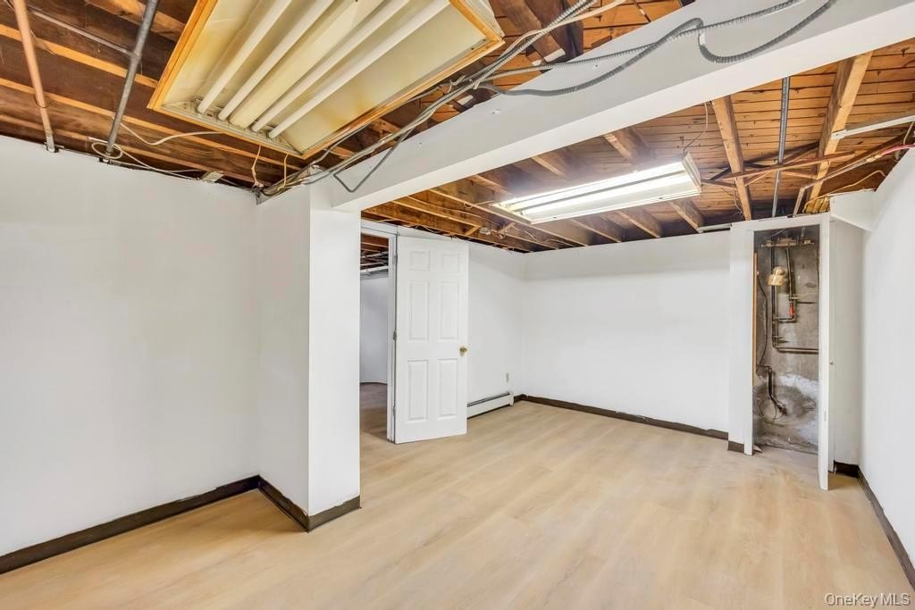 This charming single-story ranch home is a unique blend of classic architecture and cozy, cabin-inspired interiors. With a functional 4-bedroom layout and ample storage space, this property is perfect for those seeking comfort and character. The interior features beautiful wooden walls and ceilings throughout several rooms, creating a rustic and cozy atmosphere. A spacious Kitchen & Dining with a high-vaulted wooden ceiling with a ceiling fan in the kitchen area. In addition to the three bedrooms, the home includes dedicated office spaces featuring recessed lighting and baseboard heating. The home consists of a full bathroom with a vanity and tile-patterned floors, as well as a convenient half-bath with tiled walls. A large, fully finished basement with internal stairs provides significant potential for extra storage or future customization. A well-maintained front yard leads to a single-story home featuring a shingled roof and a prominent chimney. The property includes a side yard and a spacious, fenced-in backyard area with mature trees, offering plenty of privacy for outdoor activities. Close to all amenities. This property is the perfect canvas to make your own.