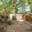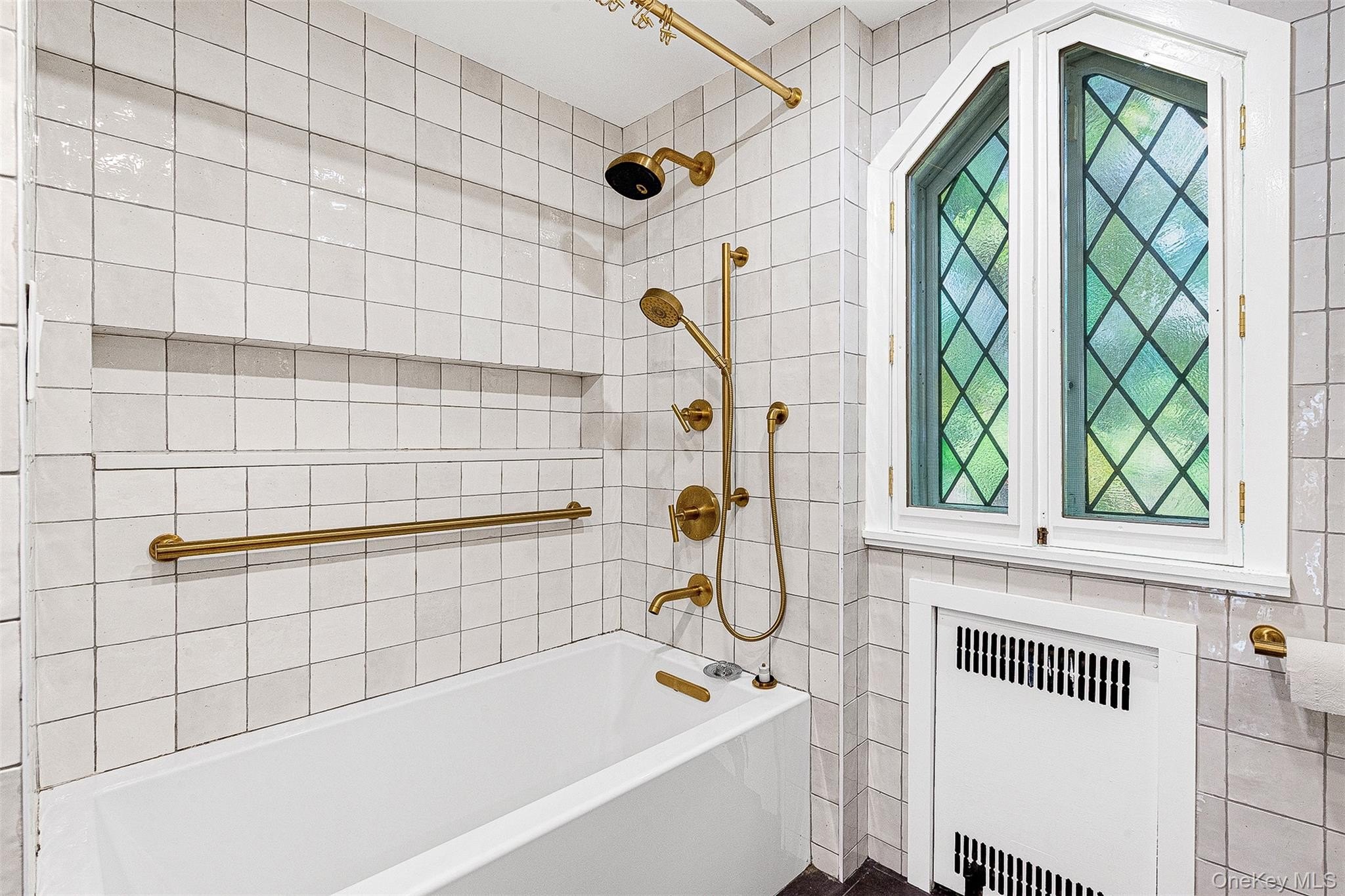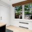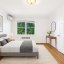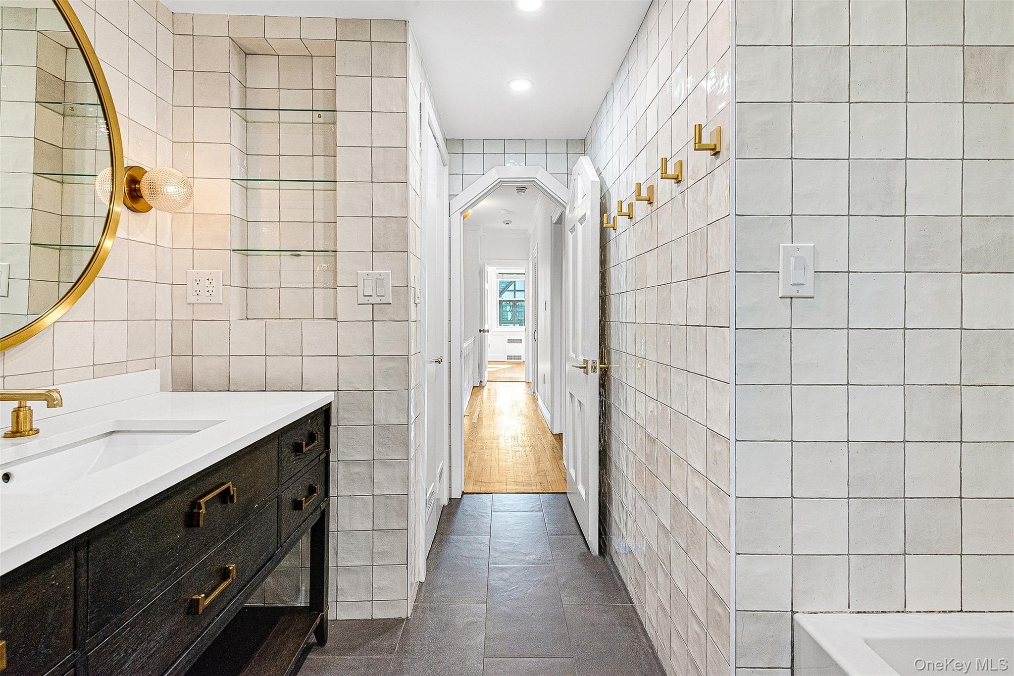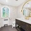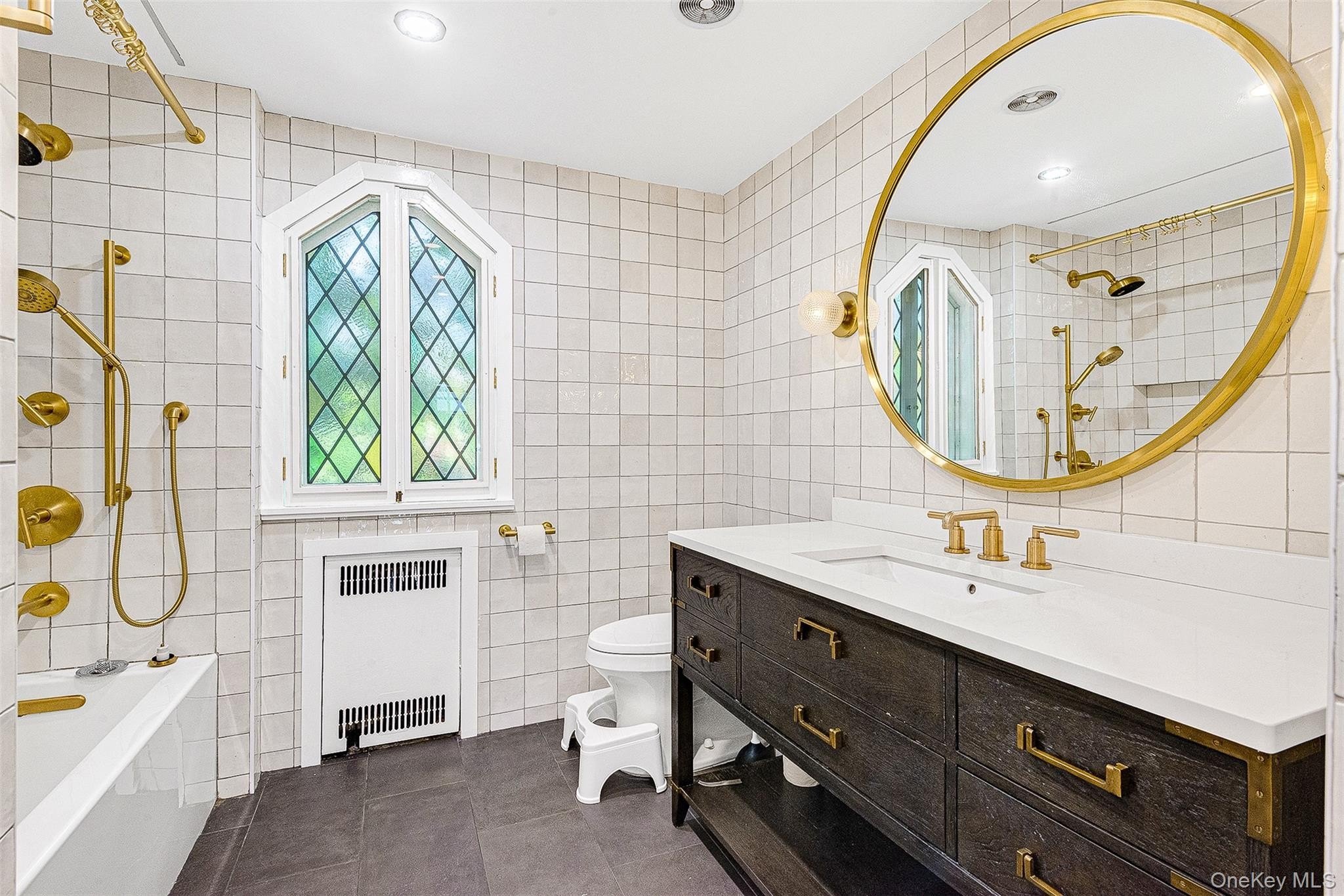 Upstairs, discover three spacious bedrooms, each offering an abundance of light and comfort. The beautifully renovated bathroom exudes spa-like sophistication, custom designed with Restoration Hardware finishes, with an arched diamond-pane window, sleek tiled walls, bold gold fixtures, and matte black flooring. A vanity with double drawers, round illuminated mirror, and a luxurious shower/tub combination elevate the experience. A discreetly tucked washer and dryer provide modern convenience.