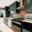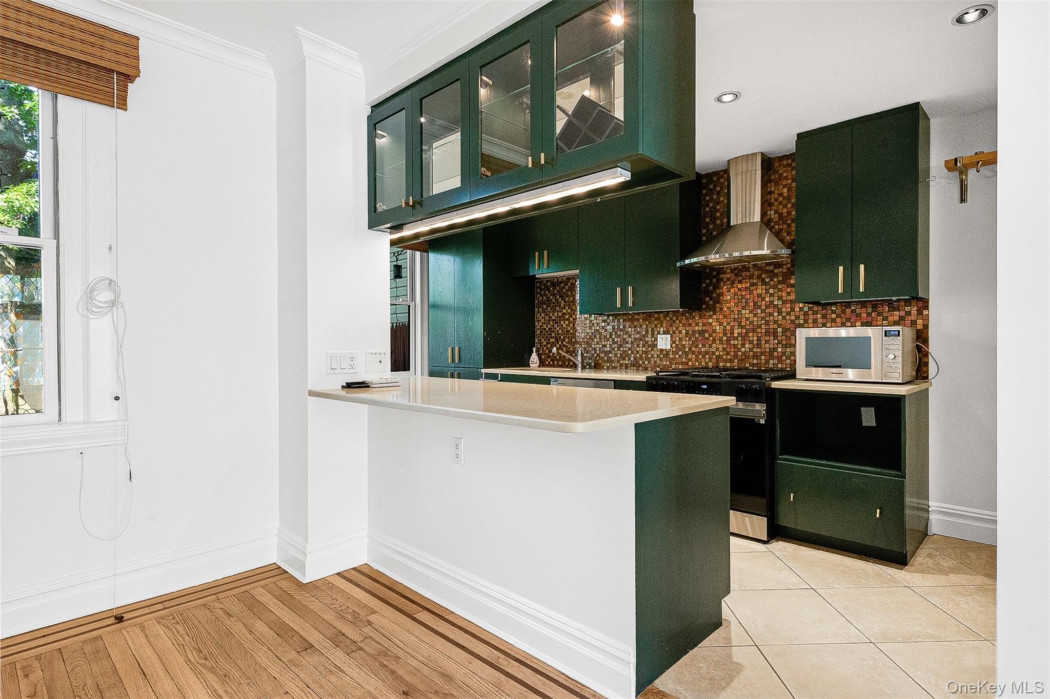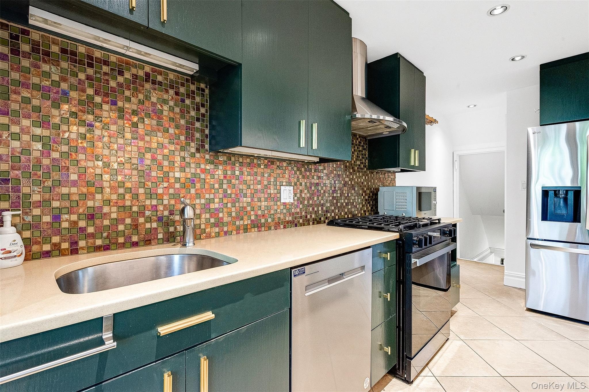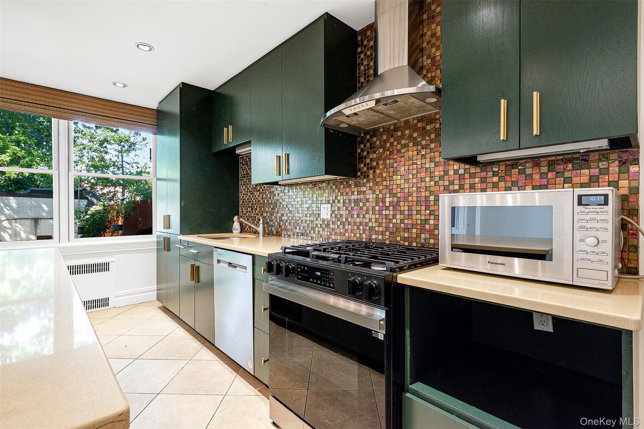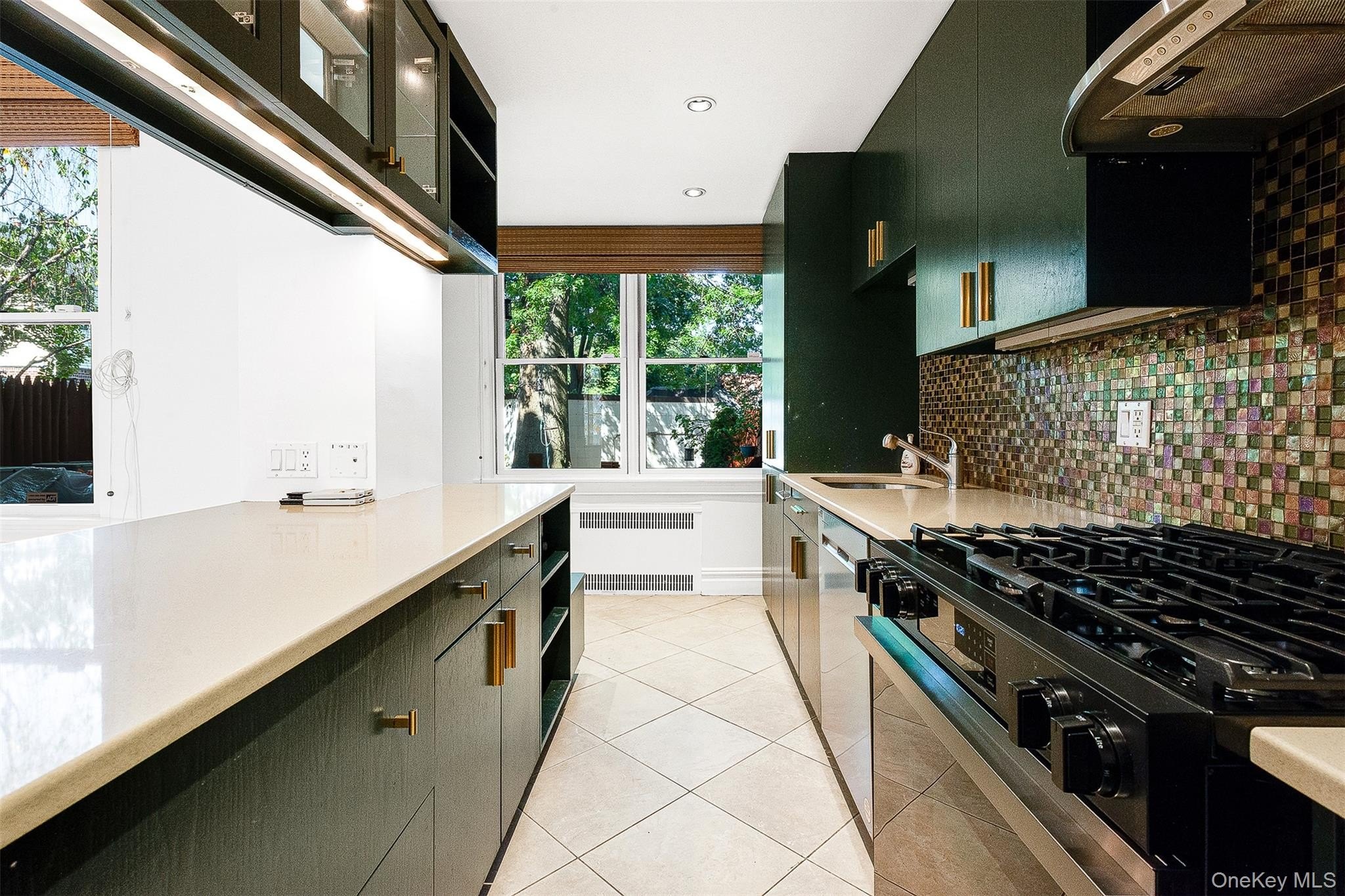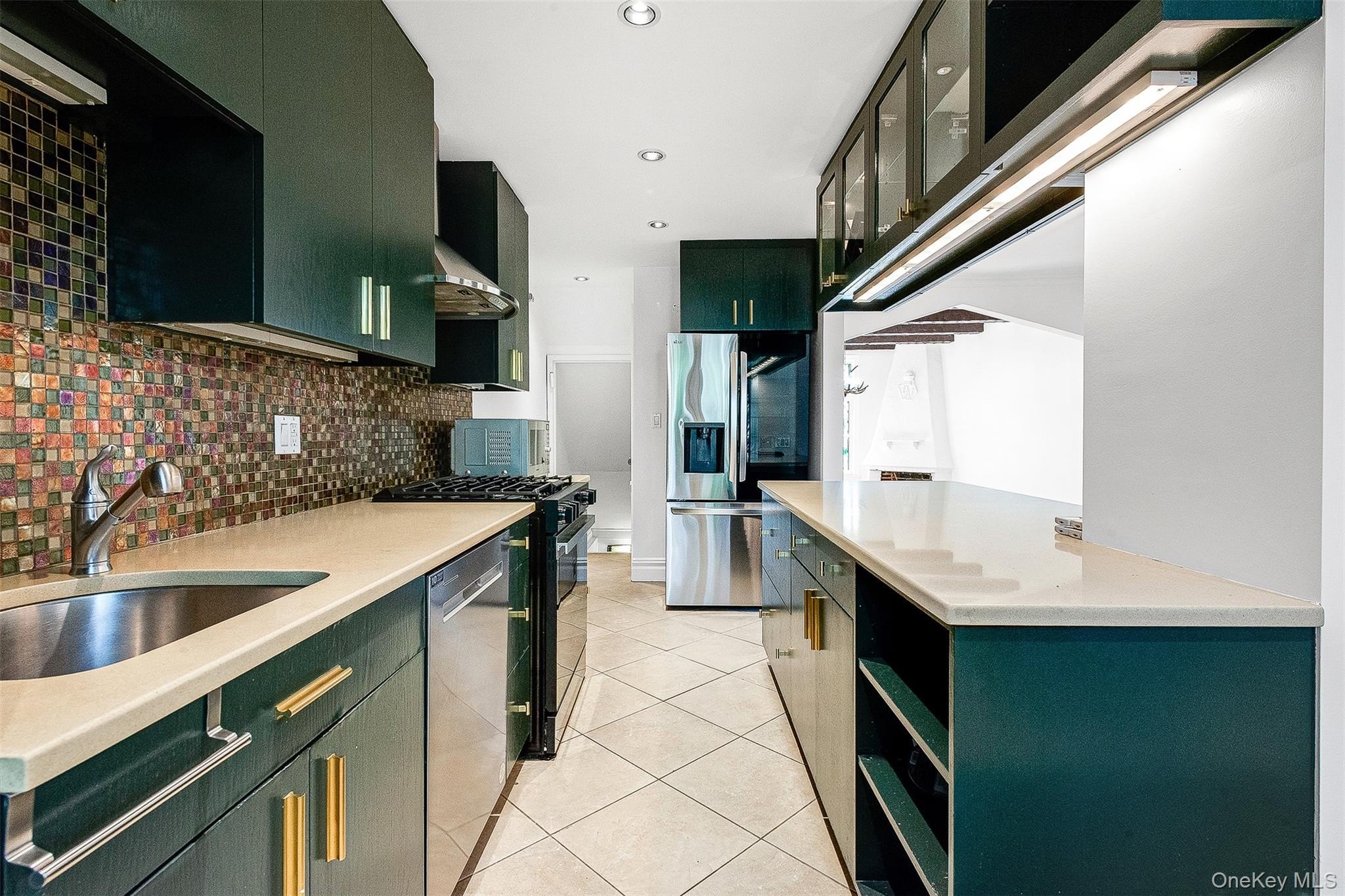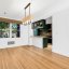 The chef’s kitchen is a true showpiece, where dark cabinetry with elegant brass hardware contrasts beautifully against a shimmering mosaic tile backsplash. Quartz countertops provide generous workspace, while high-end stainless steel appliances—including a gas range with vented hood, built-in dishwasher, and premium Panasonic microwave—make everyday cooking a delight. Oversized windows flood the room with natural light, and direct access to the private backyard and detached garage make entertaining indoors and out a breeze. A stylish powder room completes the first level.