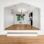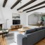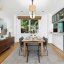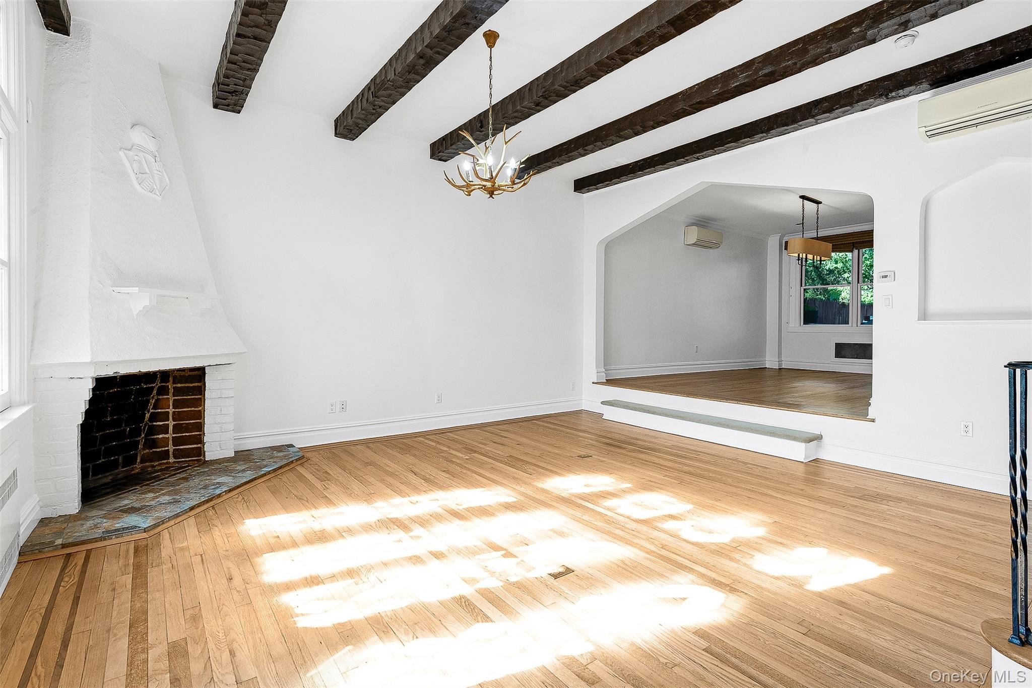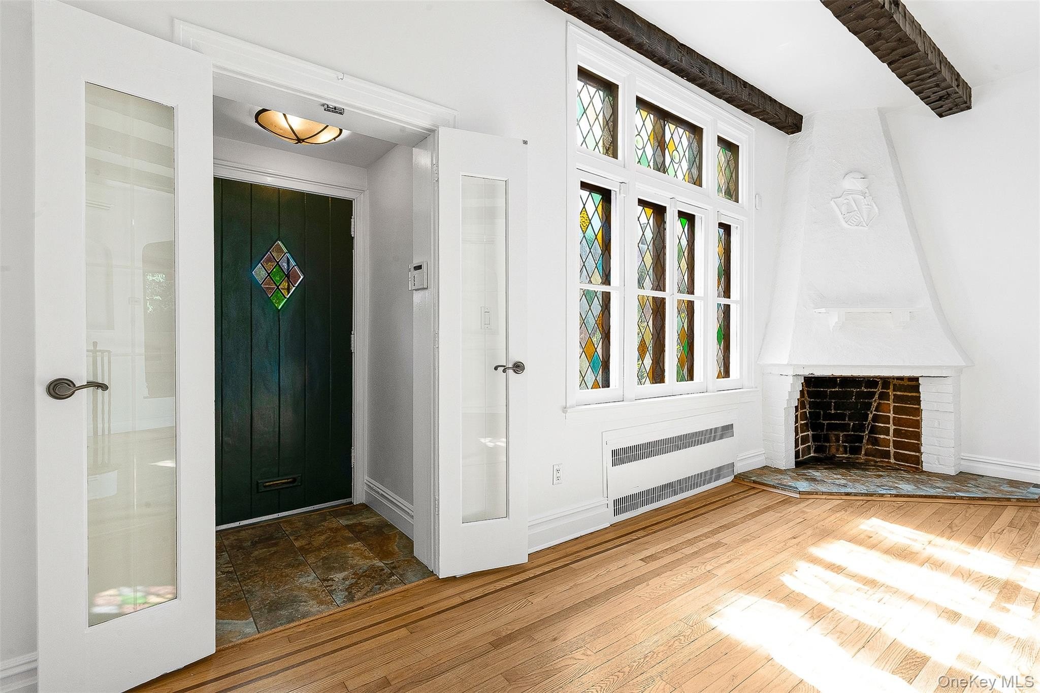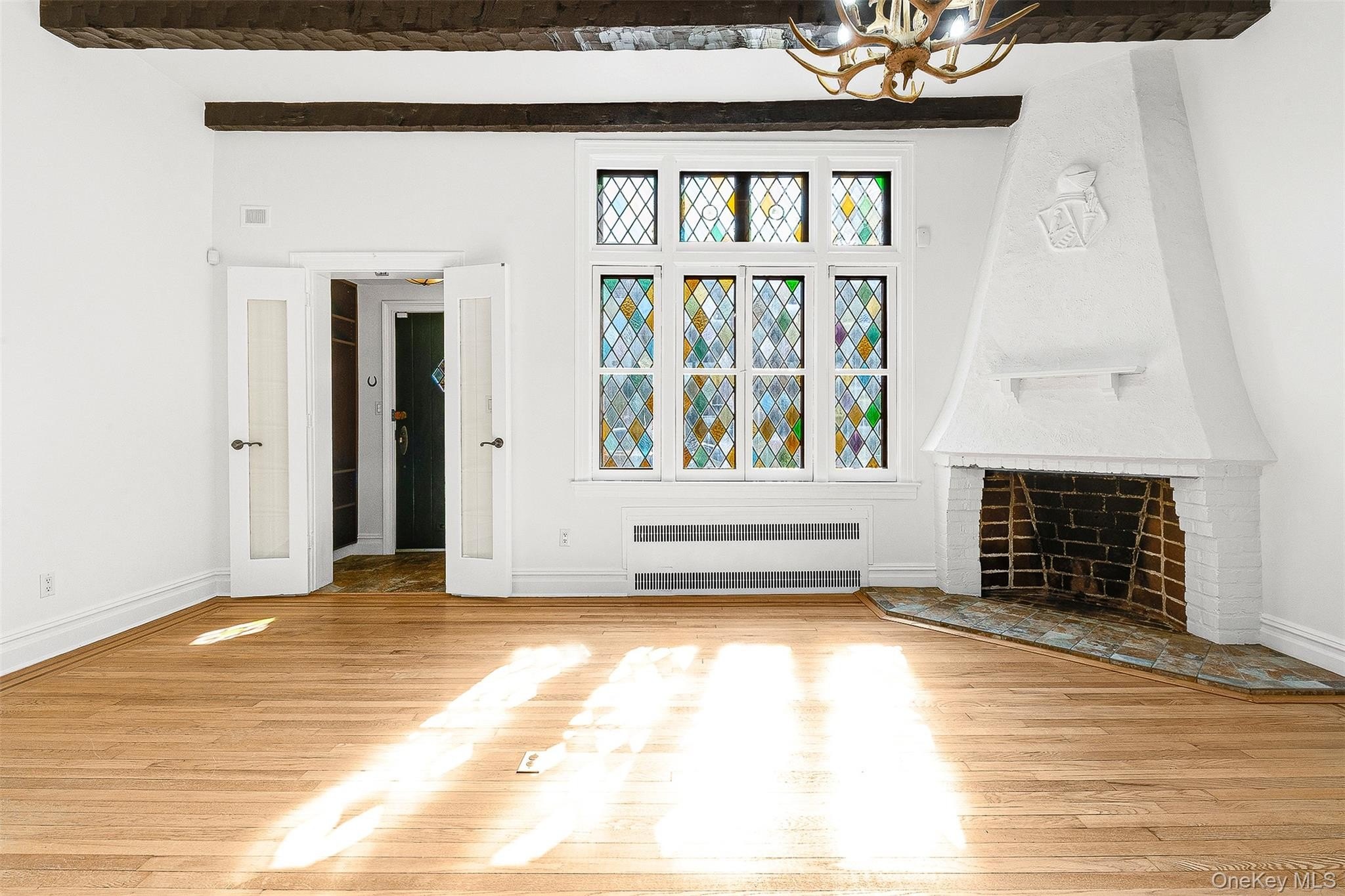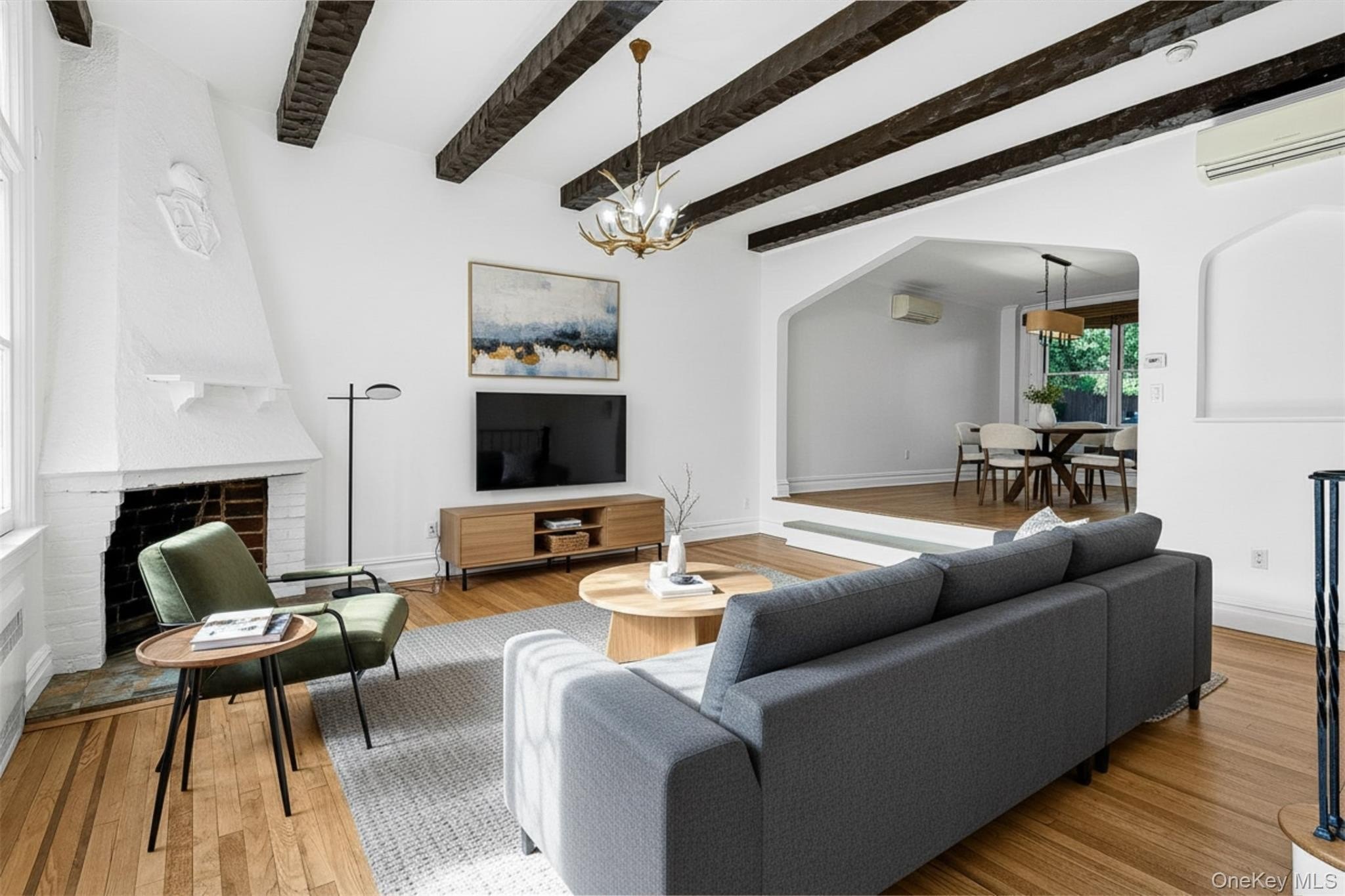 The gracious living room captivates with dramatic exposed wood beams, a striking white stucco fireplace adorned with a decorative crest, and gleaming oak hardwood floors. Sunlight streams through original diamond-pane stained glass windows, creating a warm, enchanting ambiance. An arched entryway flows seamlessly into the elevated formal dining room, where oversized windows frame lush greenery, and a chic chandelier casts a touch of modern glamour. Perfect for hosting, this refined space connects effortlessly to the kitchen through a convenient pass-through design.