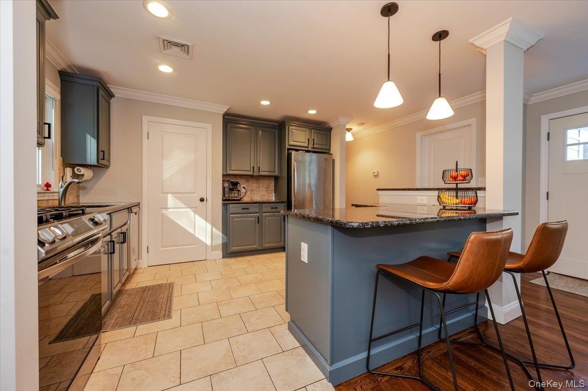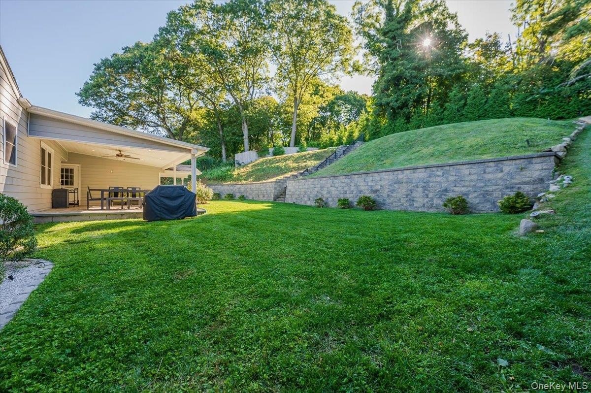 Impeccable mid-century ranch in Huntington’s desirable Hillbrae section. Set on a private, landscaped .43-acre property, this 3-bedroom, 2-bath home blends timeless design with modern comfort. The open layout features Andersen windows, hardwood floors, moldings, and a stacked-stone wood-burning fireplace. The open eat-in kitchen includes granite counters, stainless steel appliances, and natural gas cooking. The large island opens to the living and dining areas, overlooking the patios and yard. The primary en-suite bedroom includes hardwood floors and a full tiled bath. Enjoy outdoor al fresco meals on the protected bluestone patios that overlook the private and welcoming yard. A set of stone stairs lead to an additional, elevated flat and fabulous yard, perfect for sports, lounging or a pool.